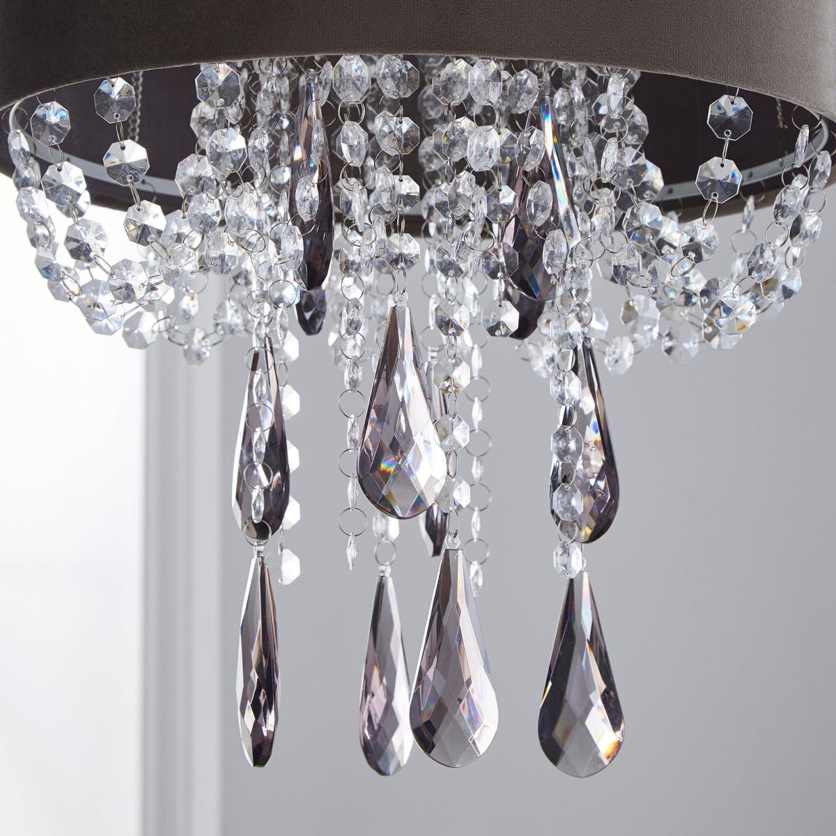 This grey velvet shade features a beautiful cascading acrylic drop design with a clear smoke finish and will connect easily to existing lamp holders. Easy Fit pendants are ideal for a quick style change without needing an electrician. Simply assemble on to your existing ceiling fitting, and you’re good to go within minutes! Don’t forget to choose the correct bulb for your ceiling fitting.