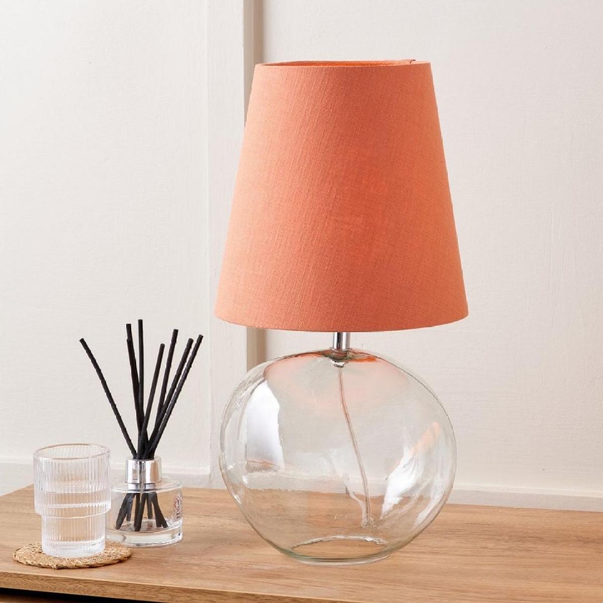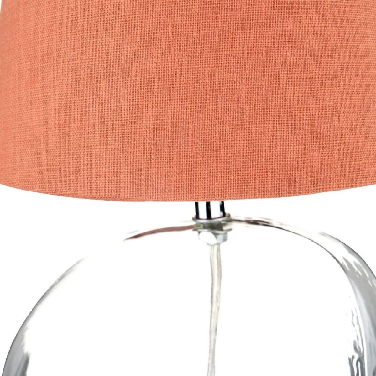 Hallie 1-light table lamp, featuring an organically-shaped glass base and a terracotta orange tapered shade. A perfect blend of modern elegance and organic charm, this lamp features an artistically crafted, uniquely shaped glass base that adds a touch of fluidity and sophistication to any room. Its smooth curves, dimples and transparency make it a versatile piece that complements various decor styles, from contemporary to country. Topping off this exquisite base is a terracotta linen mix tapered shade, bringing a warm and earthy tone to your interior. The shade not only provides a cosy and inviting glow but also adds a pop of color, making the Hallie table lamp a striking statement piece in your living room, bedroom or office. Whether you're reading, working or simply relaxing, the Hallie table lamp offers the perfect blend of style and function. Hallie 1-light table lamp, featuring an organically-shaped glass base and a terracotta orange tapered shade. A perfect blend of modern elegance and organic charm, this lamp features an artistically crafted, uniquely shaped glass base that adds a touch of fluidity and sophistication to any room. Its smooth curves, dimples and transparency make it a versatile piece that complements various decor styles, from contemporary to country. Topping off this exquisite base is a terracotta linen mix tapered shade, bringing a warm and earthy tone to your interior. The shade not only provides a cosy and inviting glow but also adds a pop of color, making the Hallie table lamp a striking statement piece in your living room, bedroom or office. Whether you're reading, working or simply relaxing, the Hallie table lamp offers the perfect blend of style and function.