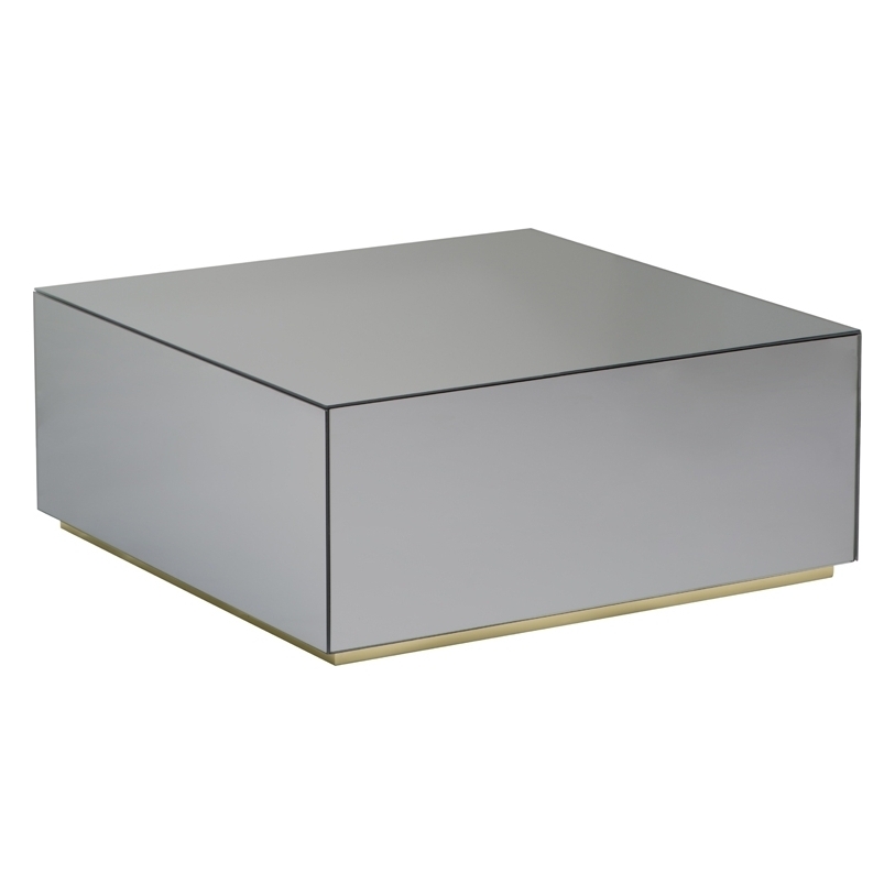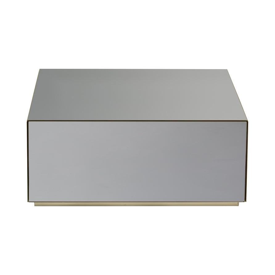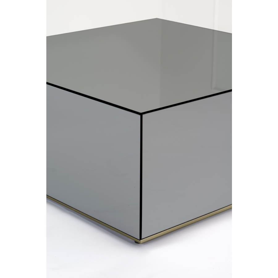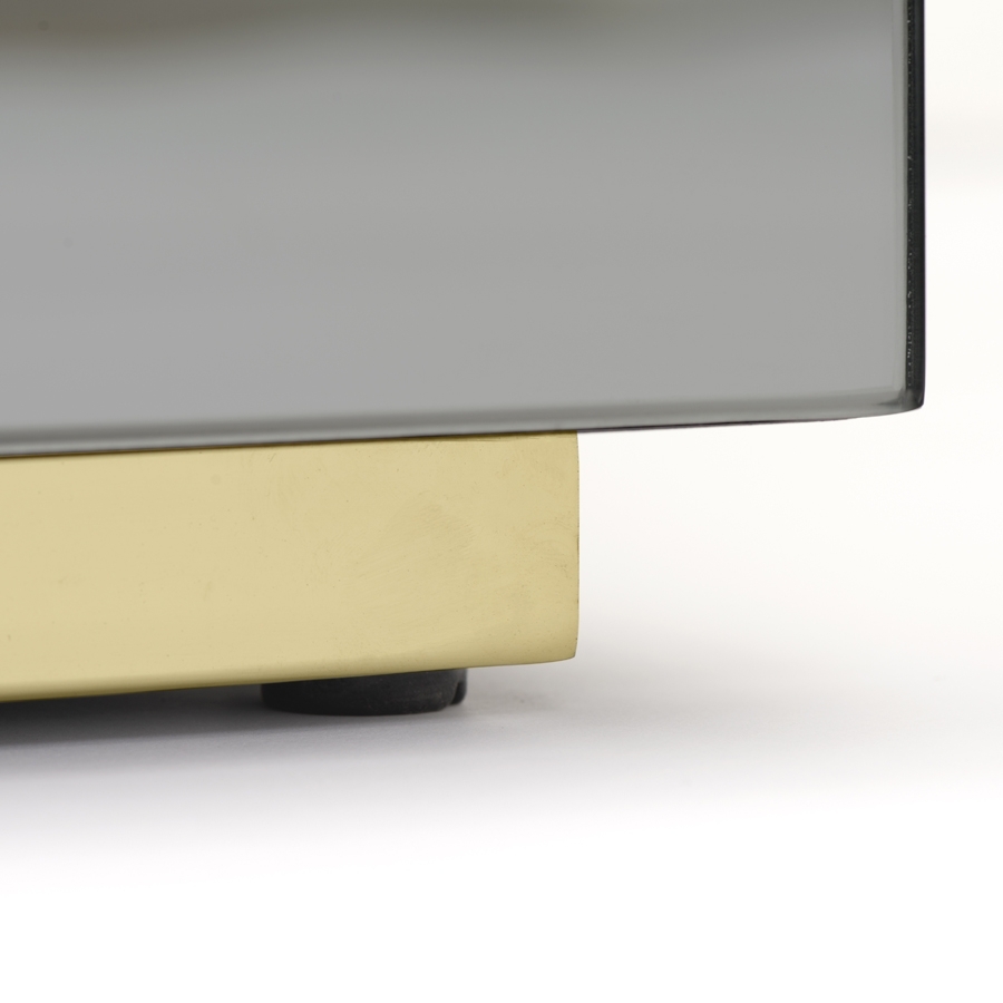 Timeless and elegant, this graceful table will co-ordinate with any style interior. Extremely strong toughened mirror with smoked grey tint. Stainless steel plinth with brass finish.