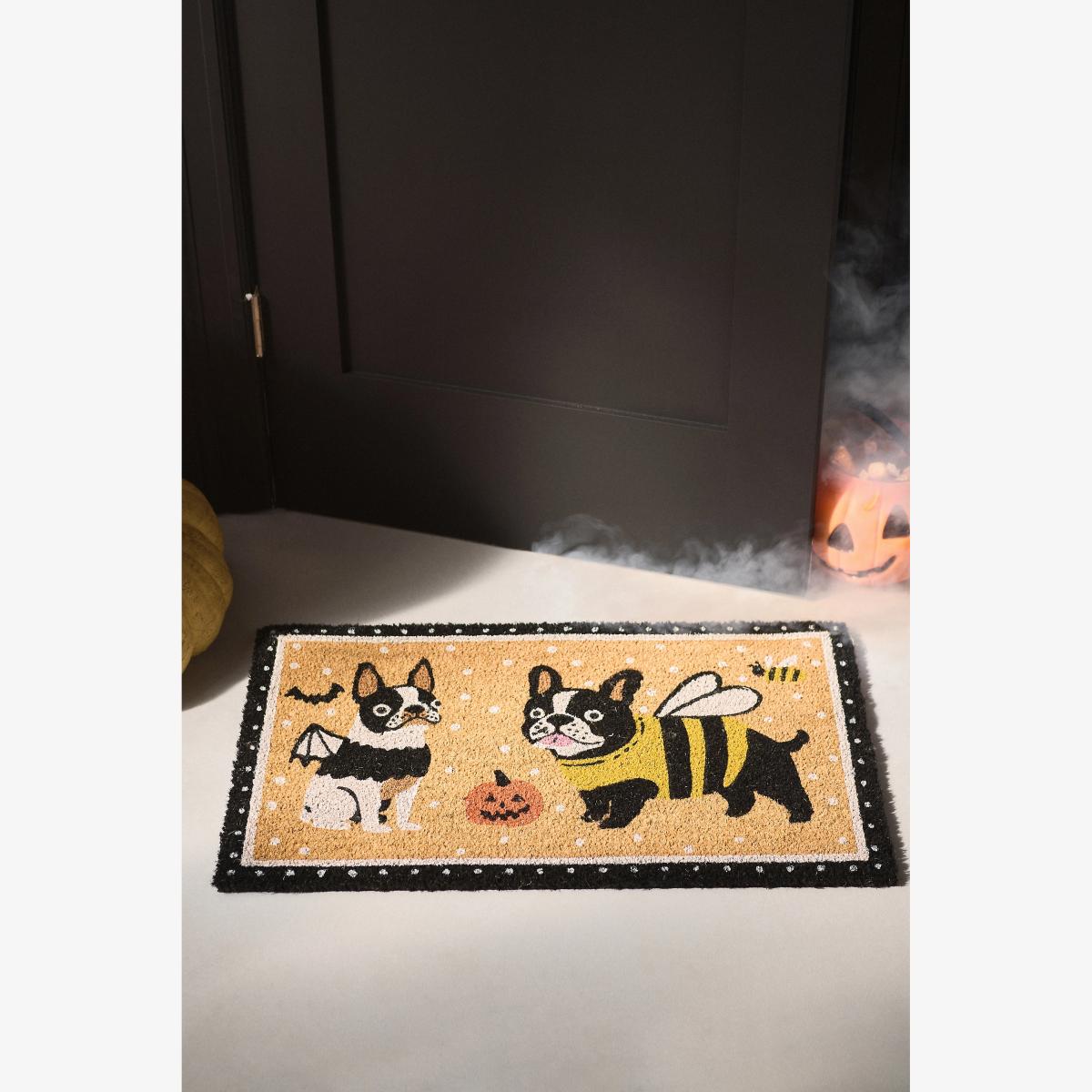 Get the most out of (g)hosting this spooky season with our 2025 collection of Halloween décor. Two little Frenchies dressed up in their Halloween costumes adorn this doormat. Crafted from natural coconut fiber, it provides a durable spot to wipe off debris and moisture from outside, as well as a finishing touch for your entryway. * 100% Coir * Intended for use in a sheltered outdoor area * Sweep clean * Imported