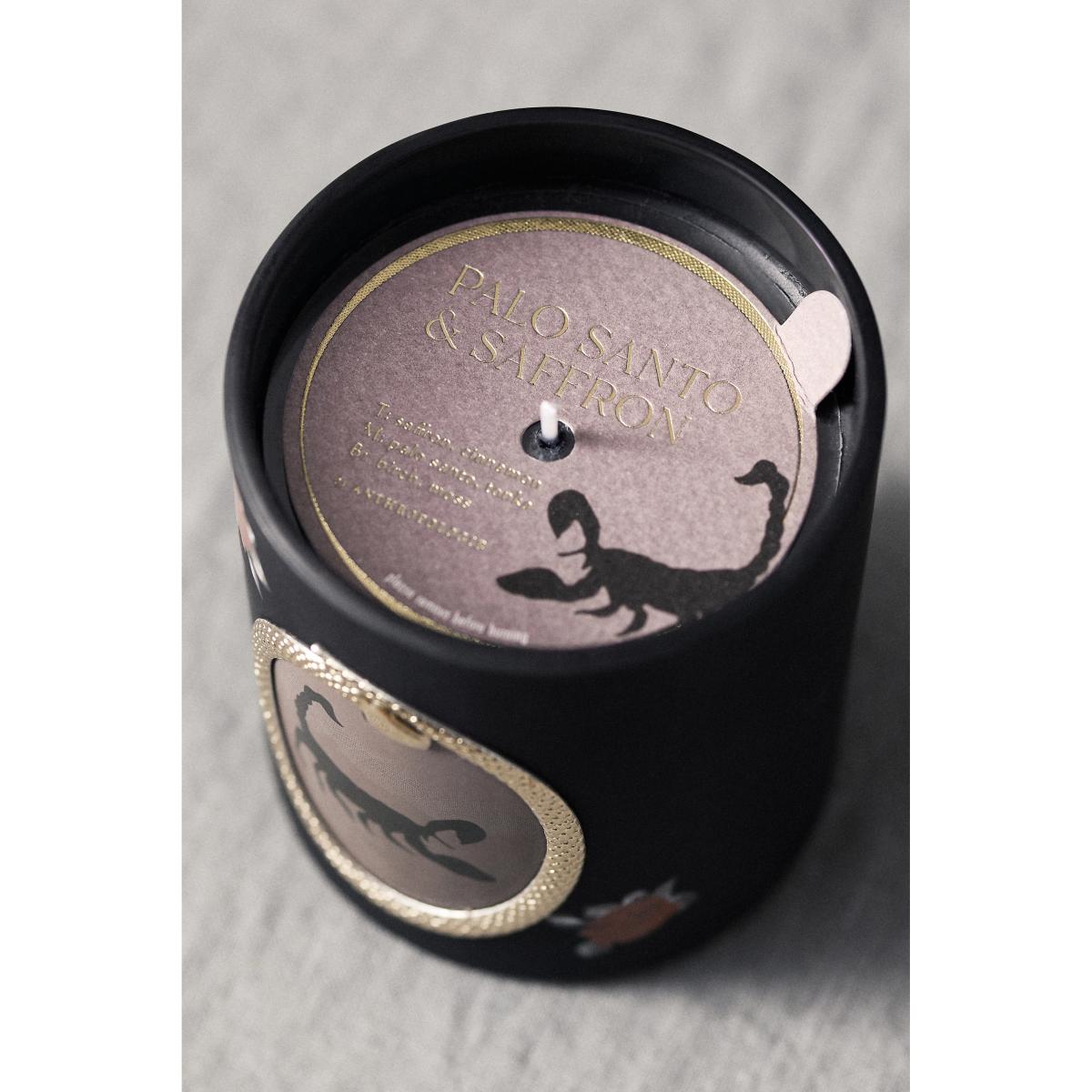 A deeply hued coconut wax blend rests within a glass vessel, cloaked in an ornate design. **Palo Santo & Saffron (Woody):** Rich saffron and cinnamon spice flicker with notes of warm Tonka bean and birchwood. *For the best burn experience, keep the following in mind:* * The first time you light your candle, allow it to burn until the wax pool melts all the way to the edge; for a larger candle, this may take several hours. Wax has "memory," so if it is extinguished with a partial pool, that will prevent a full, even pool from forming in the future. * Trim your wick each time you light the candle, removing any "bloom" from the previous burn. We recommend lighting a wick that is 1/4-1/2" in length. * Ensure that your candle is placed on a heat-safe surface. * Do not allow wick trimmings, dust, or other materials to accumulate in the wax pool. * To ensure safety and longevity, be sure to check the bottom of your candle for additional instructions, including details on when to discontinue use. * 40-hour burn time * Coconut wax blend; cotton candle wick * Glass vessel * Imported