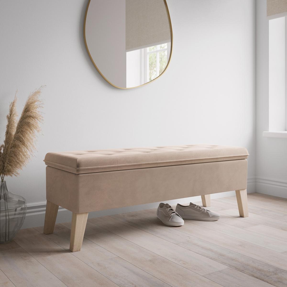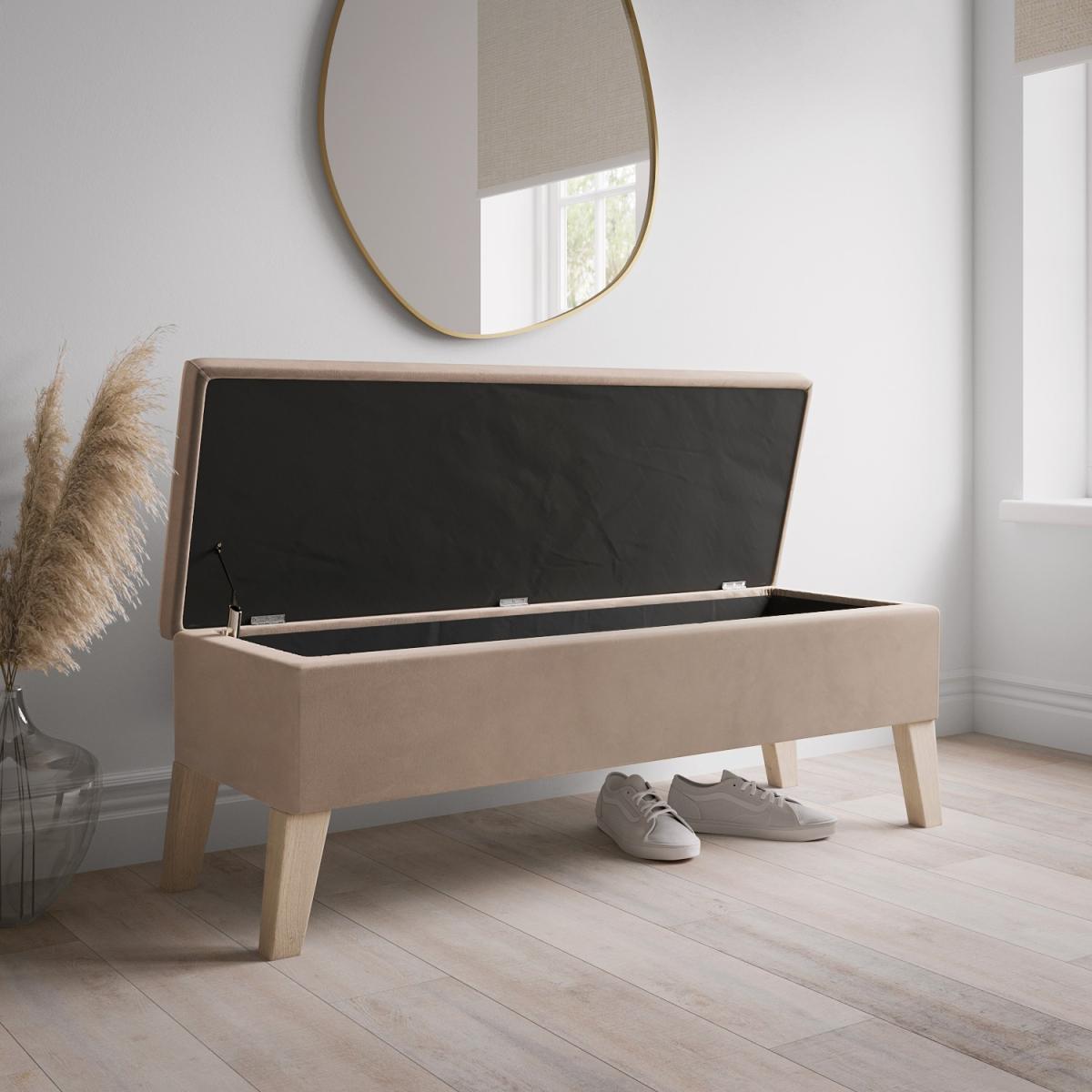 All about me Create an instant focal point in your living room or hallway with this ottoman storage bench, with a modern, classic design. Store spare blankets or throws and more discreetly inside, then use the top to sit on or rest your feet. There's even ample space beneath the keep your shoes. It would make a great window seat or perfectly placed in your hallway. Need to know Product dimensions:W131 x D46 x H48.5 cm Base to floor height: 20cm Inner storage dimensions:W113.5 x D32.5 x H20 cm Product weight: 15.5kg Maximum hold weight (on top): 150kg Colour: Grey Finish: Upholstered Material: Solid wood, metal, sponge (filling) and velvet fabric Assembly required:Yes, just the legs to attach
