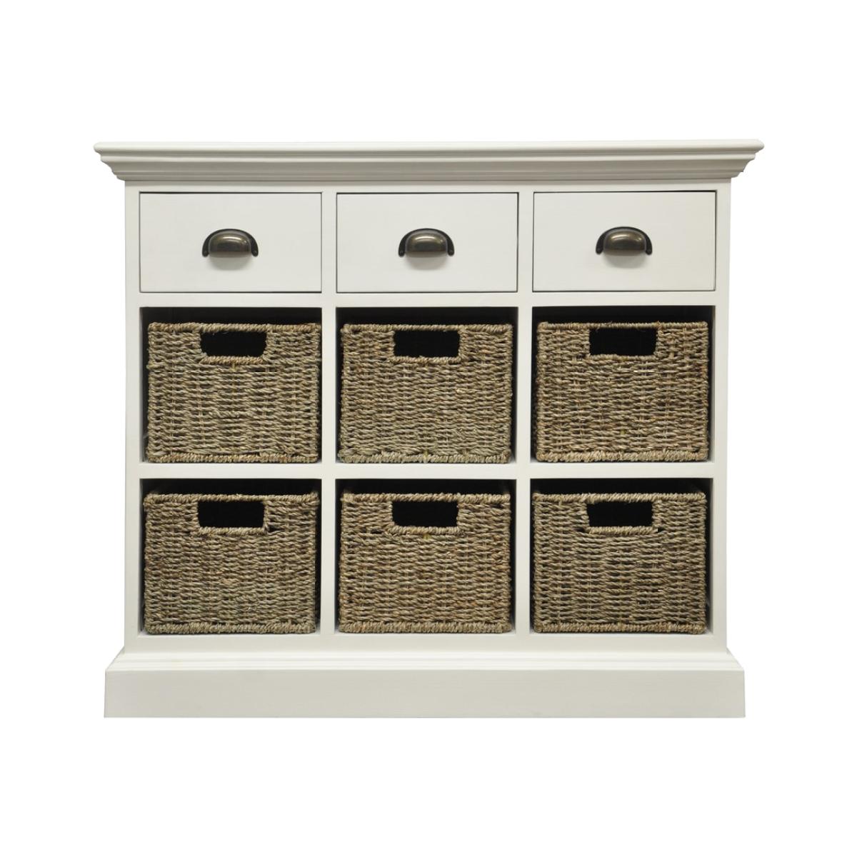 Dimensions W85cm x D35cm x H75cm Wicker basket dimensions. W22cm x D30cm x H17cm. The Wicker 3 drawer 6 basket unit with cotton linings is a great addition to any home. It has been painted in an antique white finish which gives it that country feel. Fitting 2 pairs of smaller shoes in the baskets but only one pair of larger shoes. Features. 3 drawer 6 basket sideboard unit. Great for storage Antique white painted finish. Wicker baskets and wooden frame Metal cup drawer handles. Country design. Arrives fully assembled..