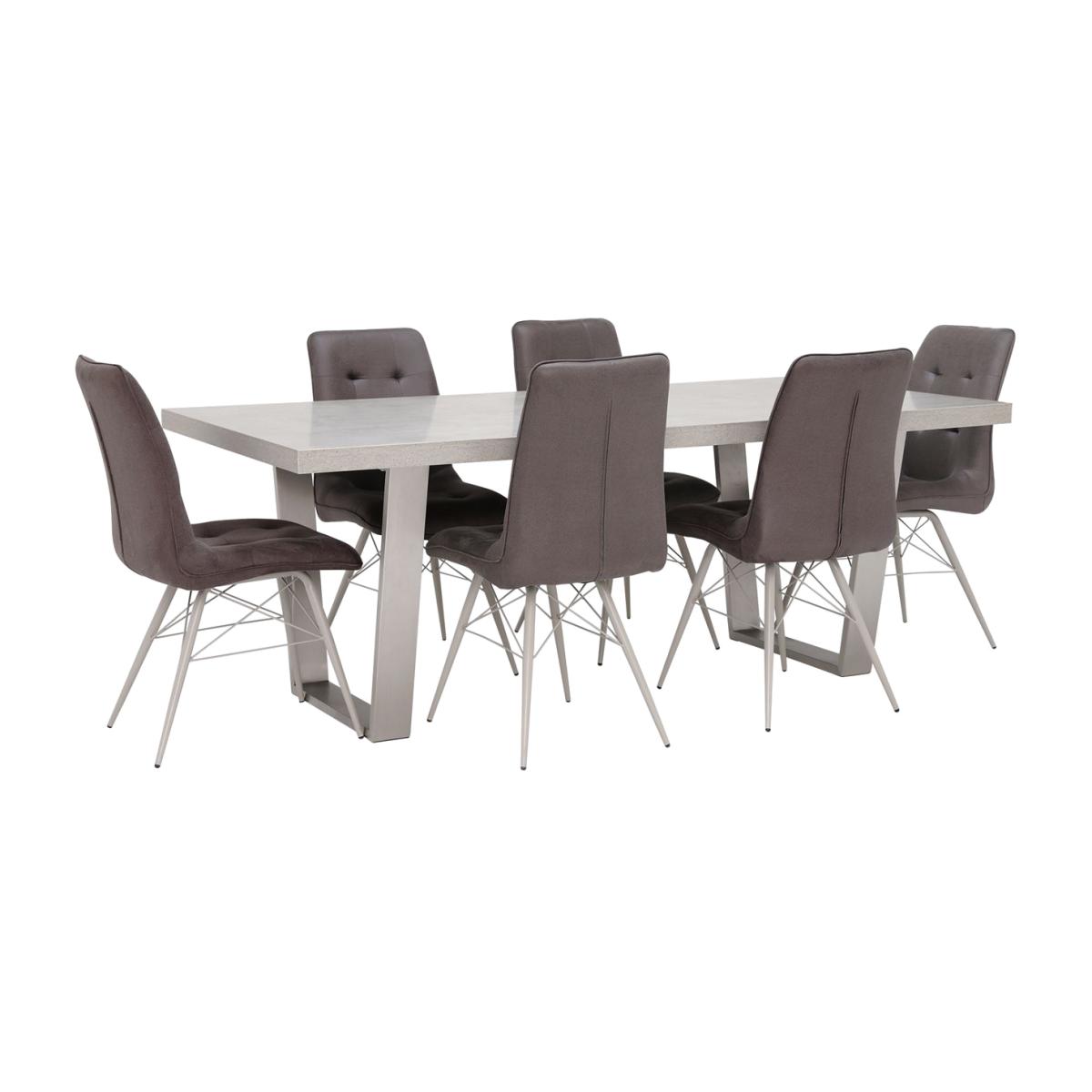 I love this set for its sleek, minimalist appeal - the grey concrete finish on the table brings a modern, industrial edge that works beautifully in contemporary or urban interiors. The six Hix chairs add comfort and a softer touch with their upholstered detailing, making the whole ensemble versatile enough for everything from casual family meals to more formal dinners. For styling tips, consider pairing it with a simple runner or placemats to soften the look, and add some greenery or statement lighting overhead for visual interest. This setup works particularly well in open-plan kitchens or dining rooms with a neutral colour palette, where its clean lines can really shine.