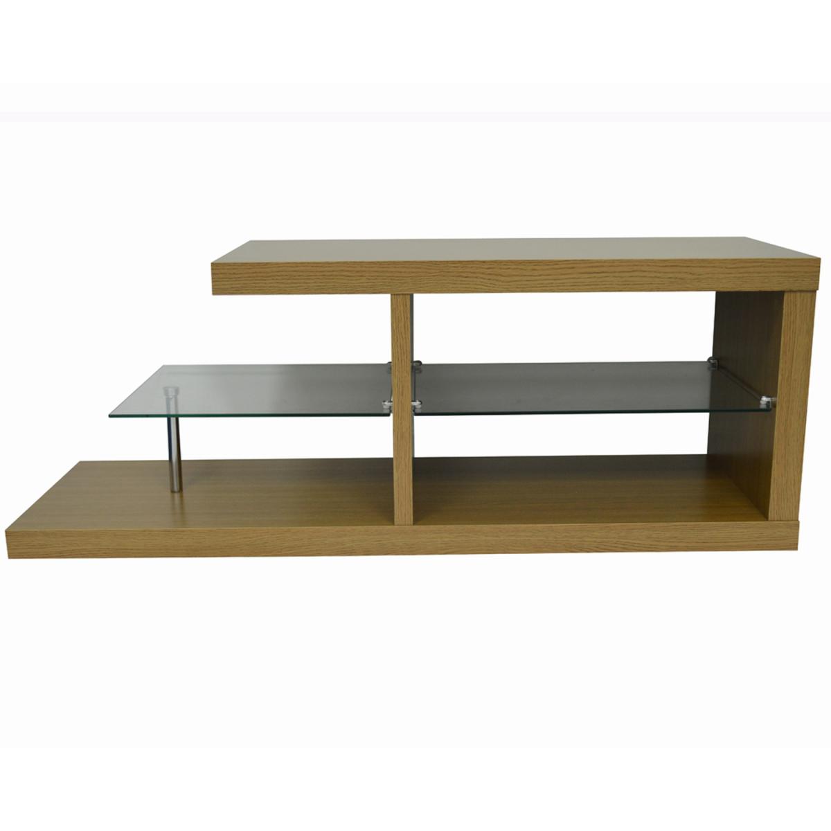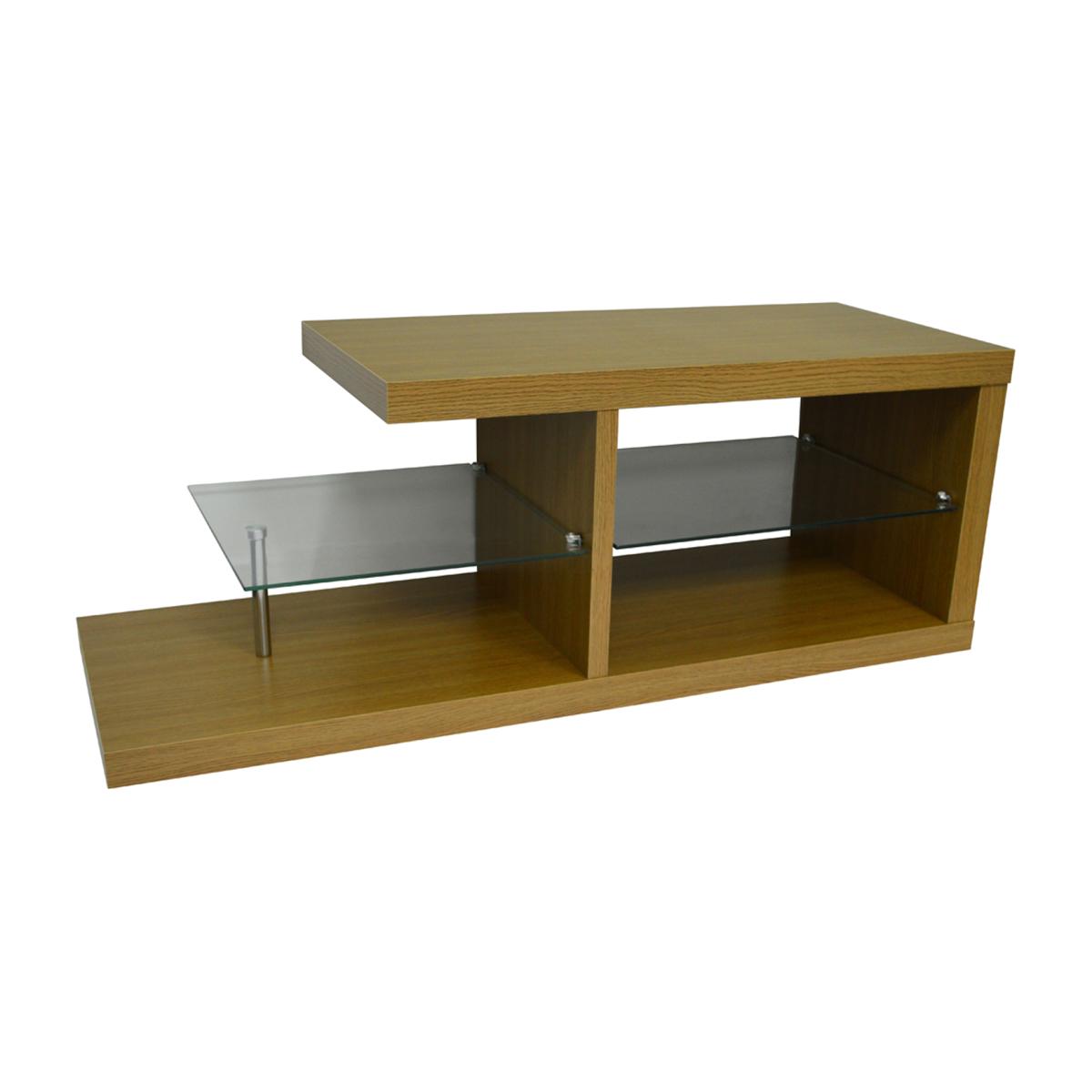 A stunning oak widescreen TV display unit. Made from chunky 50mm hollowboard with a oak wood effect finish and 8mm clear tempered safety glass. This unit has all the space you need to keep your living room electricals tidy and looking great. Can be used either way around as is finished perfectly on both sides - and is therefore ideal for use as a coffee table too. Dimensions of top 79.5 x 40cm maximum weight of TV 40kg shelves 14.5cm high. Please note display items shown are not included.