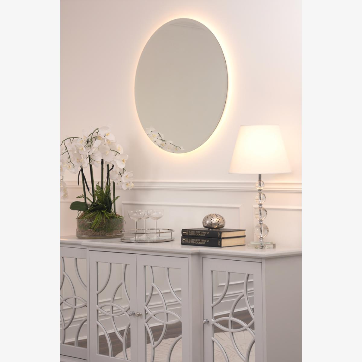 An elegant contemporary wall mirror with indirect LED lighting source. Creates a beautiful illuminated halo effect. Bevelled edge. Ideal for creating an atmospheric focal point. Requires 16 x AA batteries. Discreet switch on the underside of the frame. IP44 Suitable for use in bathrooms.