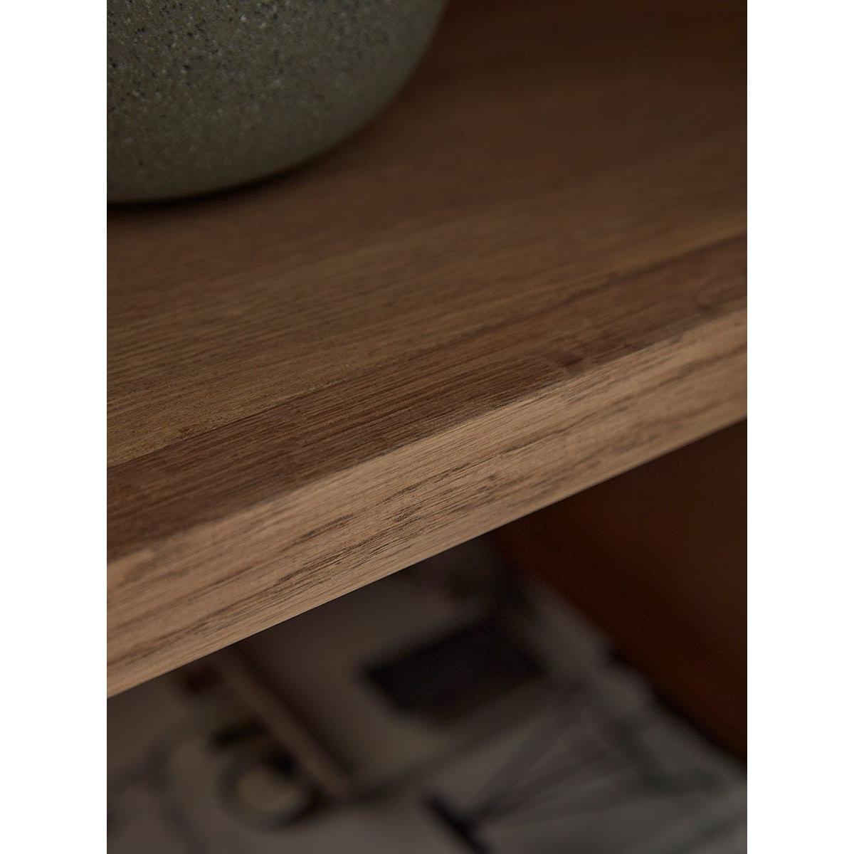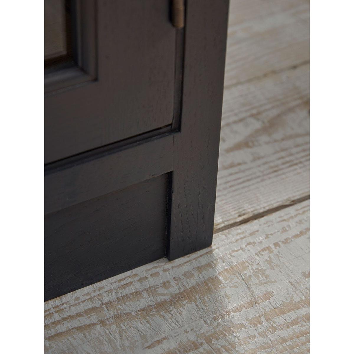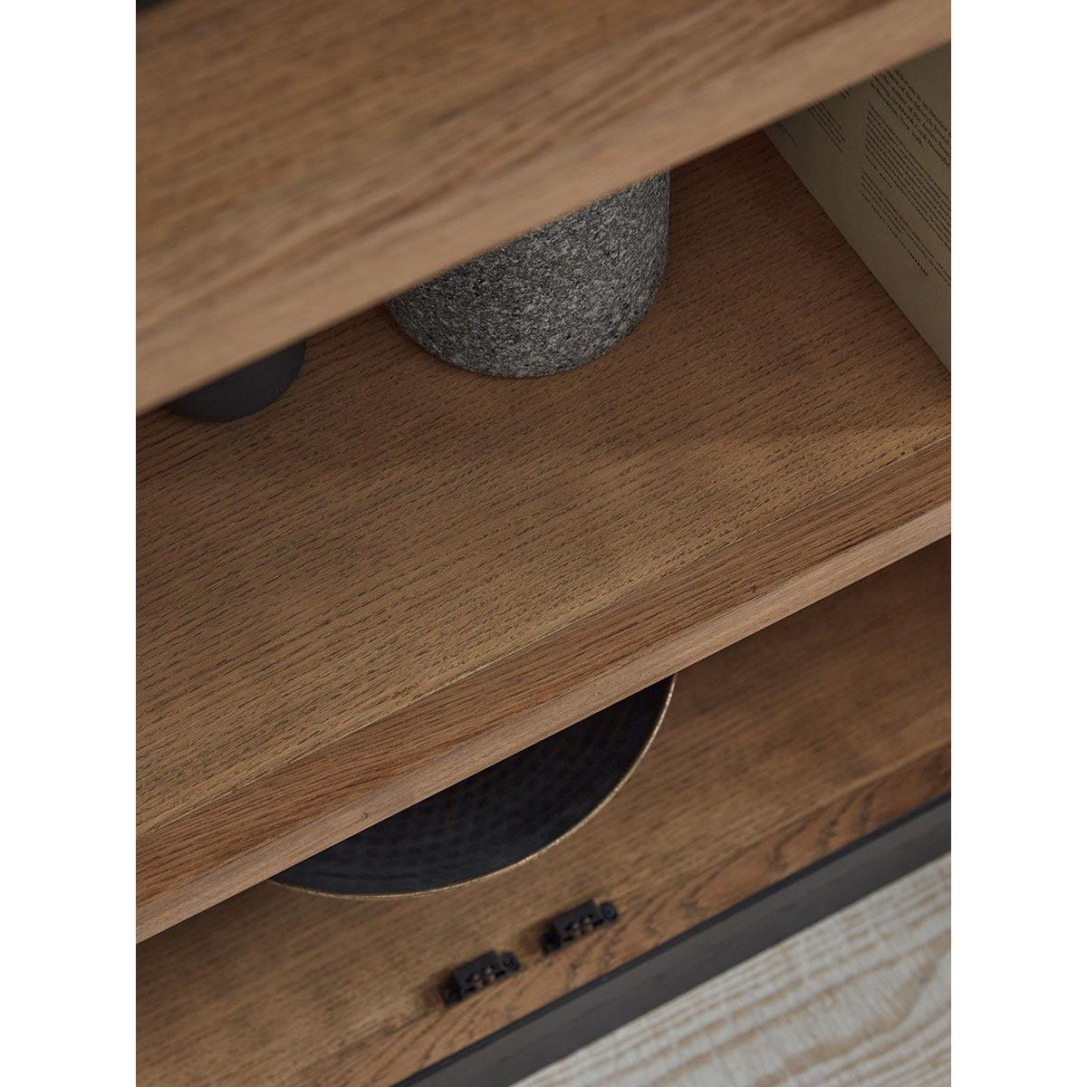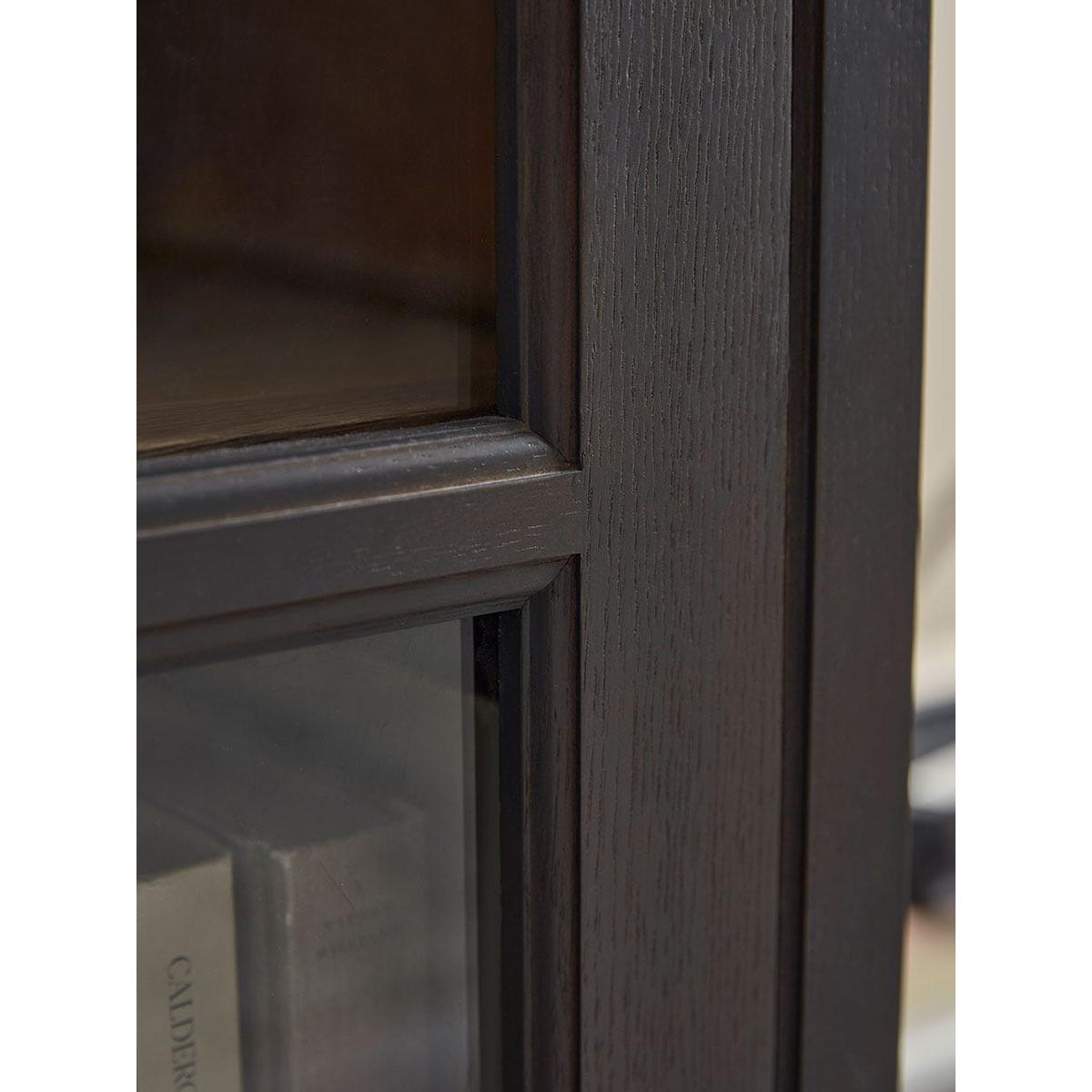 Made from oak, this cabinet has a dark painted exterior which creates a striking appearance, perfect for more modern interiors. Brass hardware matches the moodier tone of the exterior for a cabinet that sits perfectly in out Industrial trend. The natural oak shelves create beautiful contrast with the exterior which pairs wonderfully with the glass doors, working to add a lightness to the cabinet. Also available as a sideboard.