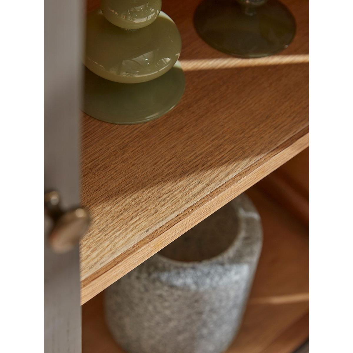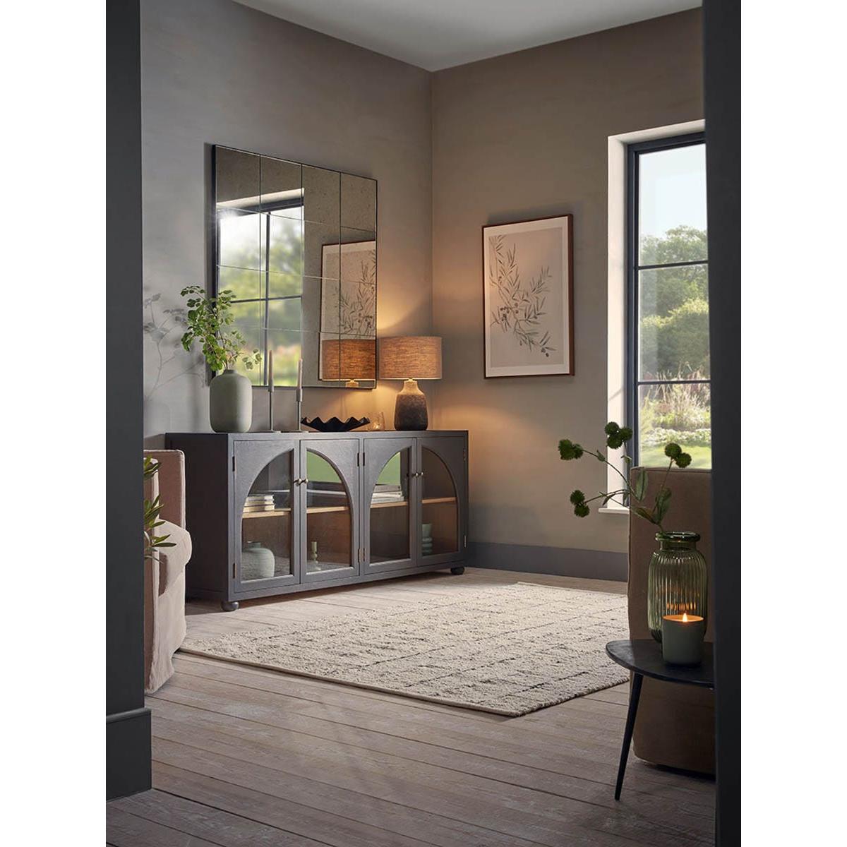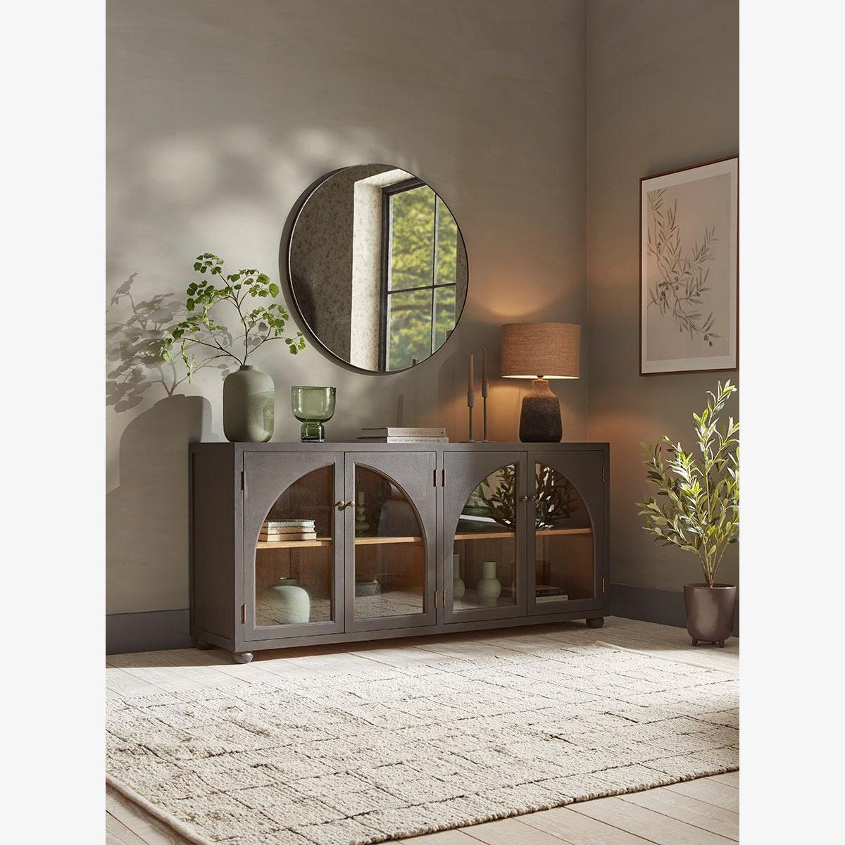 I’m a fan of how this dark-stained sideboard combines classic arches with a modern silhouette - it works equally well in contemporary living rooms, Scandi-inspired spaces or even a muted industrial scheme. The glazed doors let you showcase ceramics or glassware, while the internal lighting adds a warm glow in the evenings. Styling tip: balance its solidity by hanging a round mirror or slim art piece above, then layer in a low-profile lamp, a sculptural vase and a couple of books to break up the straight lines. Inside, mix closed storage (blue-tone ceramics, neutral linens) with open shelving for contrast and easy access.