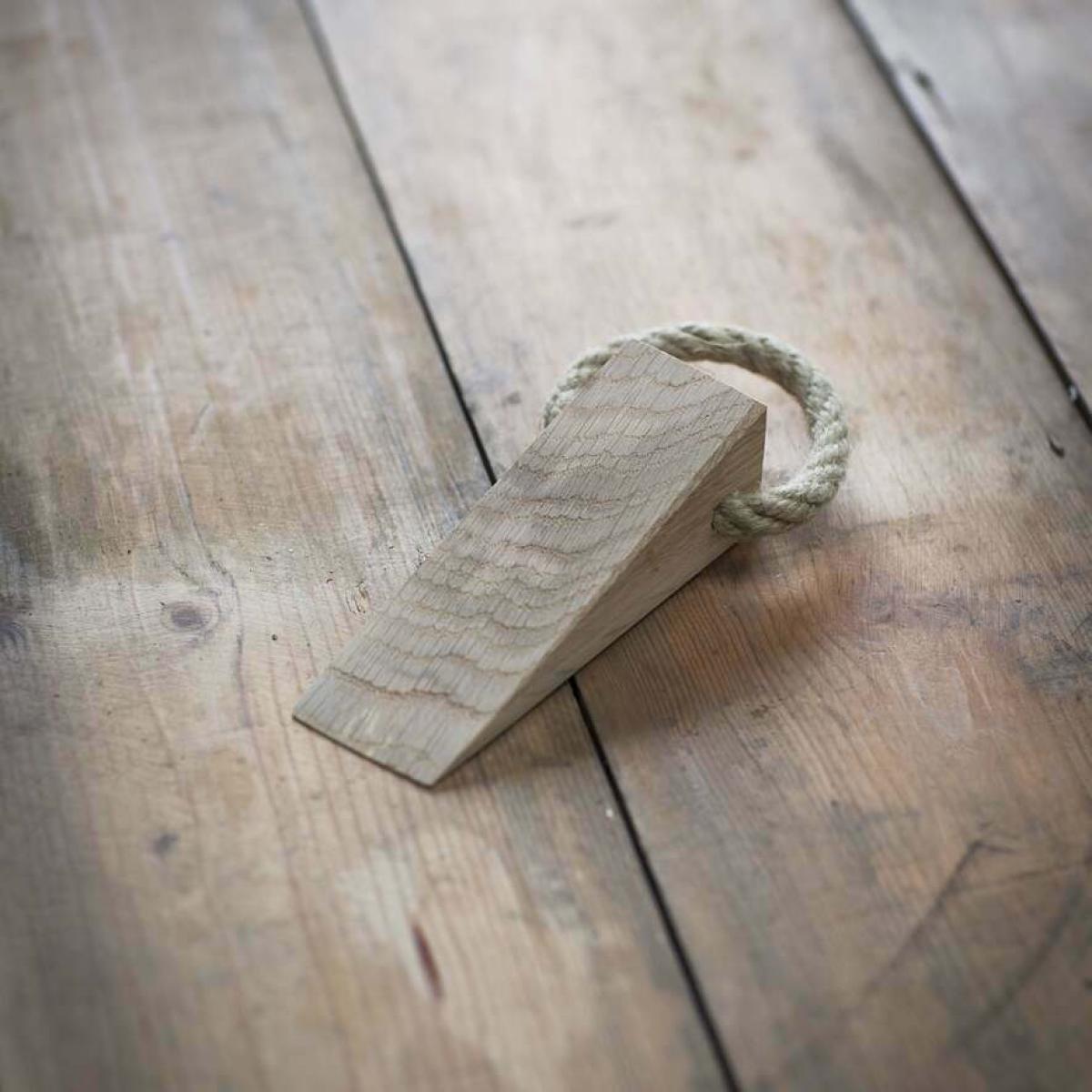 A rustic farmhouse-style door wedge with a durable triangular design. Crafted from natural oak wood with a handy rope handle.