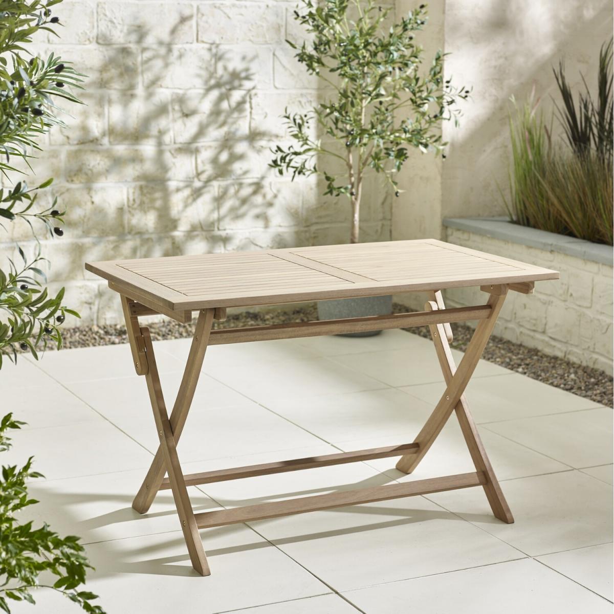Our Hamburg solid wood 4 seat outdoor folding dining table is a simple and stylish table. A rustic farmhouse wooden table design, the Hamburg features a flat slatted tabletop and curved legs that allow the tabletop to fold flat vertically so it can be stored easily. Constructed from solid acacia wood with a light teak colour stain, which makes it durable and unlikely to fade. Assembly required - easy to follow instruction included. Comes with 1 year warranty for peace of mind. Why not pair with any of our outdoor dining chairs Matching Hamburg folding chairs are available. This product is FSC certified, meaning the wood used is sustainably sourced.