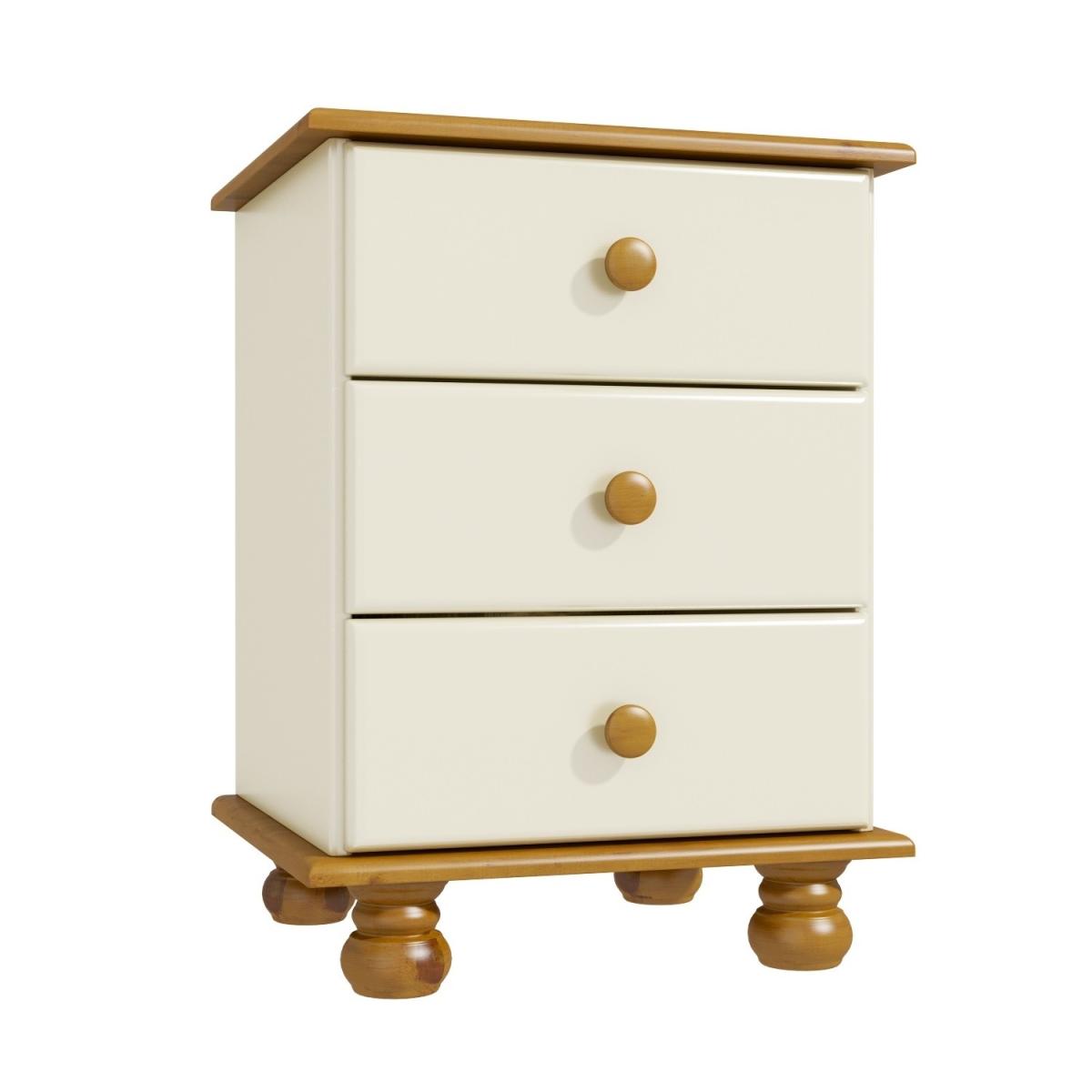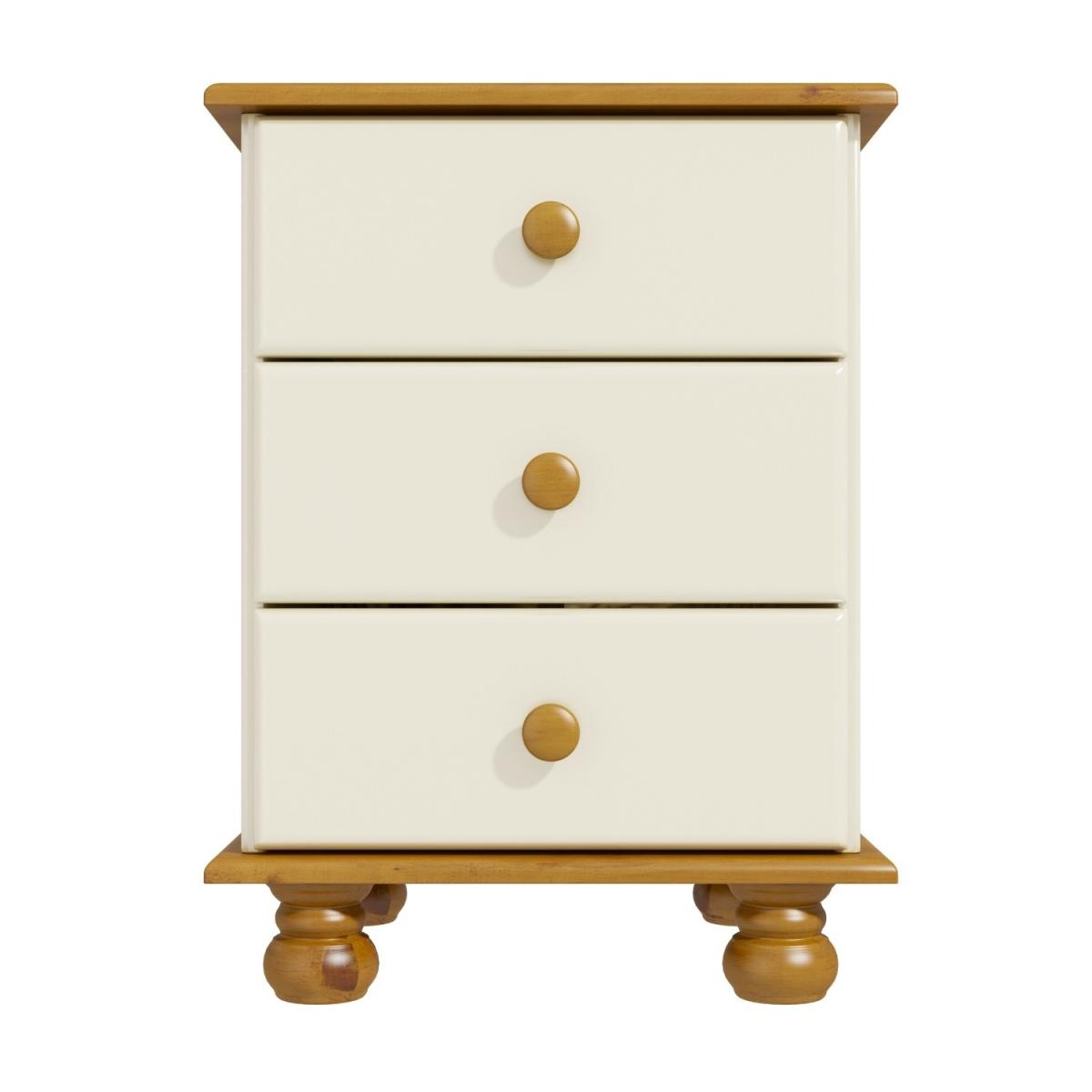 DIMENSIONS. H57.9 X W44 X D38.4 CM FEATURES. Classic and; two tone design3 Drawers with easy glide wooden drawer runners. Traditional bun feet and; round handles. Durable MDF and; solid pine constructionSoft cream painted finish with rich pine trims. Self-assembly required. Hamilton bedroom collection. CLASSIC STYLING The Hamilton collection has a classic design with a stylish two tone finish. Pieces in the collection feature traditional bun feet and solid round handles. With a soft cream finish and touches of rich pine pieces from the Hamilton collection are sure to add a homely touch to any bedroom. BEDSIDE STORAGE This bedside table offers plenty of space for necessities with a spacious top measuring 44x38.4cm. Housing three drawers with easy glide wooden drawer runners this bedside table delivers durable concealed storage ideal for essentials. QUALITY BUILD Made from MDF and solid pine with supportive bun feet the Hamilton bedside table stands stable and lasts the test of time. Wooden drawer runners ensure no sticking and a smooth opening every time. Complete with a soft cream painted finish and solid rich pine trims the bedside has a warm homely appearance. This bedside table requires self-assembly which can be managed by one person..
