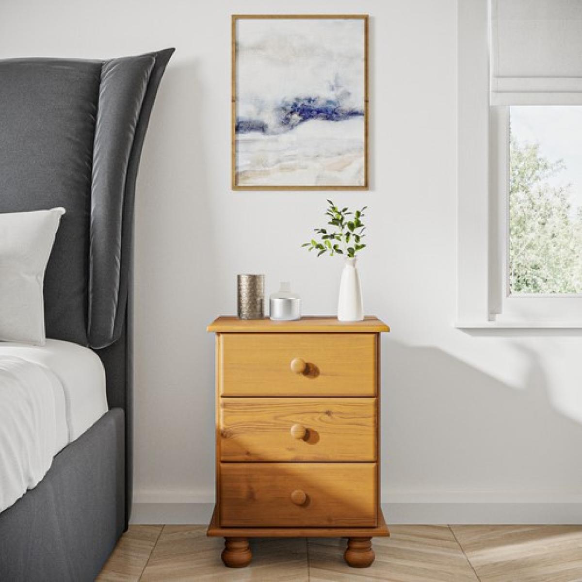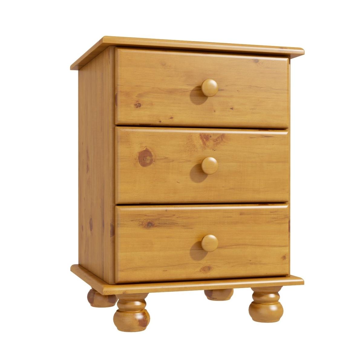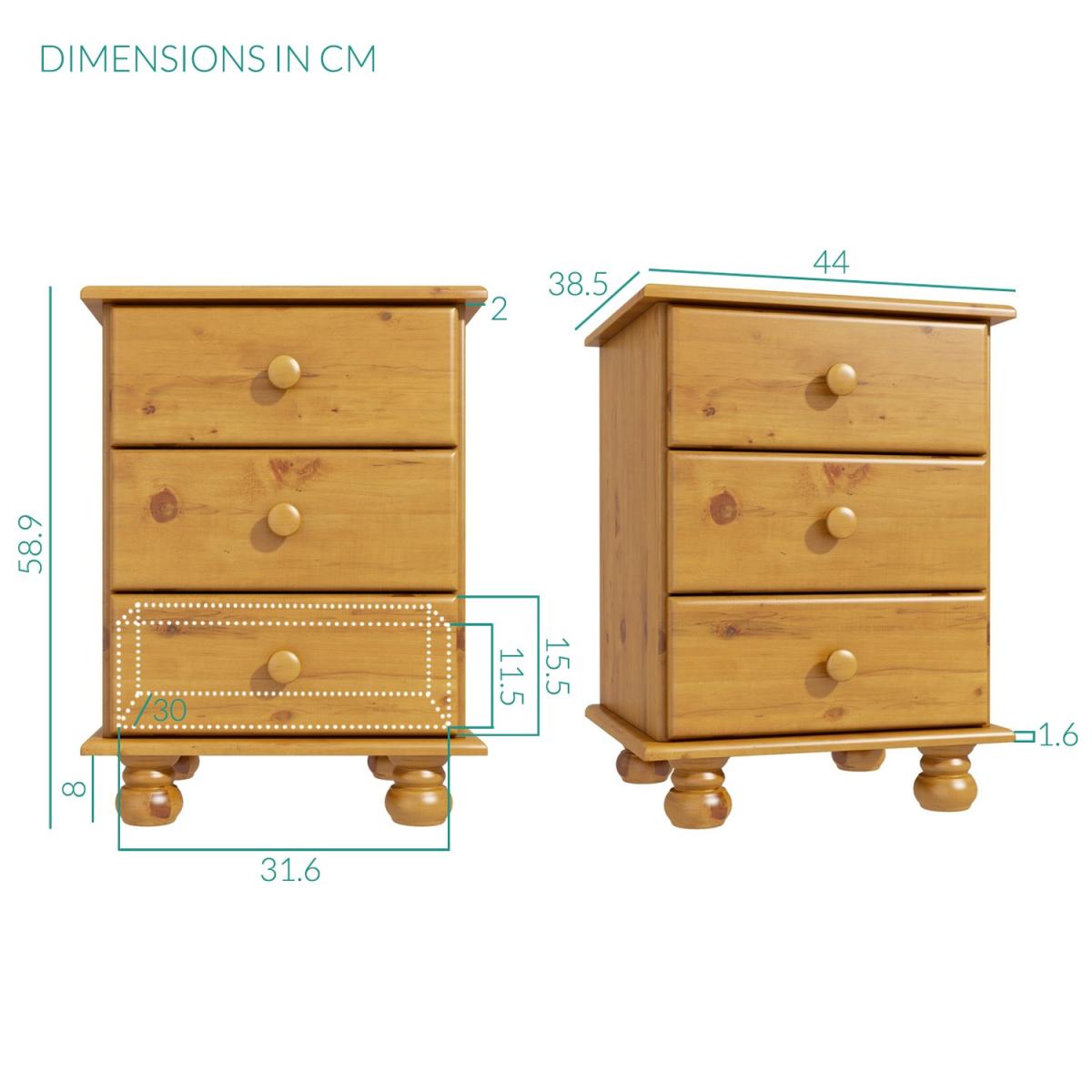 DIMENSIONS. W44 x D38.5 x H58.9cm FEATURES. Classic and; versatile design3 Drawers with easy glide wooden drawer runners. Traditional bun feet and; round handles. Durable solid pine features. Rich warm pine finish. Self-assembly required. Hamilton bedroom collection. CLASSIC STYLING The Hamilton collection has a classic design offering great versatility. Pieces in the collection feature traditional bun feet and solid round handles. With a rich pine finish pieces from the Hamilton collection are sure to suit any bedroom. BEDSIDE STORAGE This bedside table offers plenty of space for necessities with a spacious top measuring 44x38.4cm. Housing three drawers with easy glide wooden drawer runners this bedside table delivers durable concealed storage ideal for essentials. QUALITY BUILD Made from solid pine with supportive bun feet the Hamilton bedside table stands stable and lasts the test of time. Wooden drawer runners ensure no sticking and a smooth opening every time. With a rich pine finish the bedside has a warm homely appearance. This bedside table requires self-assembly which can be managed by one person..