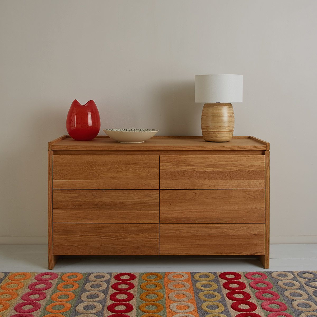 I love this sideboard for its clean, natural oak finish that adds warmth and texture to various interiors. It works particularly well in Scandi, minimalist, or contemporary spaces, complementing neutral palettes and creating a calm, inviting atmosphere. Practical styling tips include pairing it with simple ceramic vases, structured table lamps, or a mix of colourful accessory pieces on top. Inside, utilise the two doors for hidden storage, keeping often-used items discreetly out of sight, while the flat surface is perfect for displaying a curated selection of decorative objects or a tray for everyday essentials. Overall, it’s a versatile piece that can serve as both a functional storage solution and a stylish focal point in living or dining rooms.