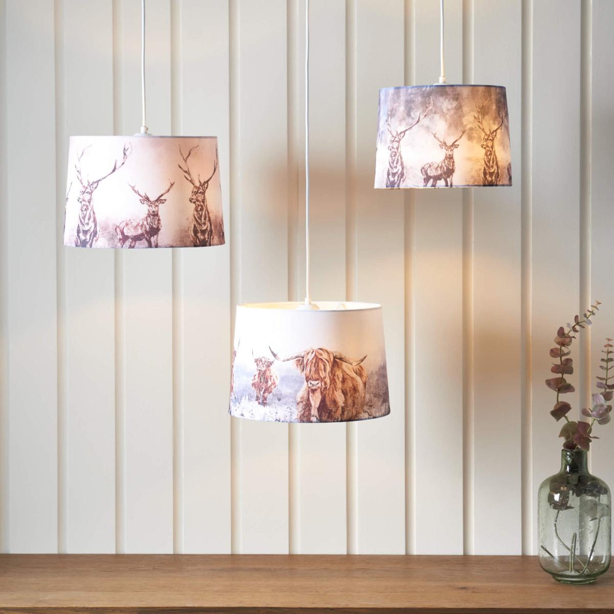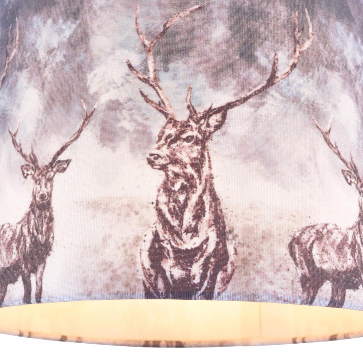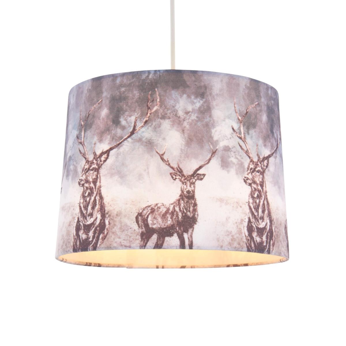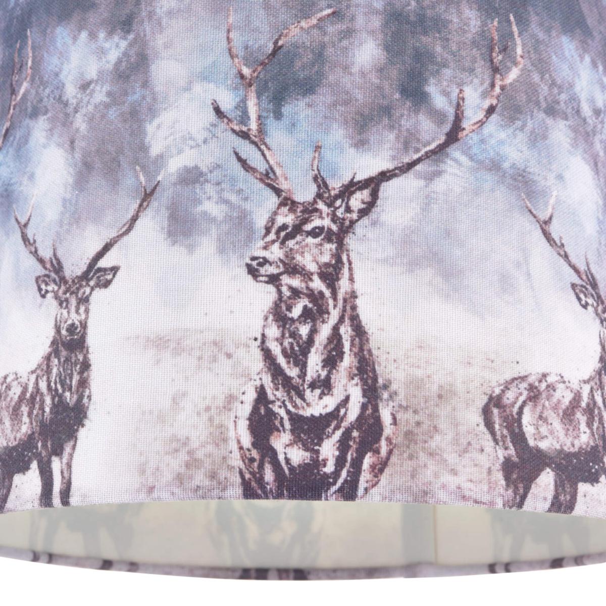 A digitally printed lampshade with a bespoke watercolour painted design. It features stags against a natural setting and will add a distinctive and creative accent to your space. Suitable for both lamp bases and ceiling fittings. A digitally printed lampshade with a bespoke watercolour painted design. It features stags against a natural setting and will add a distinctive and creative accent to your space. Suitable for both lamp bases and ceiling fittings.