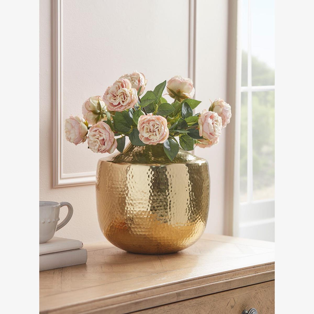 I love the hammered brass vase for its versatility and tactile appeal; its warm metallic finish adds a touch of glamour without overwhelming a space. It works well in both contemporary and eclectic interiors, especially when paired with soft florals or greenery for a fresh contrast. Practical styling tips include using it as a standalone centerpiece on a sideboard or coffee table, or grouping it with other metallic accents for a curated look. Its substantial size makes it ideal for showcasing statement floral arrangements, but it also looks striking when empty, bringing texture and sheen to your decor.