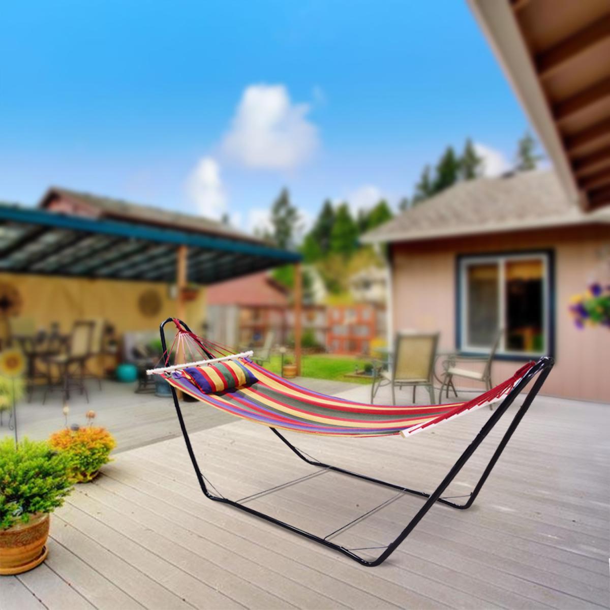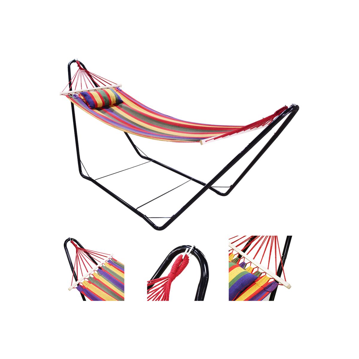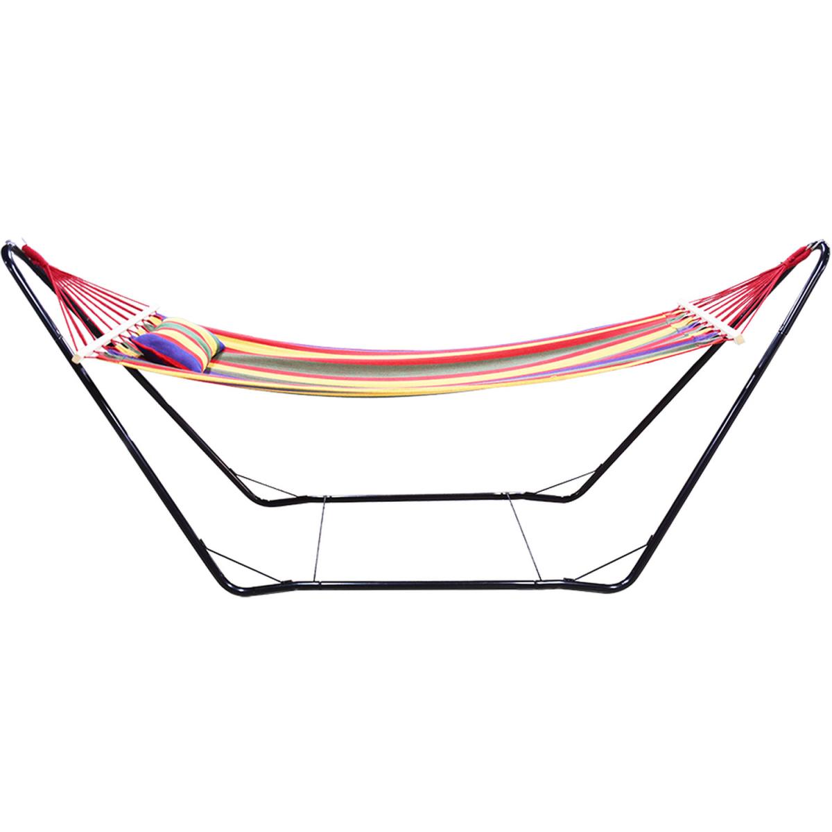 Easy to Assemble, Sturdy Metal Frame. 2 x Steel "S" Hooks Included to Securely Attach Hammock to Frame. Hammock Made from Natural Woven Cotton. Soft and Breathable. Includes matching pillow cushion to keep you head supported. Incorporated Wooden Stabiliser Bars to Prevent Tipping. Perfect for Both Indoors and Outdoors. Maximum Weight Capacity: 150kg. Brazilian style hammock. Heavy cotton built to last and holds you firmly in place. Wooden spread bar ensures the hammock maintains its shape. Cold rolled steel hammock frame won't rust and is built-to-last. Sturdy hanging rope system.