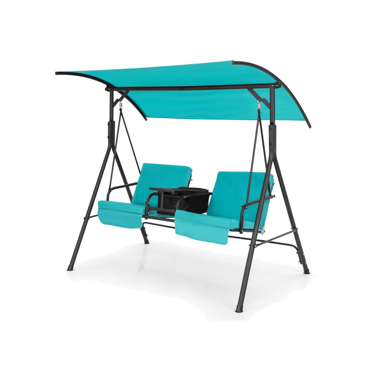Enjoy outdoor leisure time for two with our 2-seat patio canopy swing. The loveseat swing is designed with an adjustable canopy, which is large enough to cover you and your partner. It will protect you from scorching sunlight, offering a comfortable relaxing experience. And do you want to have cold drinks outdoors at any time Our cooler bag design is special for you! You can store your drinks or snacks in the bag between the two seats, keeping them cool for a long time. Hammock Bench Chair with Center Tray - Blue