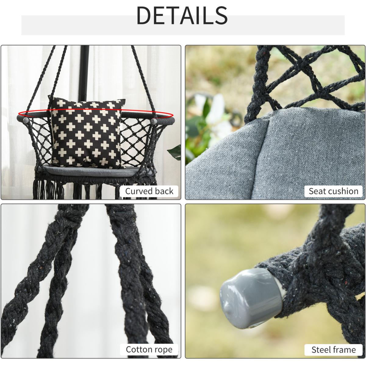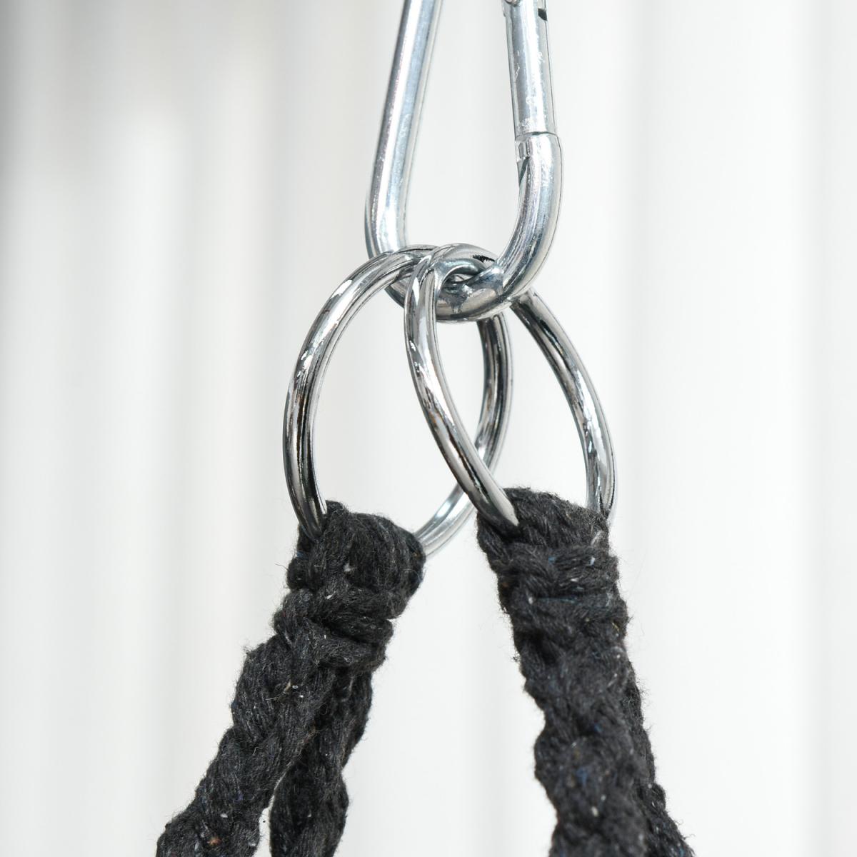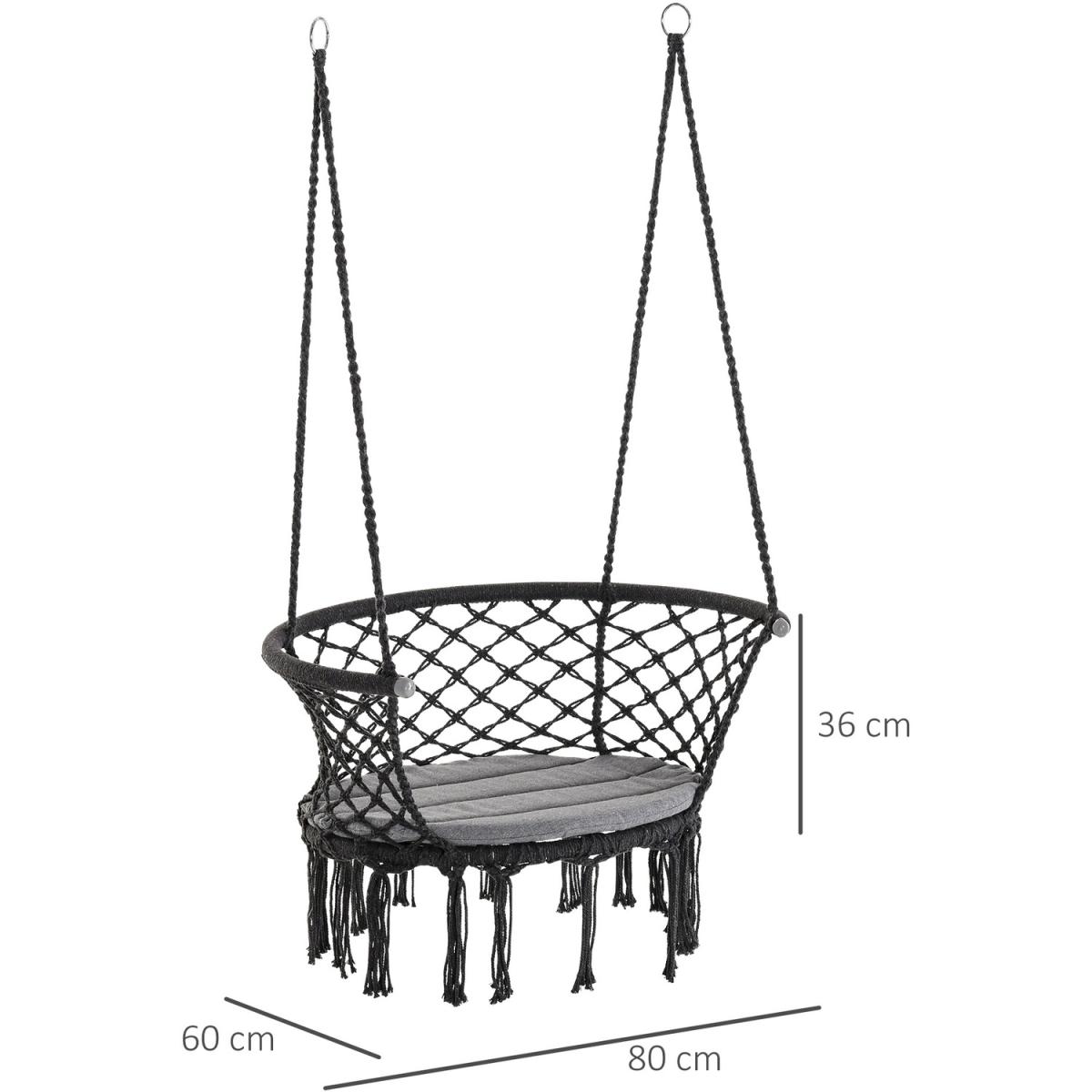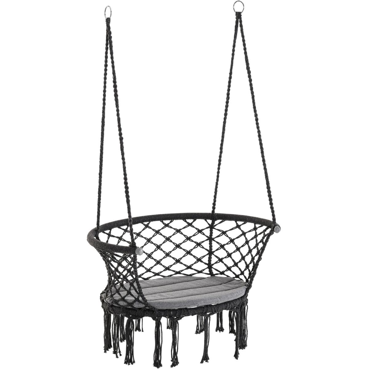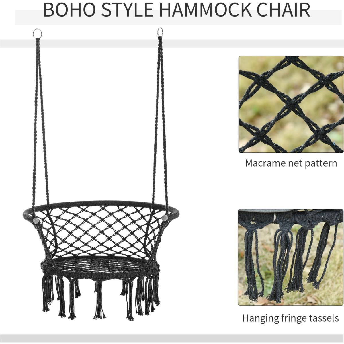 Infuse elegance into your indoor and outdoor spaces effortlessly with this hanging rope hammock chair from Outsunny. Boho style chair is crafted into a spacious seat design, where netting cotton rope forms the seat and back, and with fringe tassels for an attractive and unique looking. Made from metal for strength and reliability, the front seat is slightly curved for a comfortable seat, and with an armrest offering support when needed.