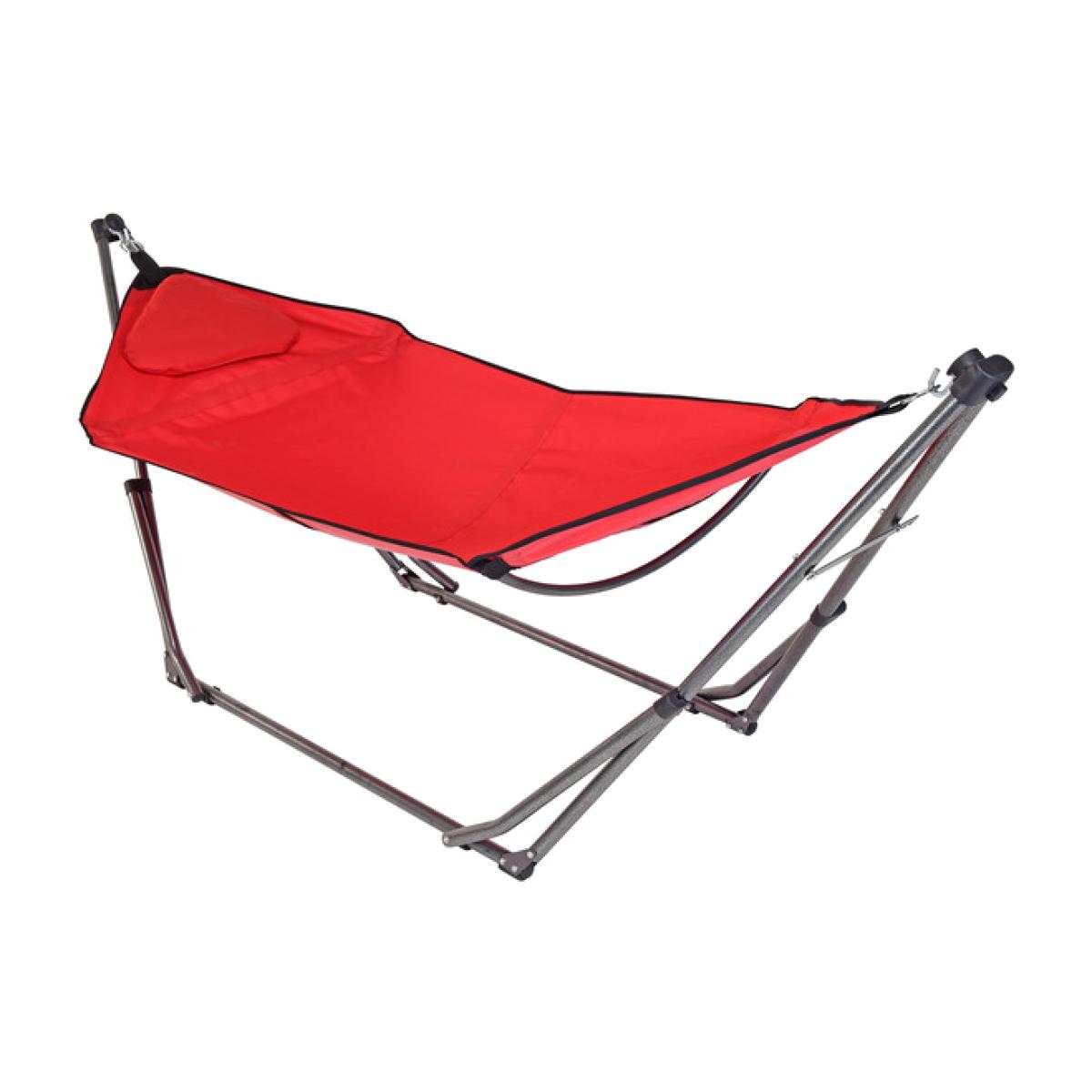 Set yourself up with a really great place to relax while camping with this Hammock With Cushion. When folded out, the hammock swings above a sturdy metal frame, providing a great place to lay back on after a long hike as the sun begins to set. The removable pillow adds an extra layer of comfort. The entire set easily folds up and slides easily into the included bag, which features carry handles for easy transportation.