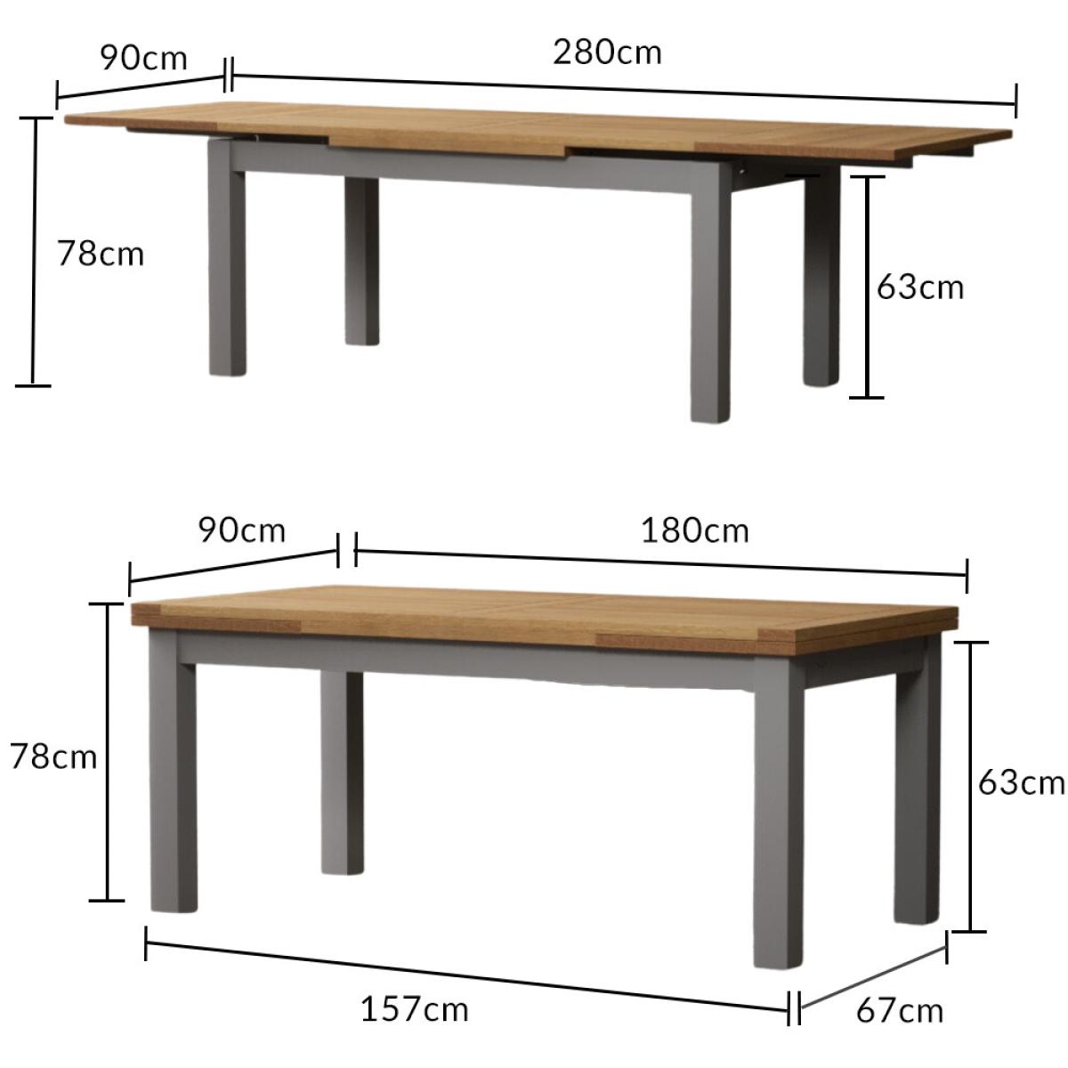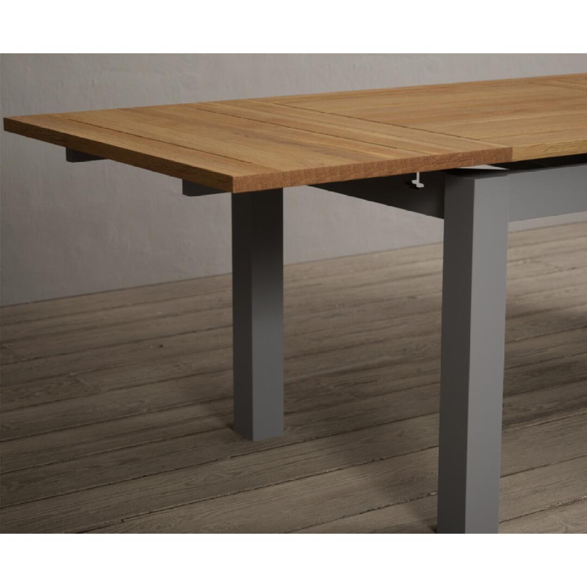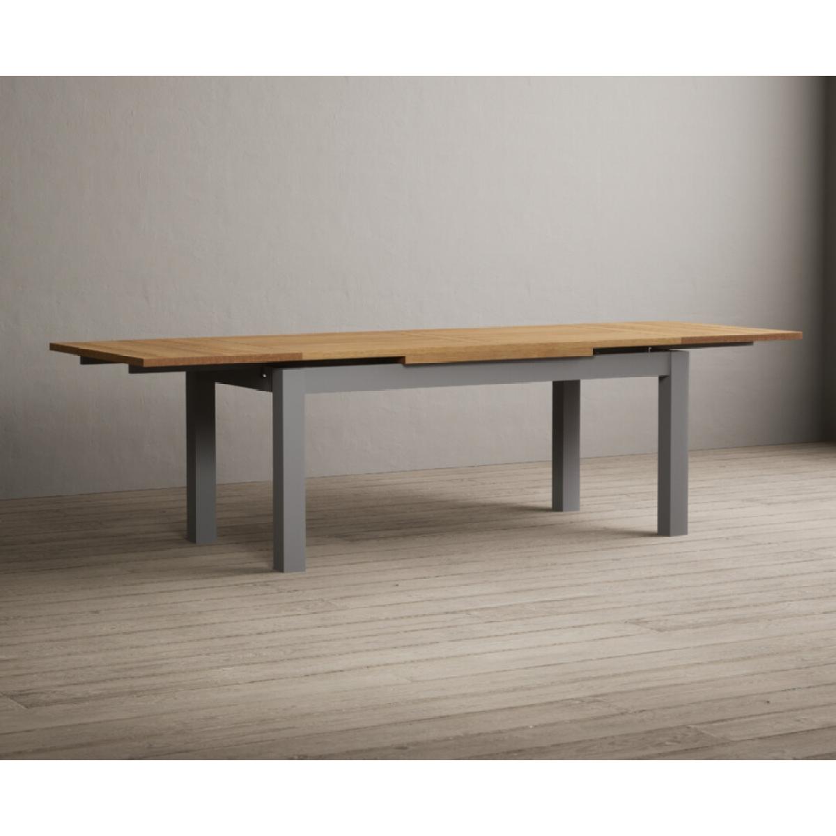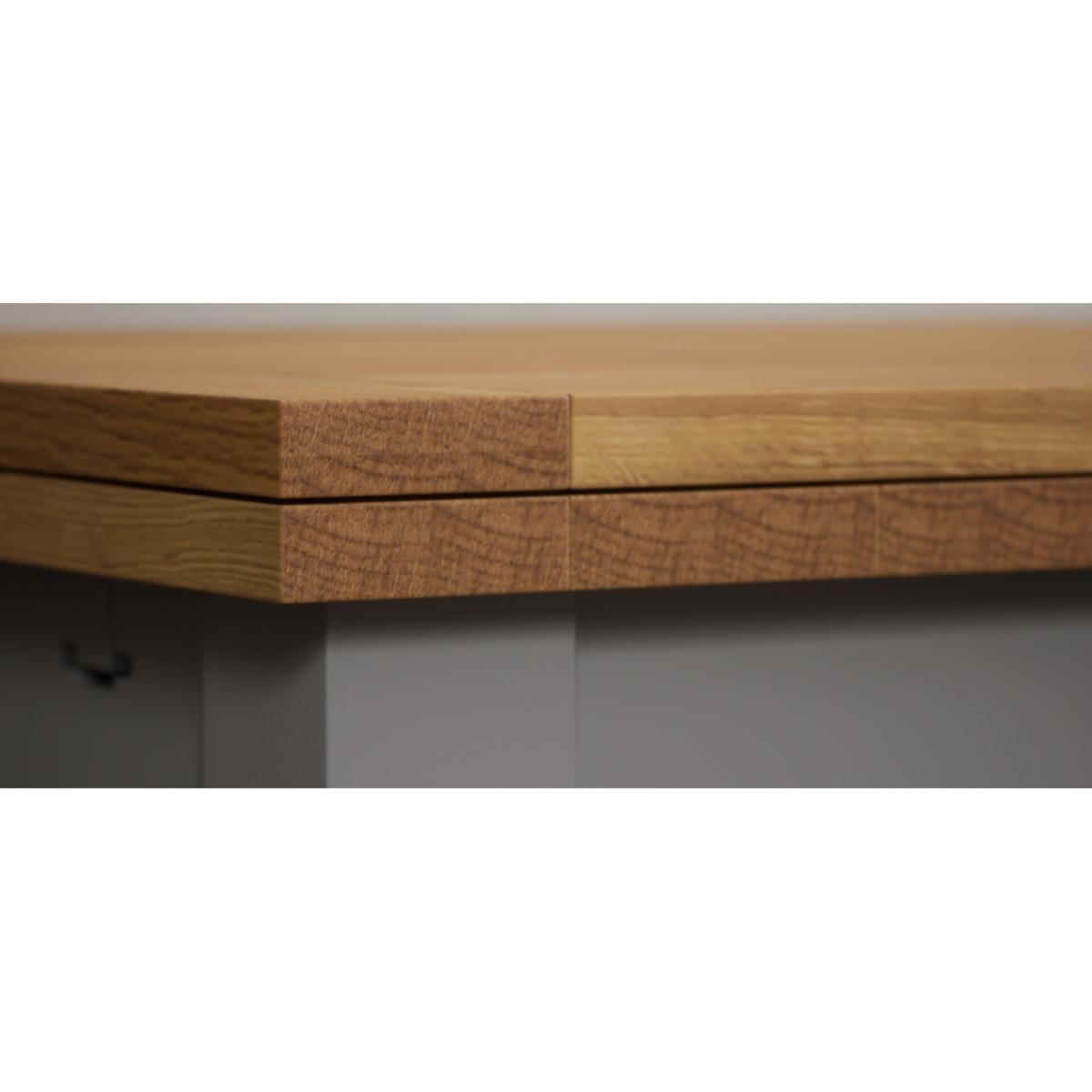 The Hampshire 180cm Oak and Light Grey Painted Extending Dining Table is crafted from solid wood with a light grey painted finish and features a 100% solid oak top.