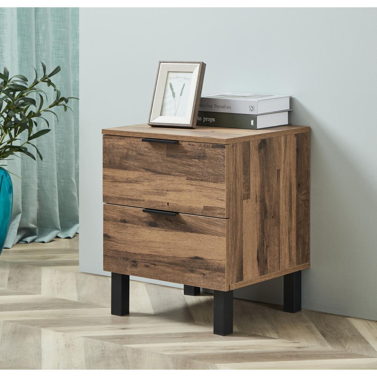 With a modern oak finish and contrasting black metal legs and handles, this Hampshire 2 Drawer Bedside Table offers a perfect match for your bedroom. It's easy to assemble and clean for your convenience whilst offering bedroom organisation and storage space. The unit has 2 drawers for all your nighttime essentials and tabletop space for your book, alarm, and bedside lamp.