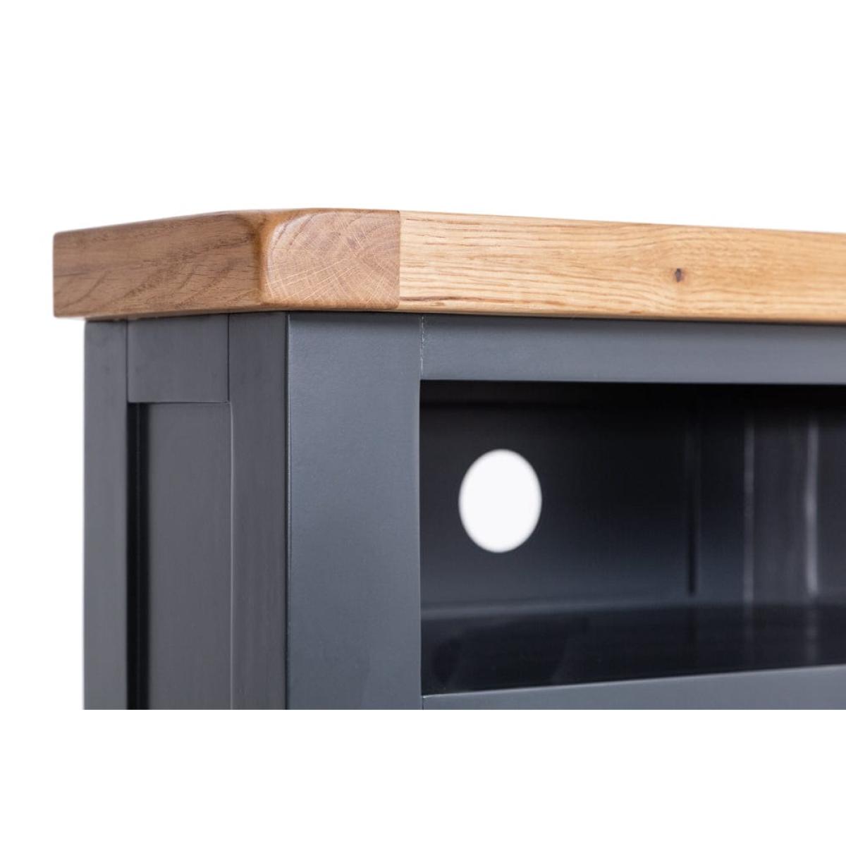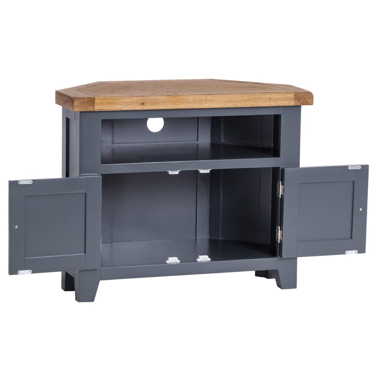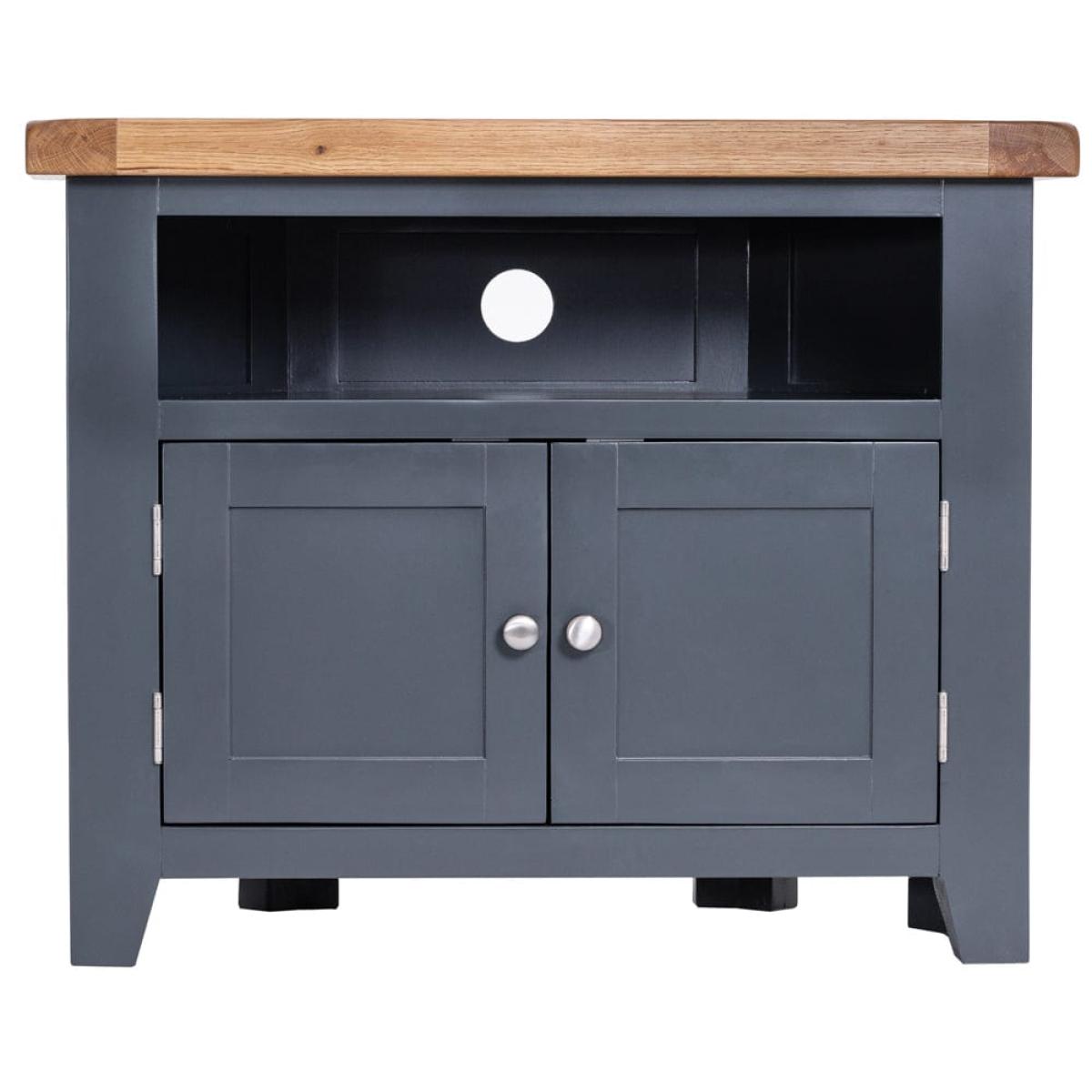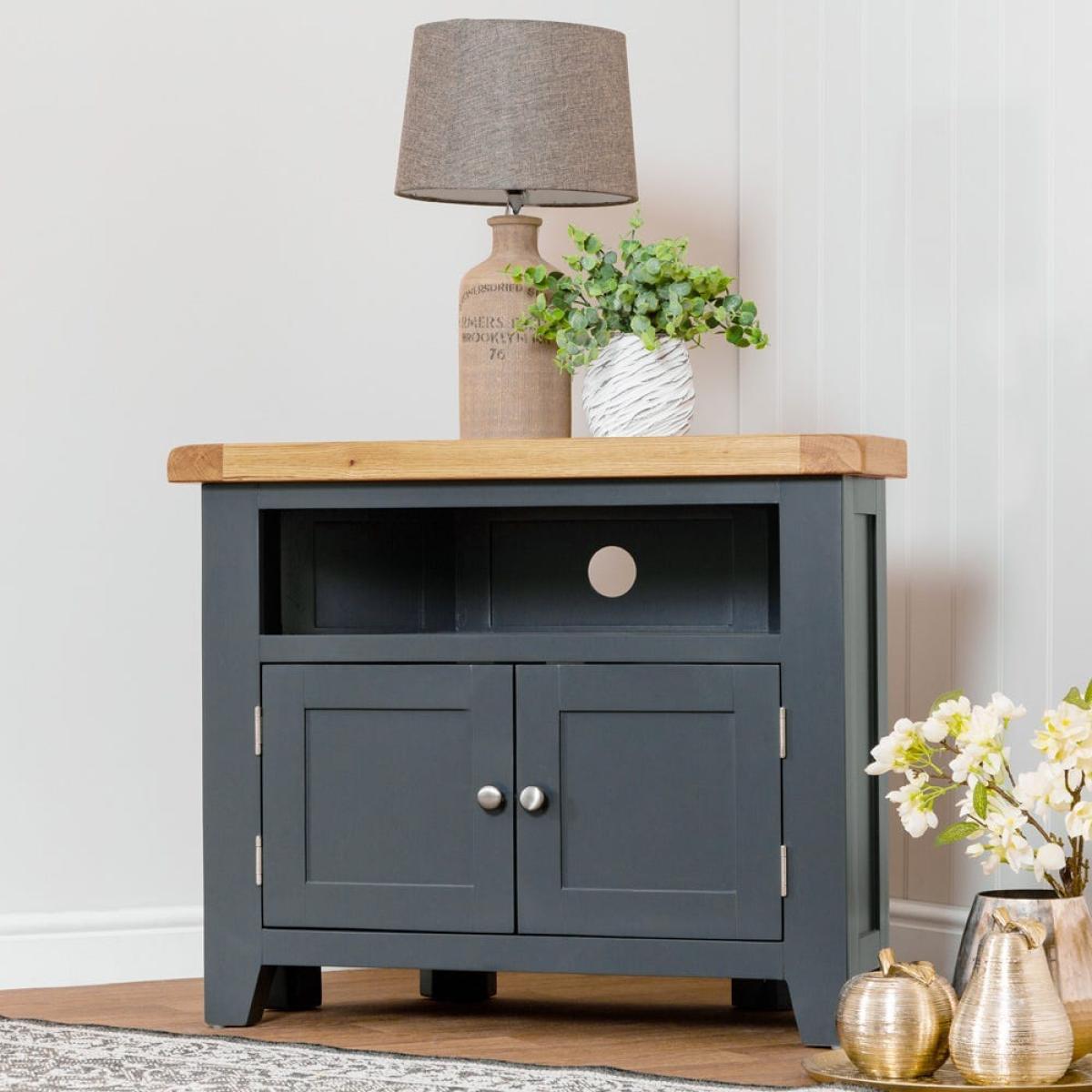 This cleverly shaped Hampshire blue painted oak corner TV unit fits neatly into any nook to bring you your evening entertainment in style. The 80cm-wide surface suits 32-inch sets, and the unit comes ready assembled so you can get stuck straight into your favourite drama. Keep board games and kids’ toys tucked away in the double cupboard and use the shelf for your remote controls. There’s a handy hole at the back to feed cables through, so you’ll never waste your valuable downtime untangling wires. Our cool blue paint colour offsets the warm oak top for a piece that’s the star of any show.
