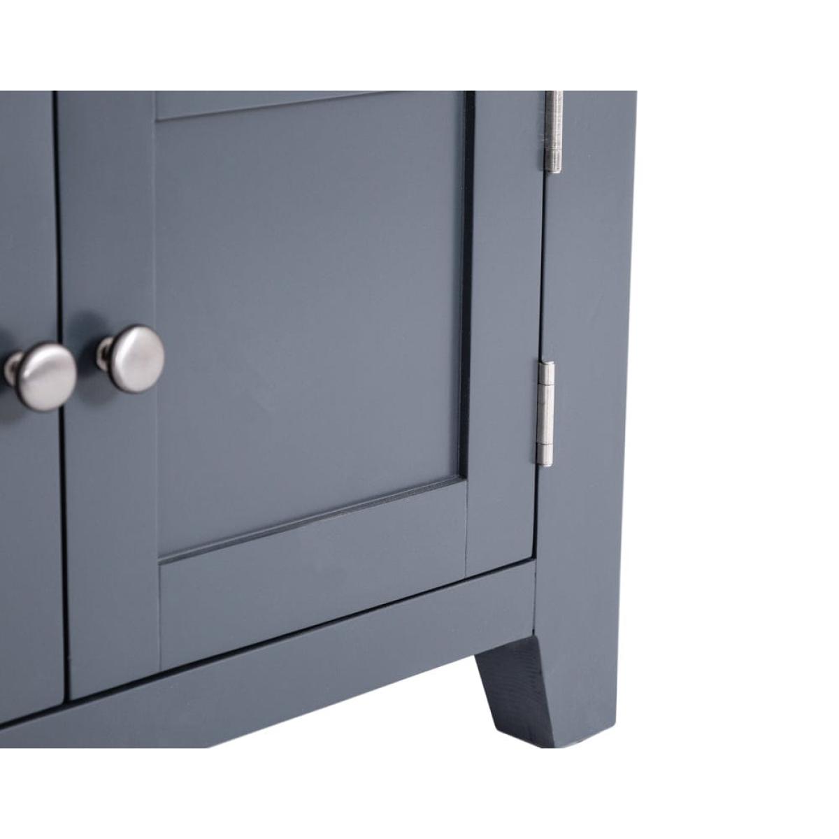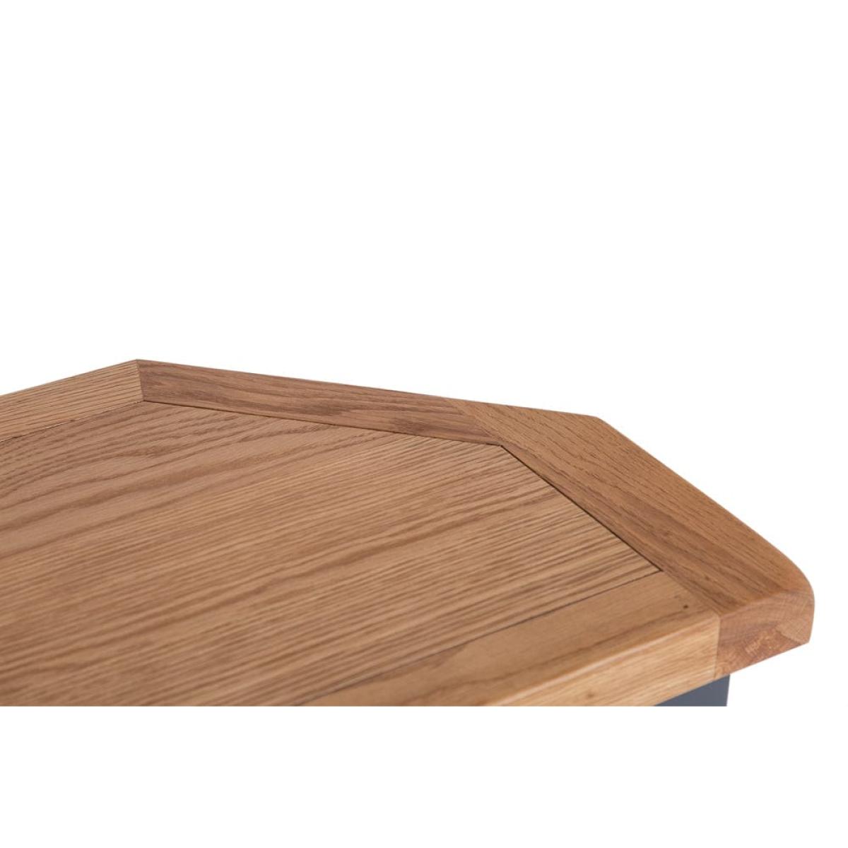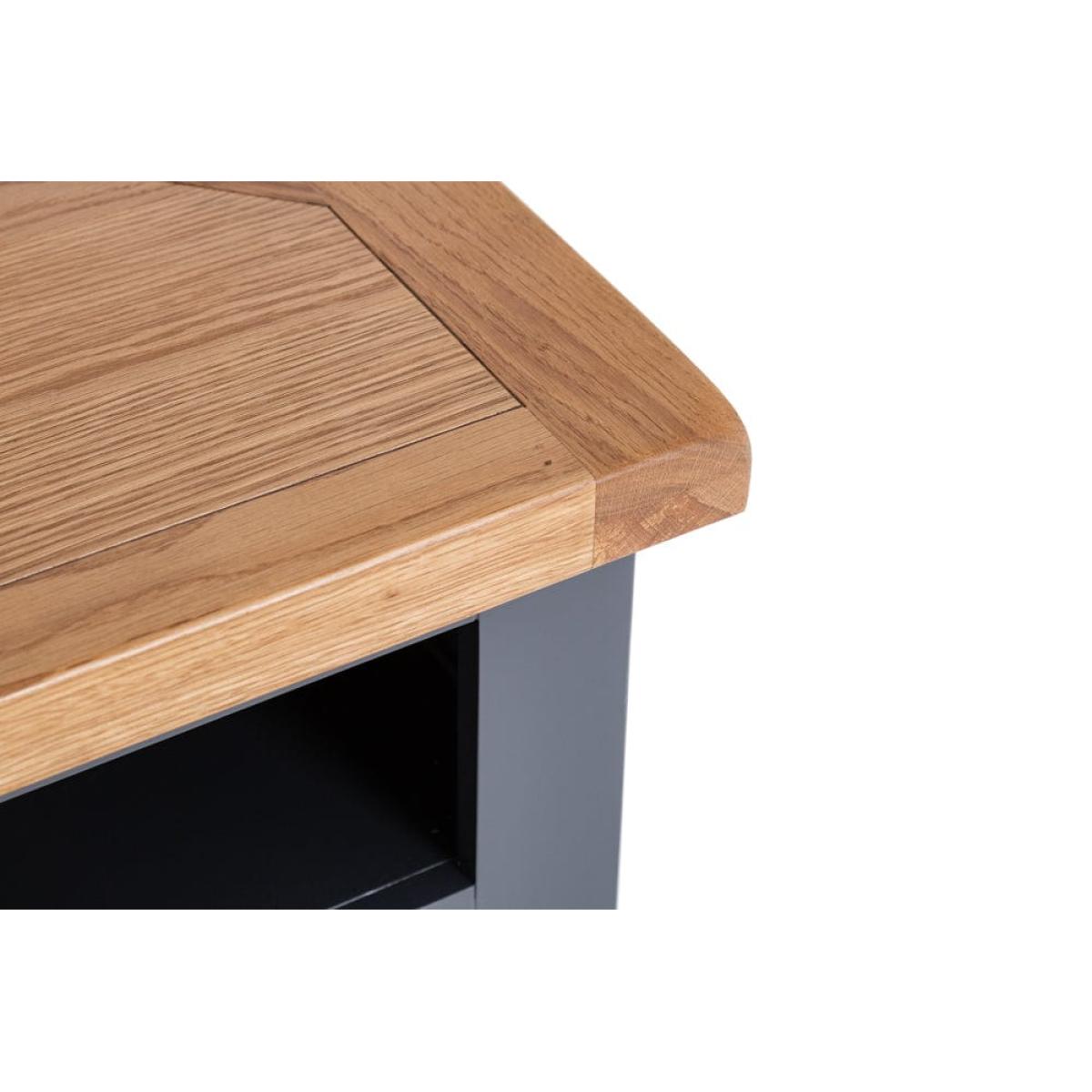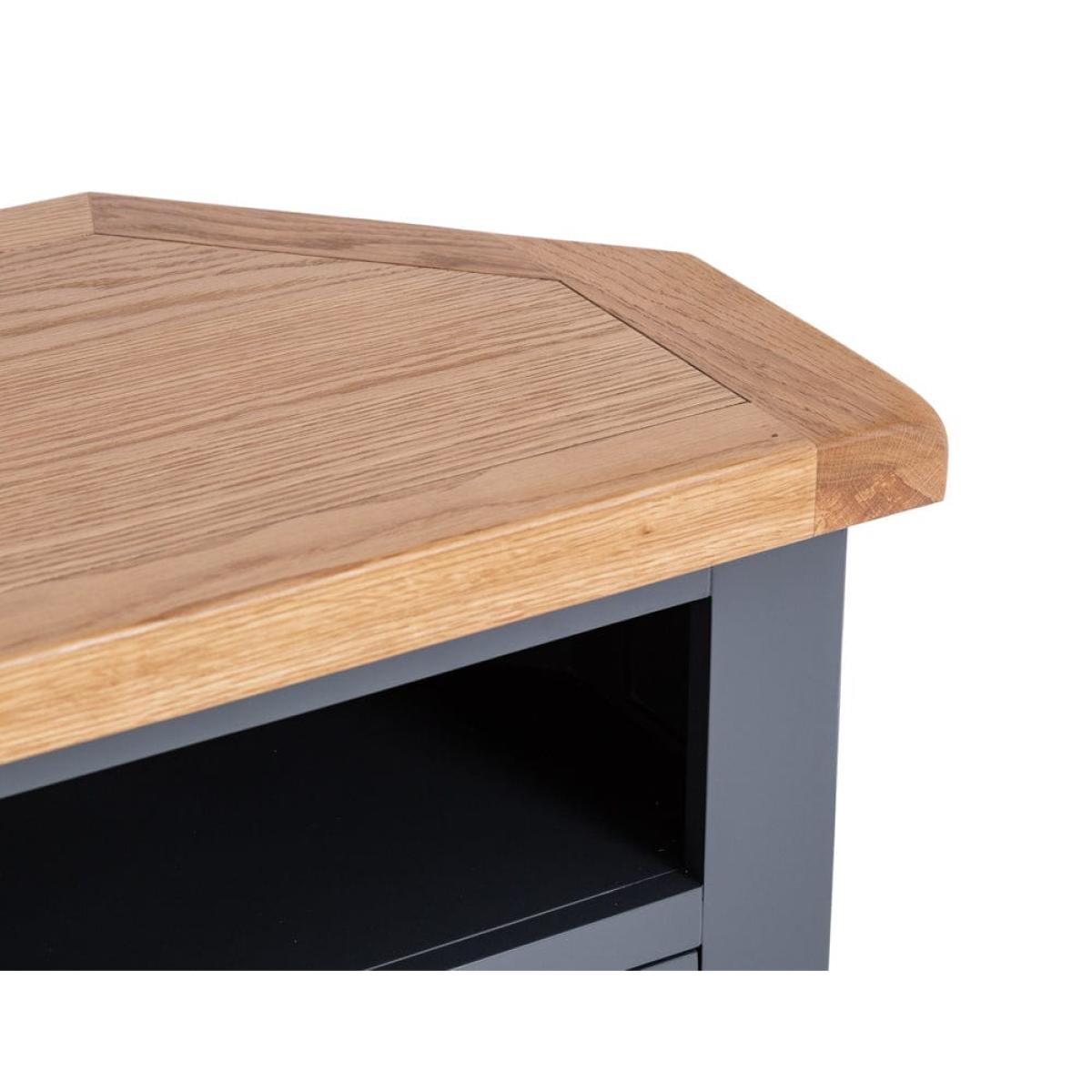 This cleverly shaped Hampshire blue painted oak corner TV unit fits neatly into any nook to bring you your evening entertainment in style. The 80cm-wide surface suits 32-inch sets, and the unit comes ready assembled so you can get stuck straight into your favourite drama. Keep board games and kids’ toys tucked away in the double cupboard and use the shelf for your remote controls. There’s a handy hole at the back to feed cables through, so you’ll never waste your valuable downtime untangling wires. Our cool blue paint colour offsets the warm oak top for a piece that’s the star of any show.