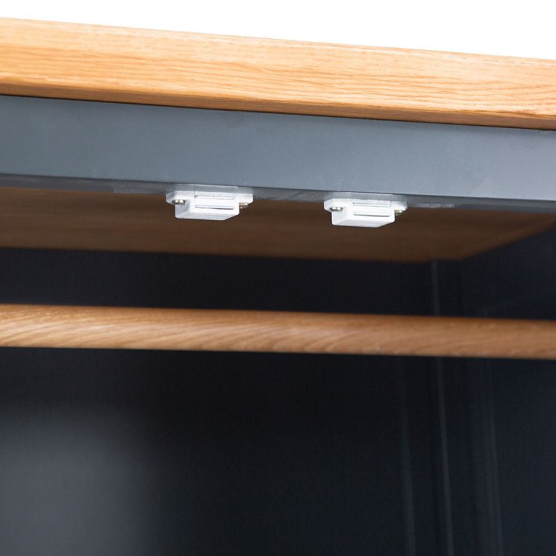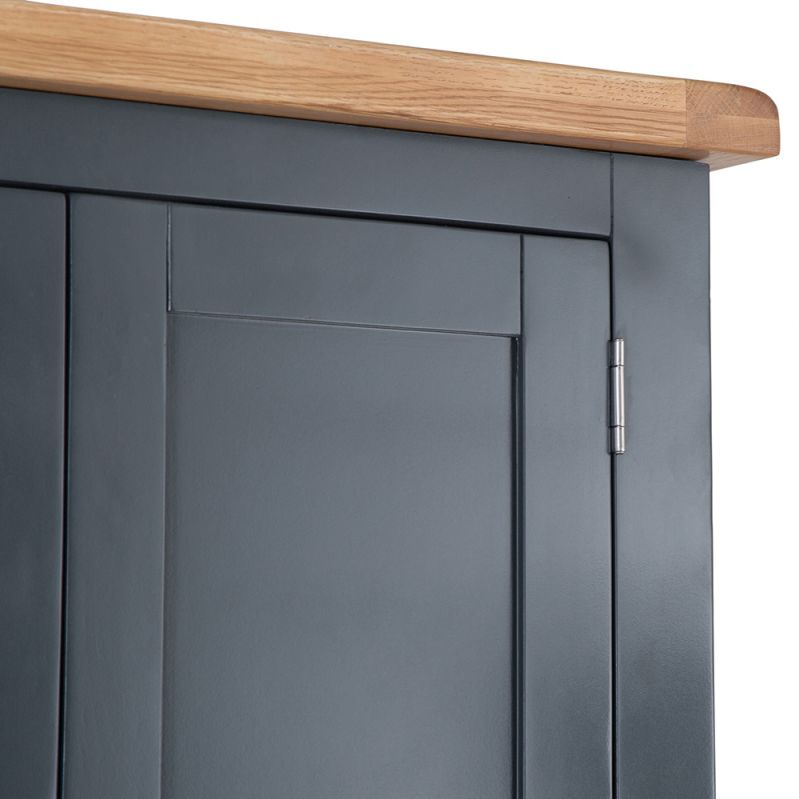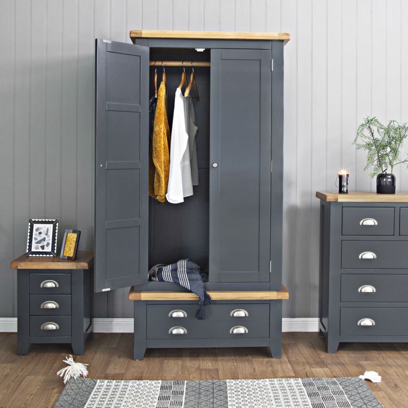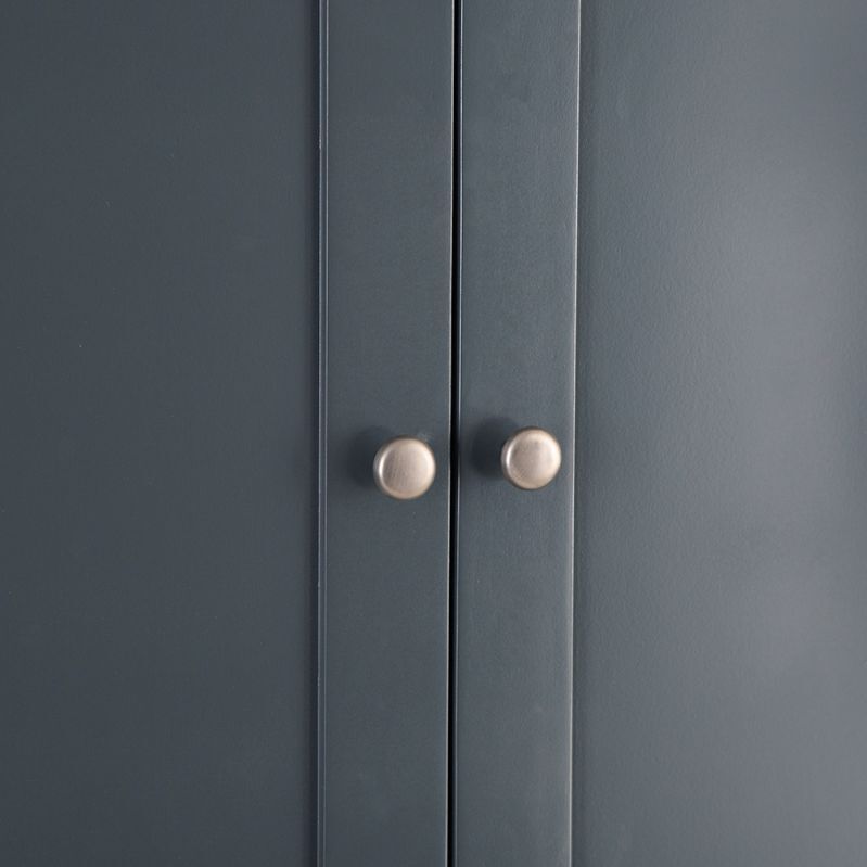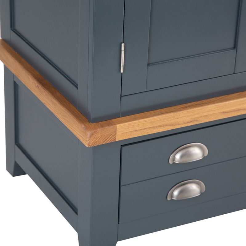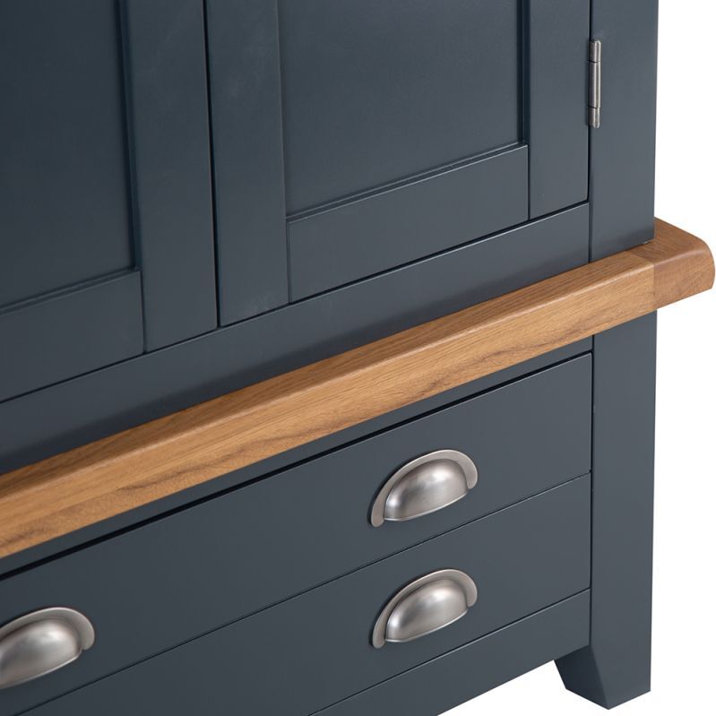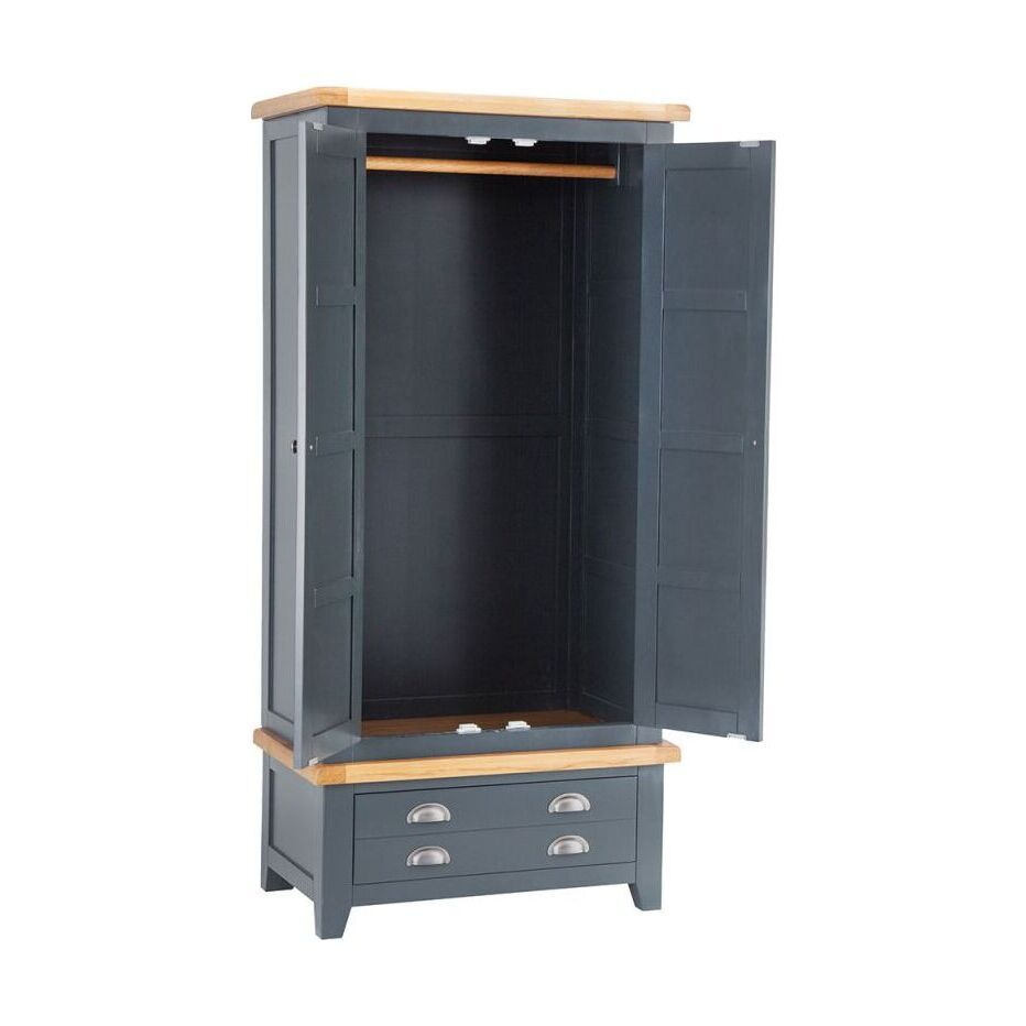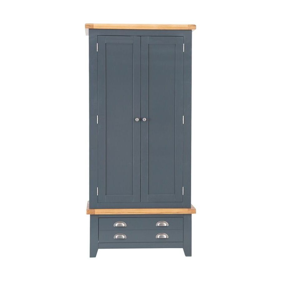 With its sleek good looks and plenty of practical features, this Hampshire blue painted oak 2-door wardrobe with drawer makes getting dressed a whole lot more fun. Our navy blue finish is offset by the pared-back oak top, hanging rail and lower trim, with chrome cup handles and doorknobs bringing our signature details. A full 150cm of hanging height behind the double doors leaves space for your jackets, shirts and dresses. A generous bottom drawer opens up for foldable items or bulky accessories like belts and shoes. All dressed up with somewhere to go? Magnetic fixings keep the doors securely closed once you’re done.