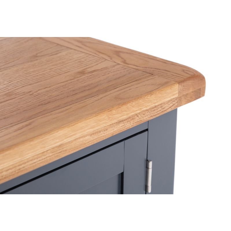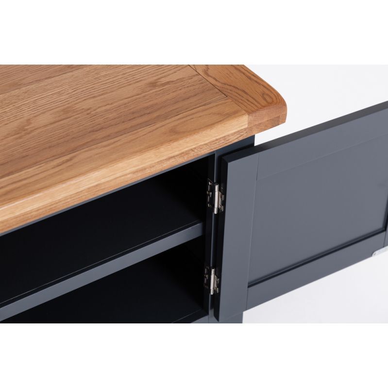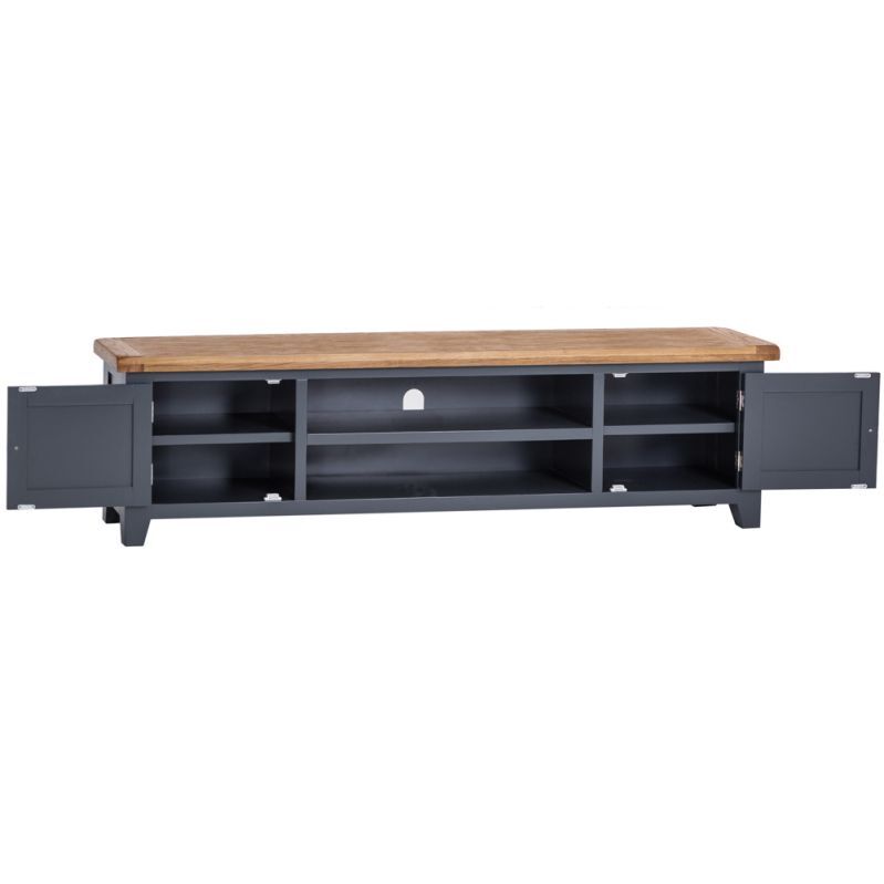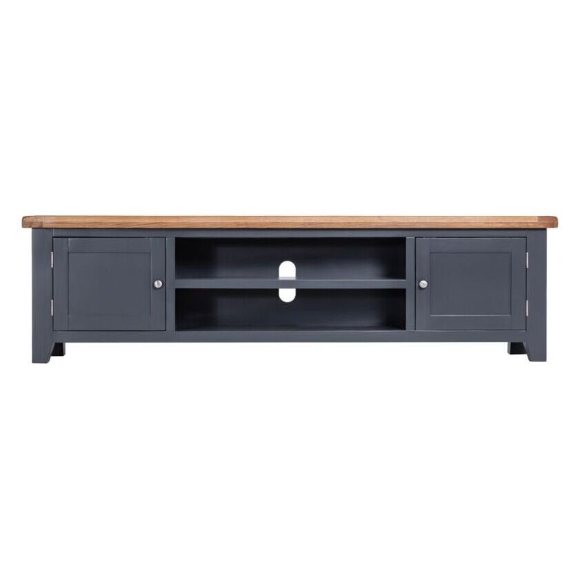 When you want to be able to rest and relax like never before, there’s no better option than treating yourself to our Hampshire Blue Painted Oak Extra Large TV Unit. It comes with a unique blue painted finish you can’t find anywhere else in our range, plus a thick oak top that will steal the show the moment it arrives. The chrome handles add a flourish of contemporary style to your TV Stand, and are the ideal way to transform the look and feel of any living room in seconds. Perfect for creating the relaxing little haven you’ll never want to leave. With the growing desire for Large TV Units to accomodate larger and larger TV's, this 180cm wide TV Cabinet has become extremely popular.