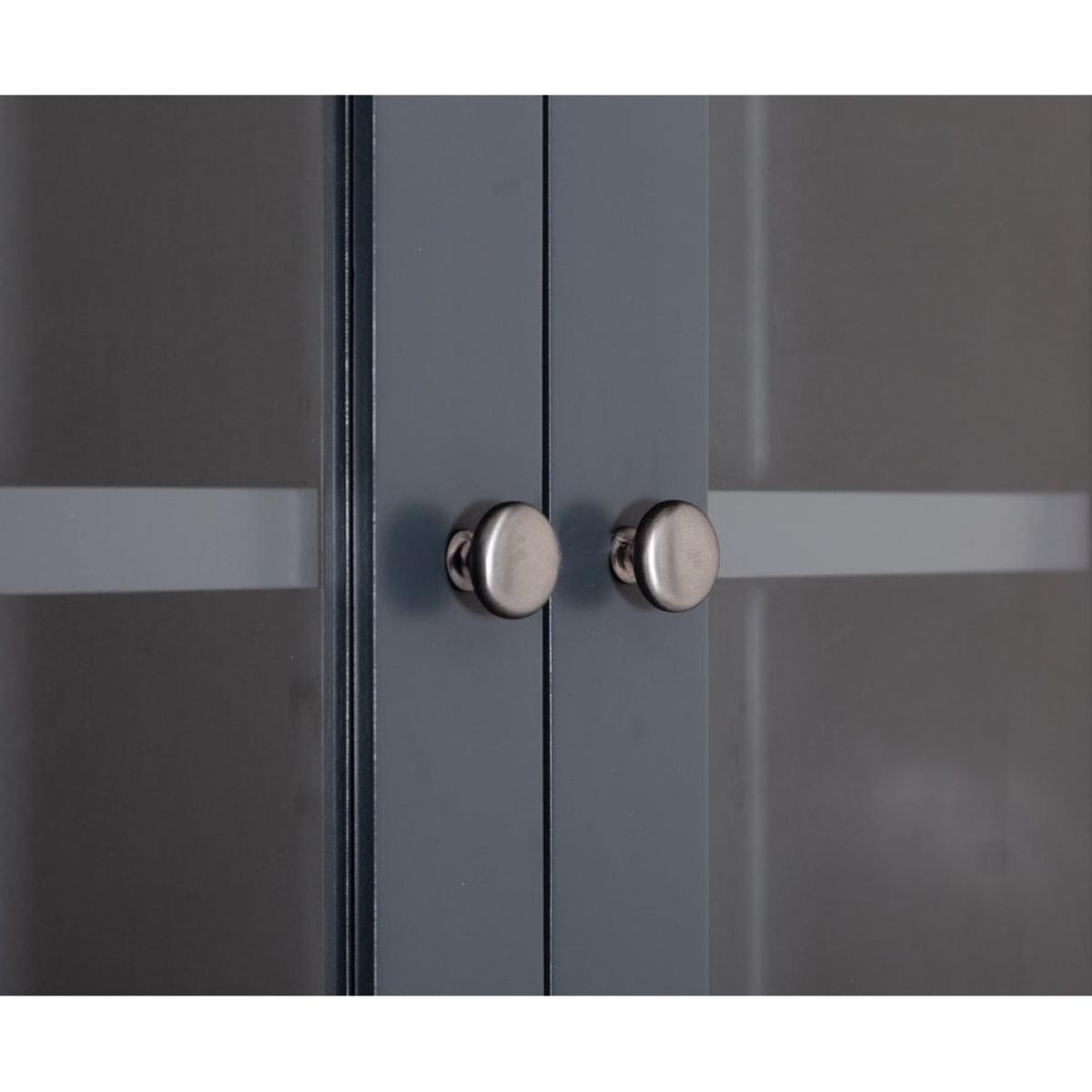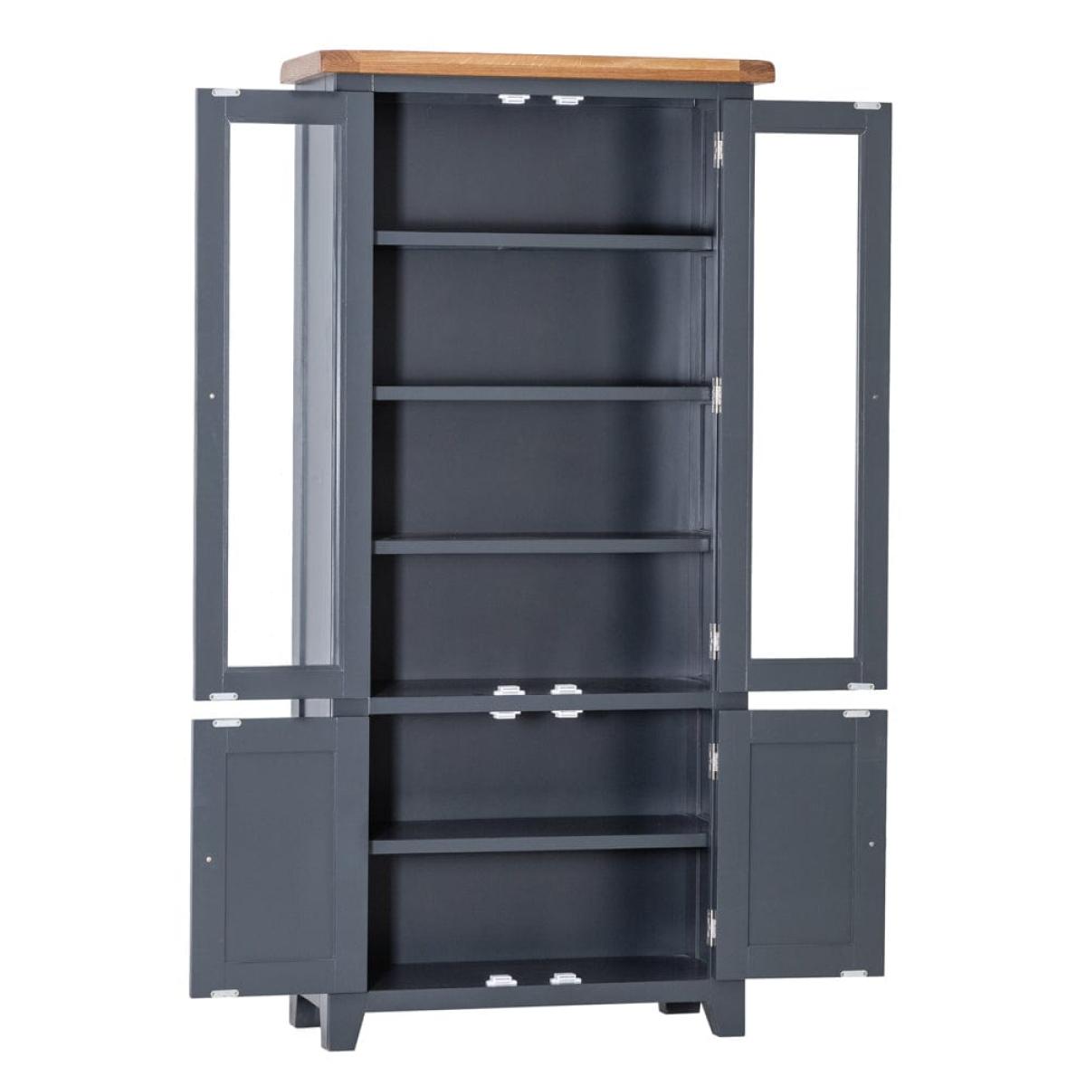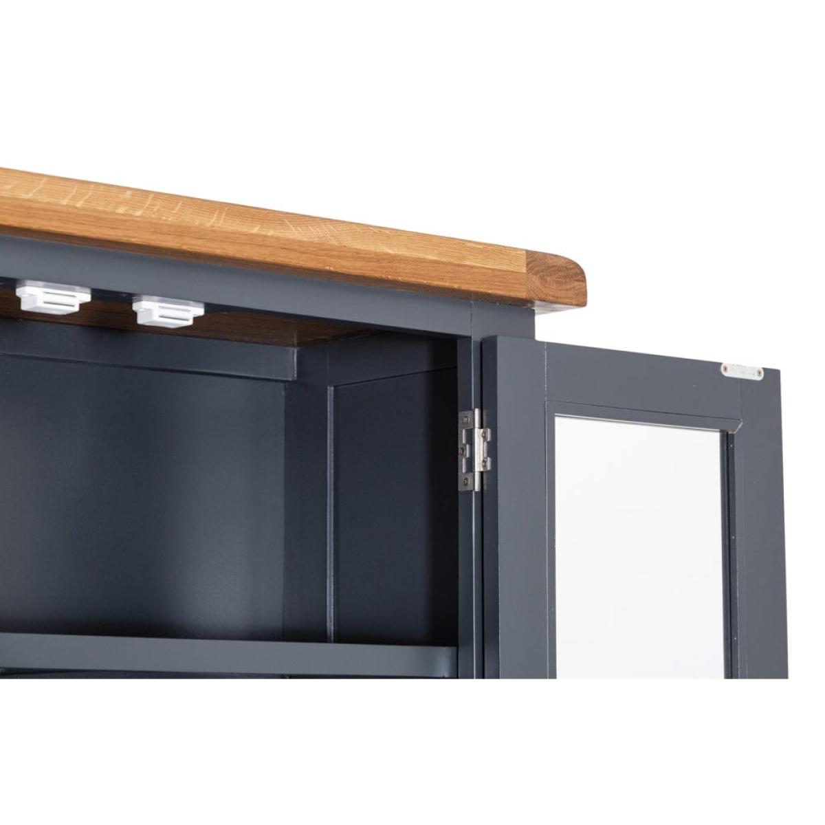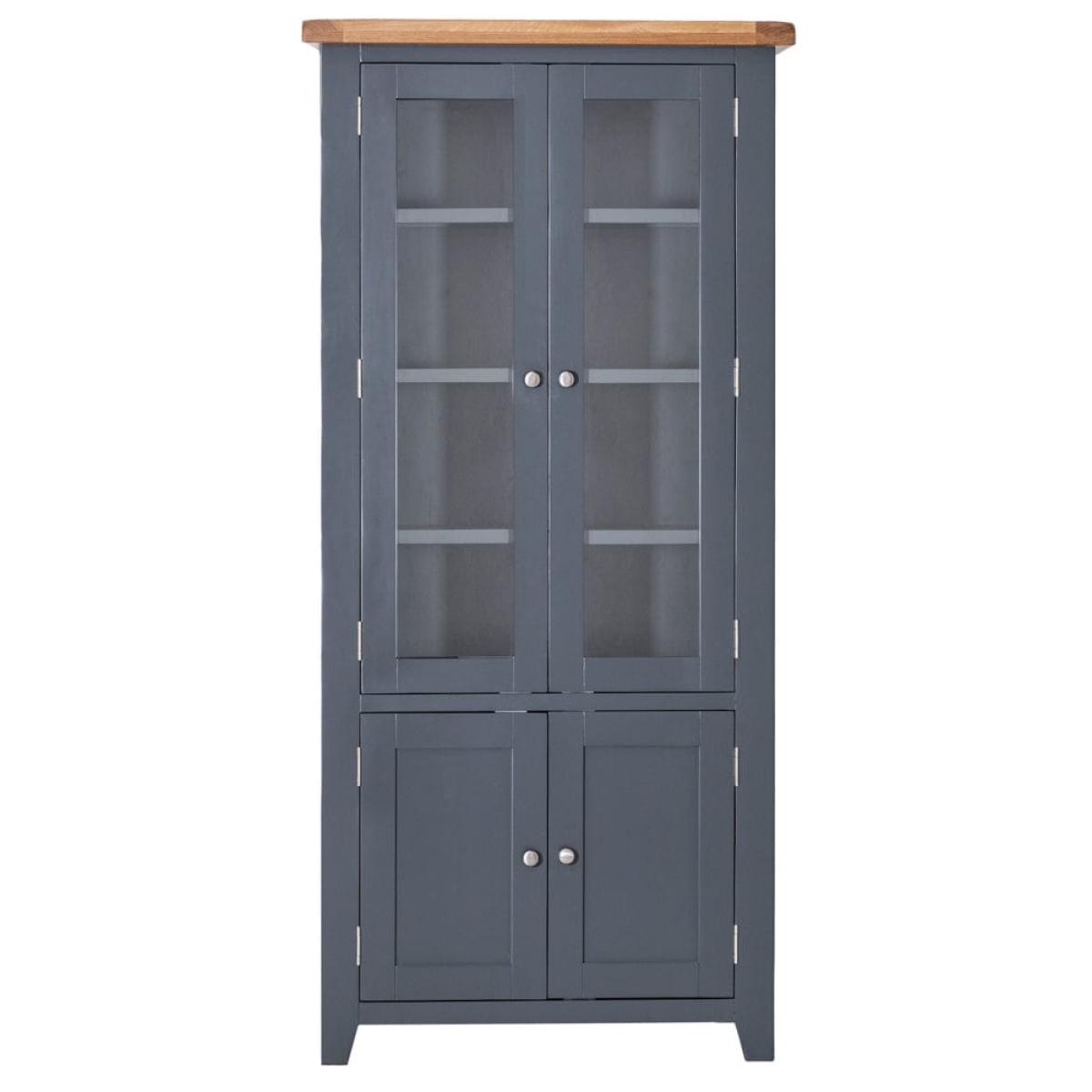 Transform any space with this Hampshire blue painted oak glass display cabinet. At 180cm high, it’s both a roomy storage solution and an attractive focal point in your living or dining room. Arrange your favourite ceramics and ornaments on the shelves and use the lower cupboard for table linens and napkins. Our serene blue is complemented by the natural oak top, to suit both modern and traditional homes. This display case has all the fine features you can expect from Chiltern Oak. The doors feature chrome knobs and exposed hinges, and the glass in the doors is tempered for safety and resilience.