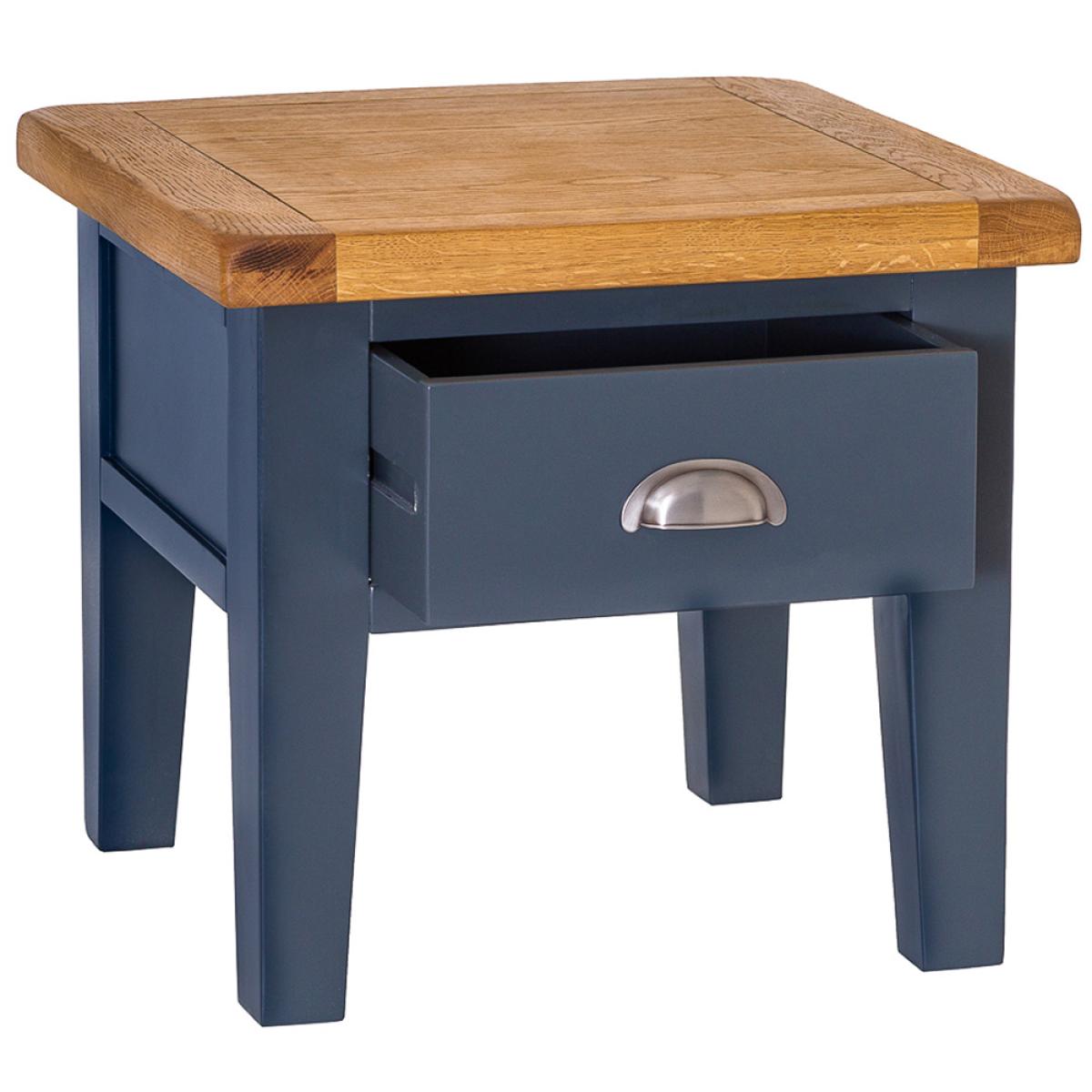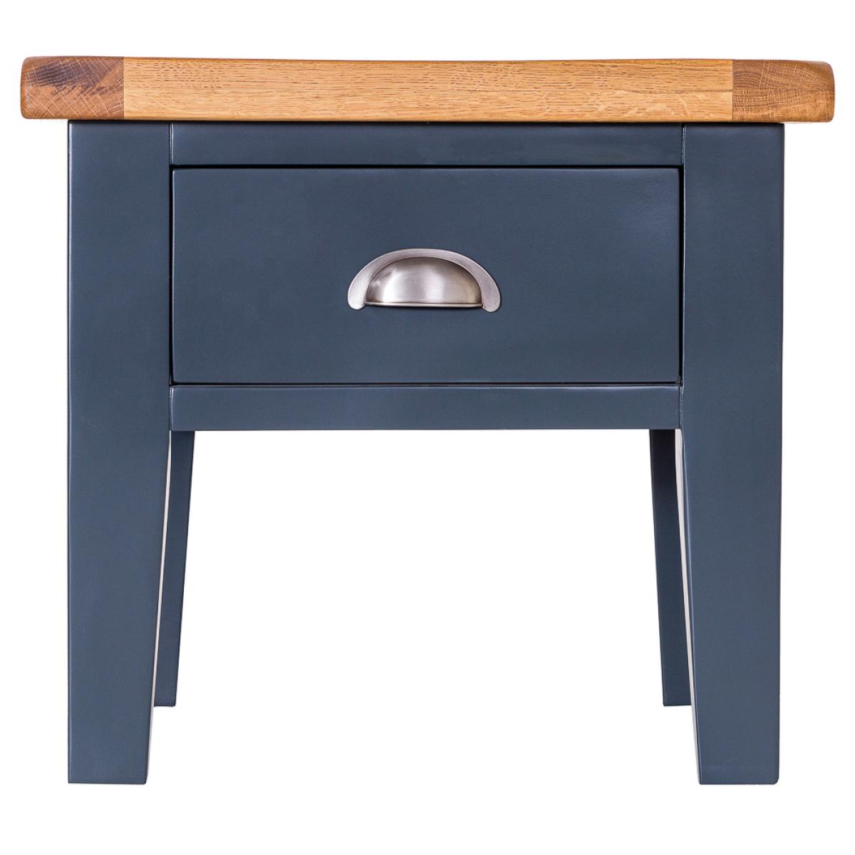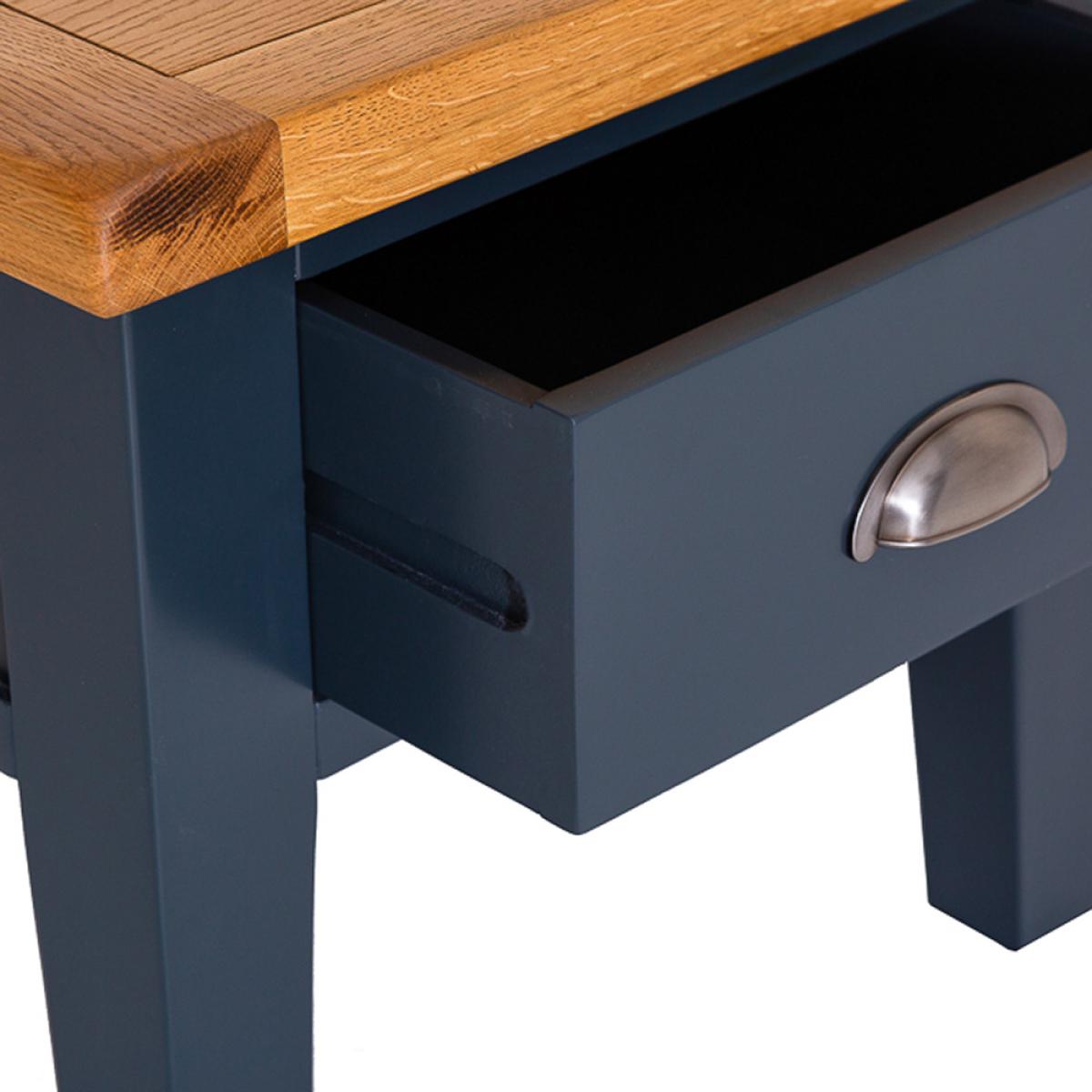 Adding those quaint little finishing touches is what turns a house into a home you can enjoy for a lifetime. Our Hampshire Blue Painted Oak Lamp Table works wonders in the living room, master bedroom, and even the open plan dining room. The single drawer offers plenty of storage space, and is beautifully accented by the contemporary brushed metal handle. Choose a matching lamp to sit atop the thick oak tabletop of the Side Table and you'll be able to add the perfect piece of interior design to your home. Just what you need when you're in the mood to treat yourself to something special.