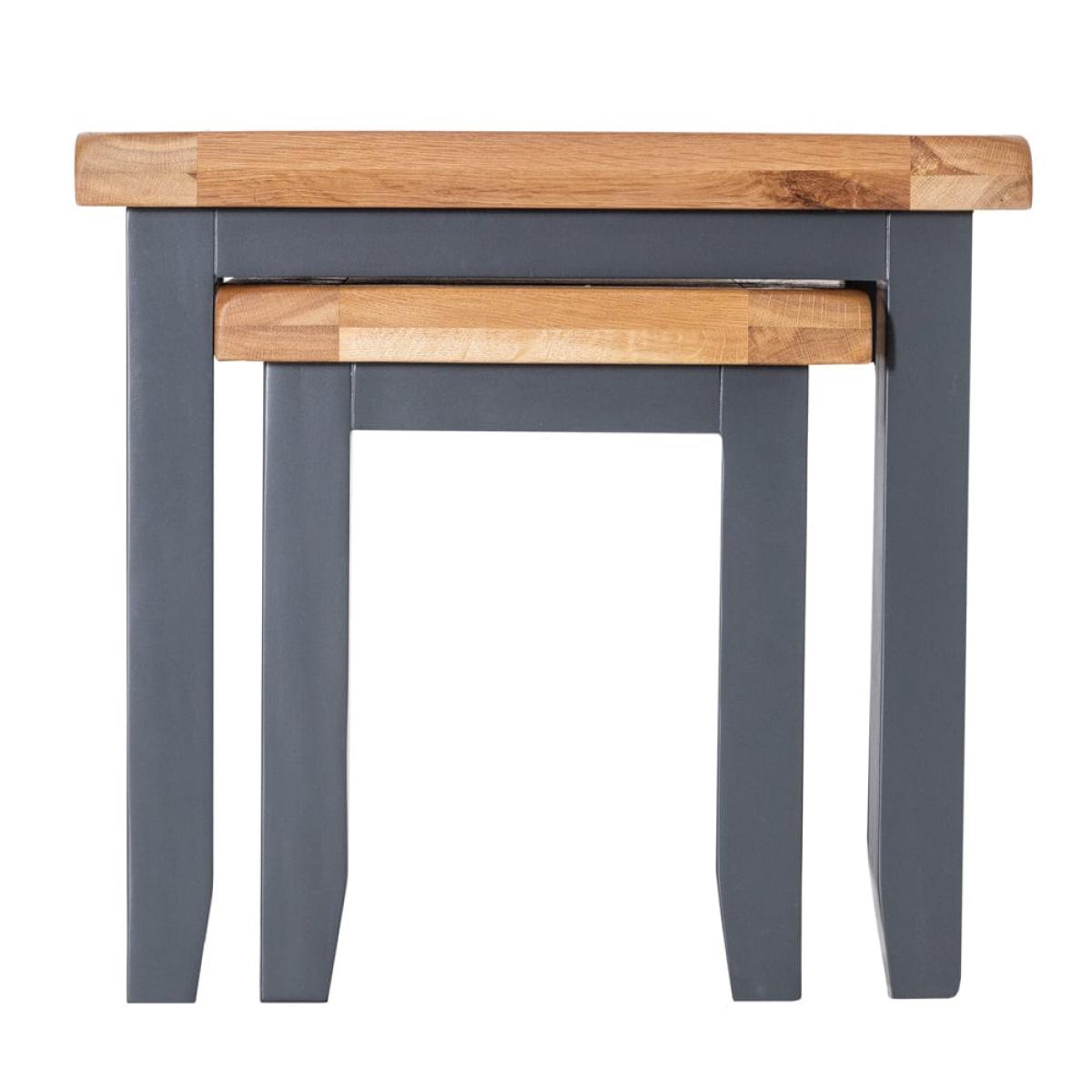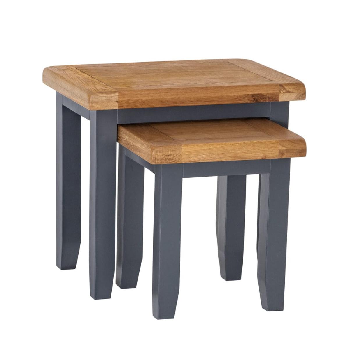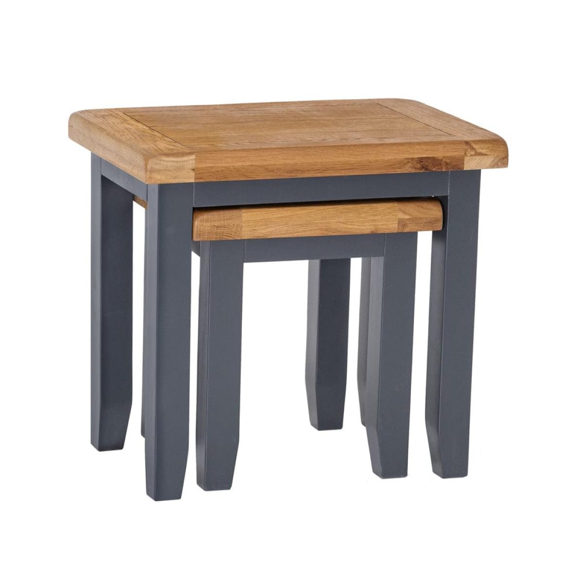 Double up on surface area with this clever Hampshire blue painted oak nest of 2 tables. The smaller table slots neatly under the larger one, so you can keep them together when space is limited and use them separately when you’re entertaining guests. Keep them on hand for drinks and snacks, or dress them with your favourite framed pics, candles and houseplants for a duet of elegant display tables. Our rich blue brings modern sophistication to any space, and the sturdy oak top adds a rustic touch. The silhouette is rounded off with tapered legs and softly shaped corners for a classic finish.