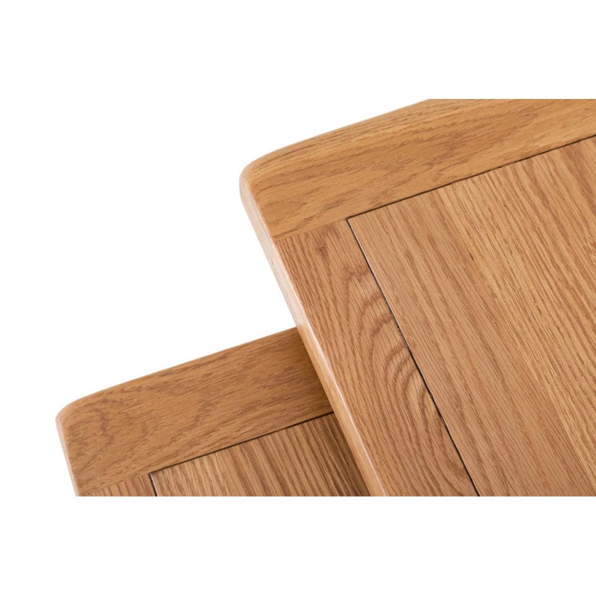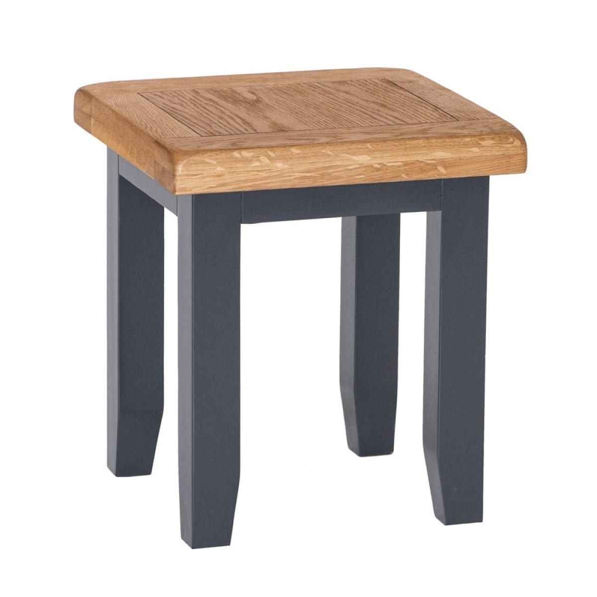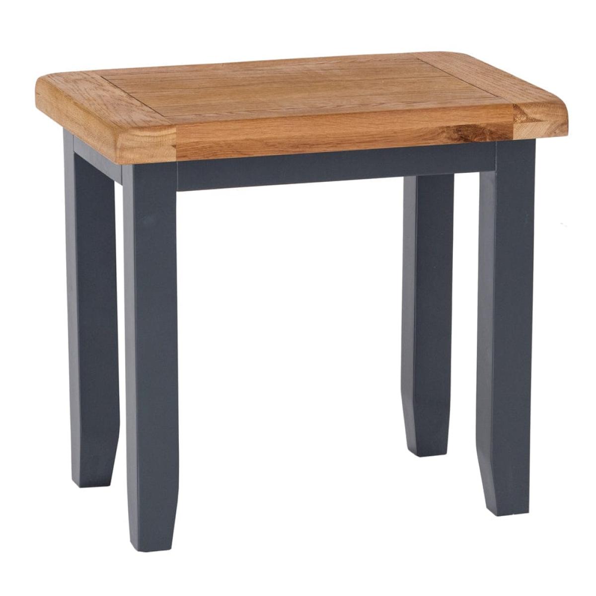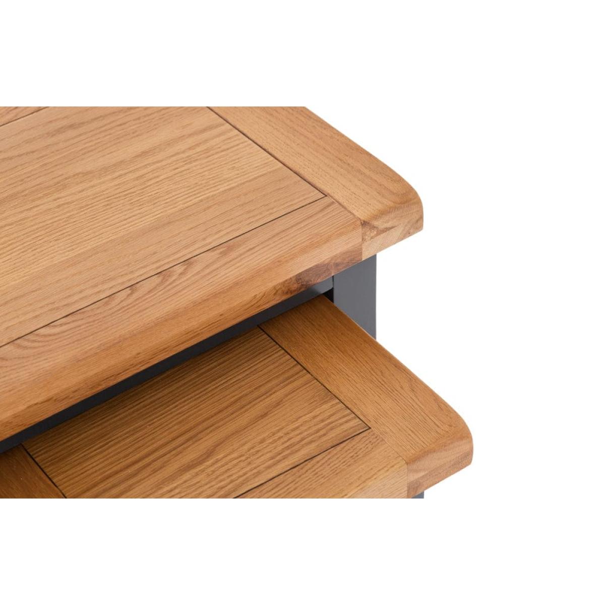 Double up on surface area with this clever Hampshire blue painted oak nest of 2 tables. The smaller table slots neatly under the larger one, so you can keep them together when space is limited and use them separately when you’re entertaining guests. Keep them on hand for drinks and snacks, or dress them with your favourite framed pics, candles and houseplants for a duet of elegant display tables. Our rich blue brings modern sophistication to any space, and the sturdy oak top adds a rustic touch. The silhouette is rounded off with tapered legs and softly shaped corners for a classic finish.