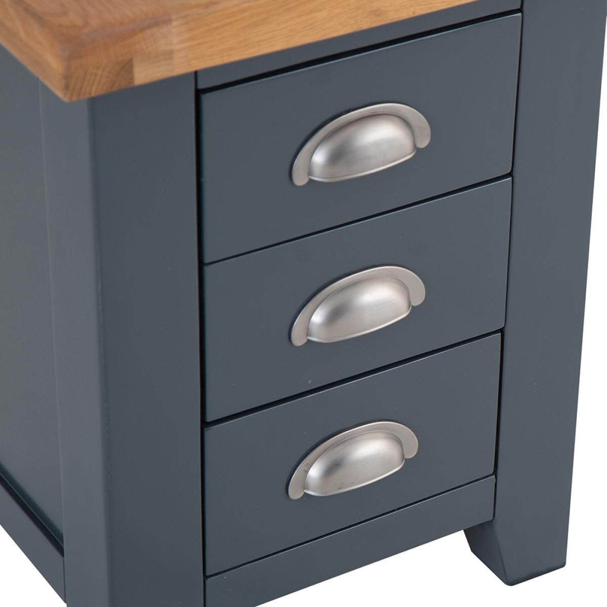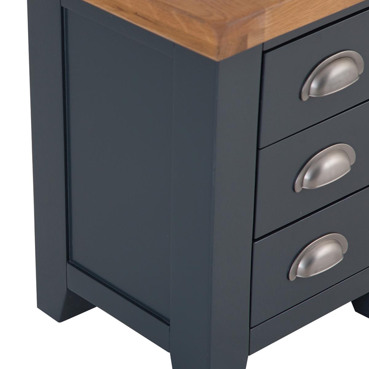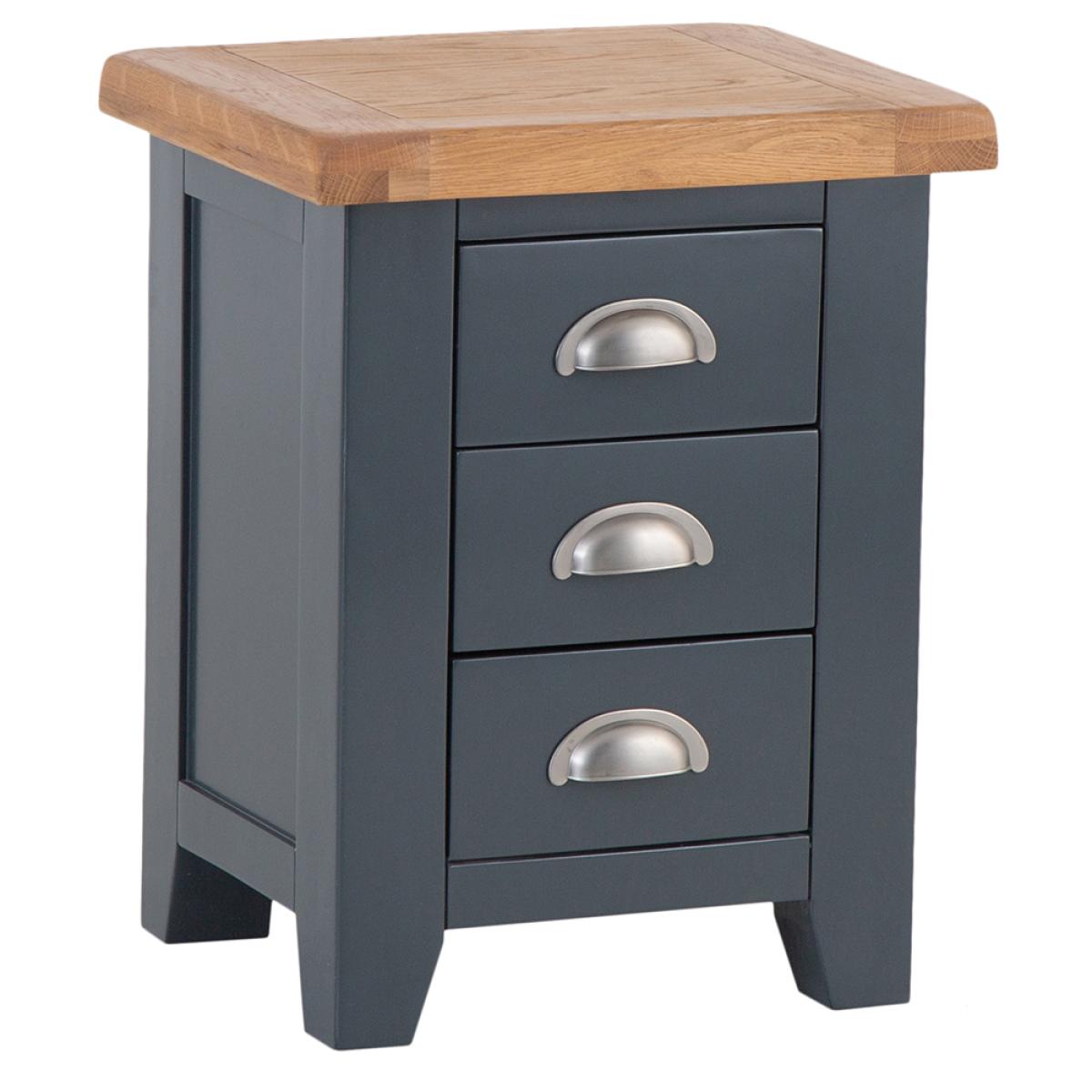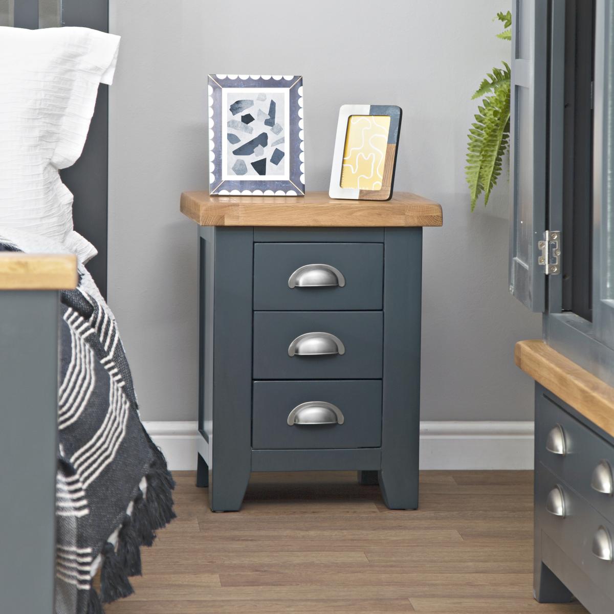 Turn the bedroom into the relaxing oasis where you can get away from it all with a little help from our signature Hampshire Blue Painted Oak Small 3 Drawer Bedside Table. The chunky frame is the perfect complement to the thick oak top, and gives the whole Bedside Cabinet a homely quality you'll admire the moment it arrives. Add the crisp and cool painted finish to the brushed metal handles the collection is known for, and you have a look that's the ideal blend of country and contemporary. All that's missing is a matching lamp to go on top, and you'll be ready for the best night's sleep you've had in years.