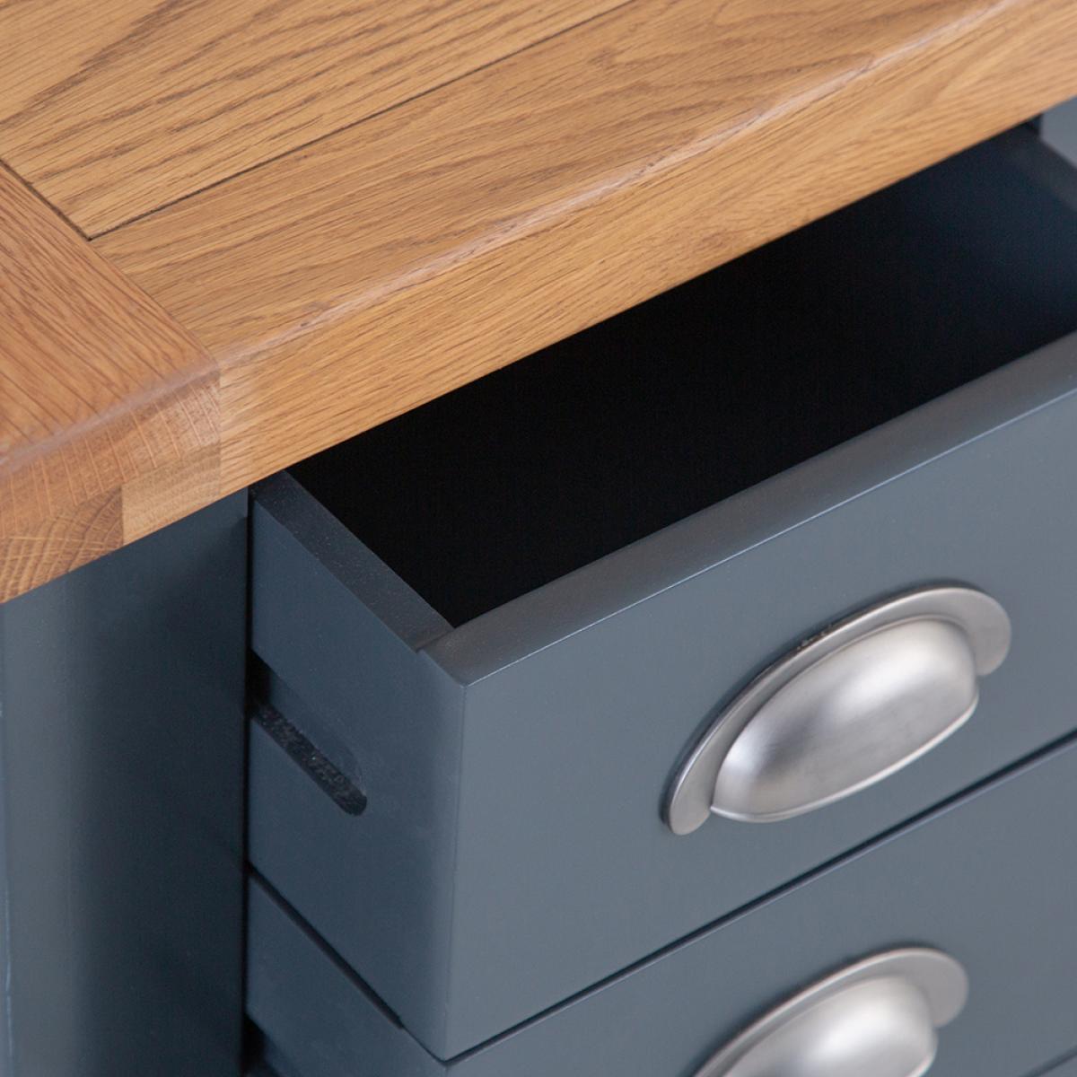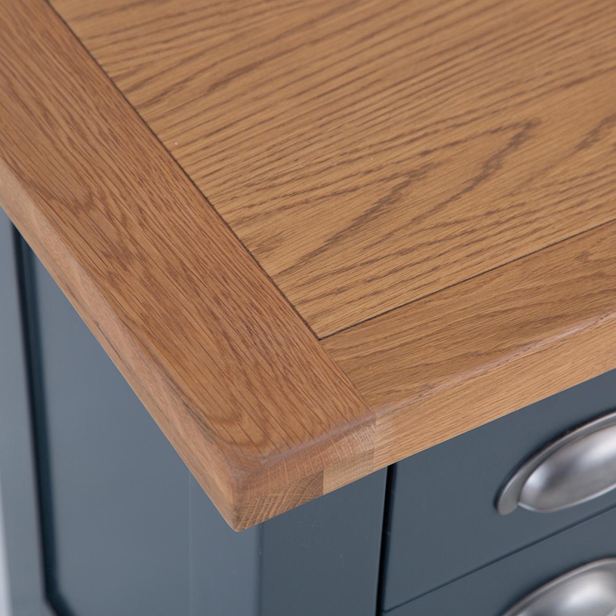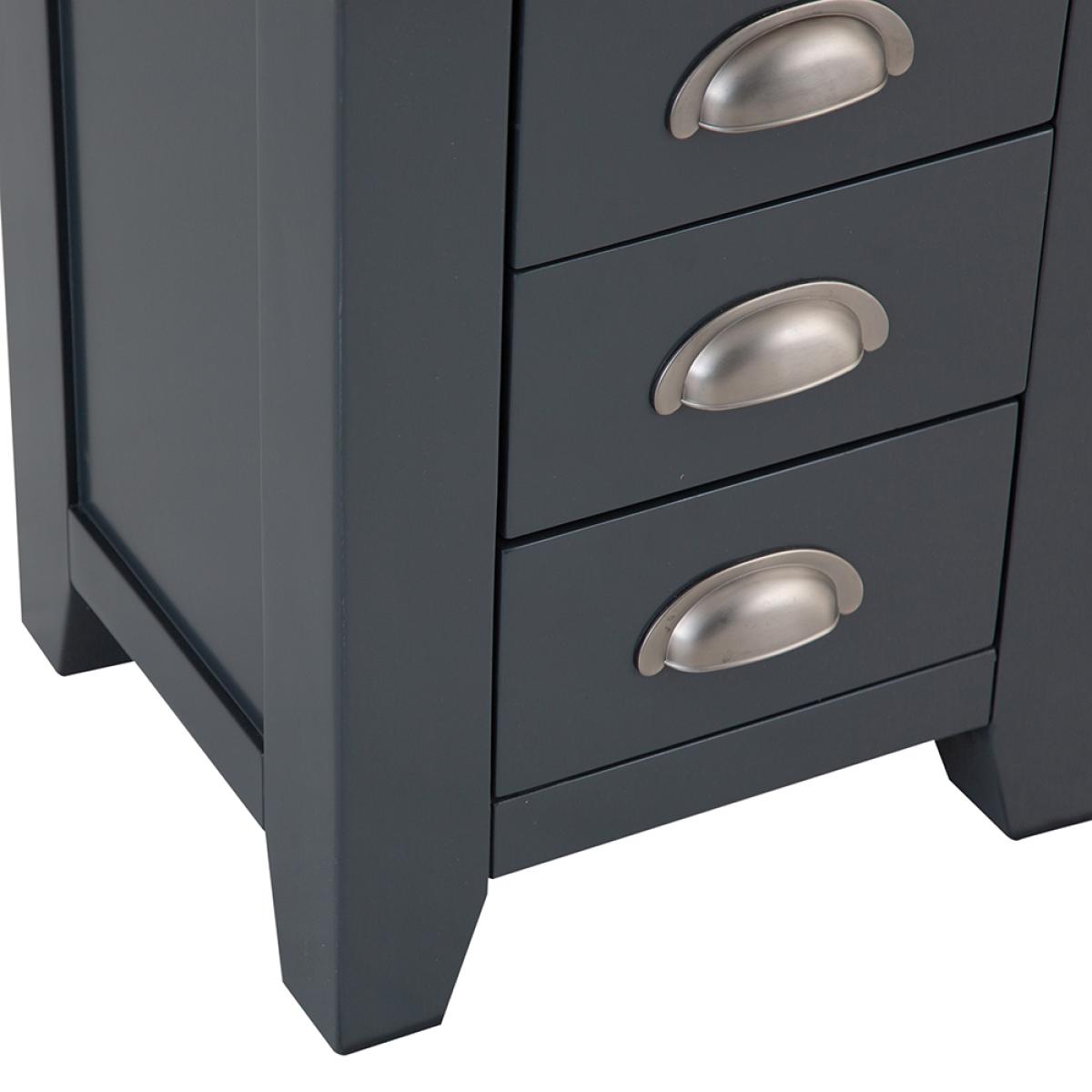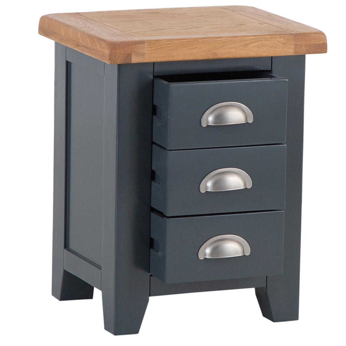 Turn the bedroom into the relaxing oasis where you can get away from it all with a little help from our signature Hampshire Blue Painted Oak Small 3 Drawer Bedside Table. The chunky frame is the perfect complement to the thick oak top, and gives the whole Bedside Cabinet a homely quality you'll admire the moment it arrives. Add the crisp and cool painted finish to the brushed metal handles the collection is known for, and you have a look that's the ideal blend of country and contemporary. All that's missing is a matching lamp to go on top, and you'll be ready for the best night's sleep you've had in years.