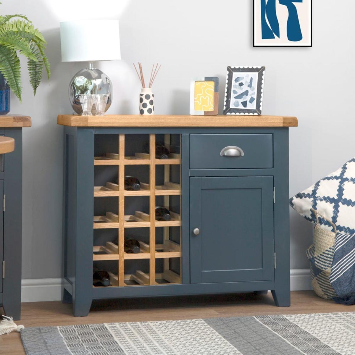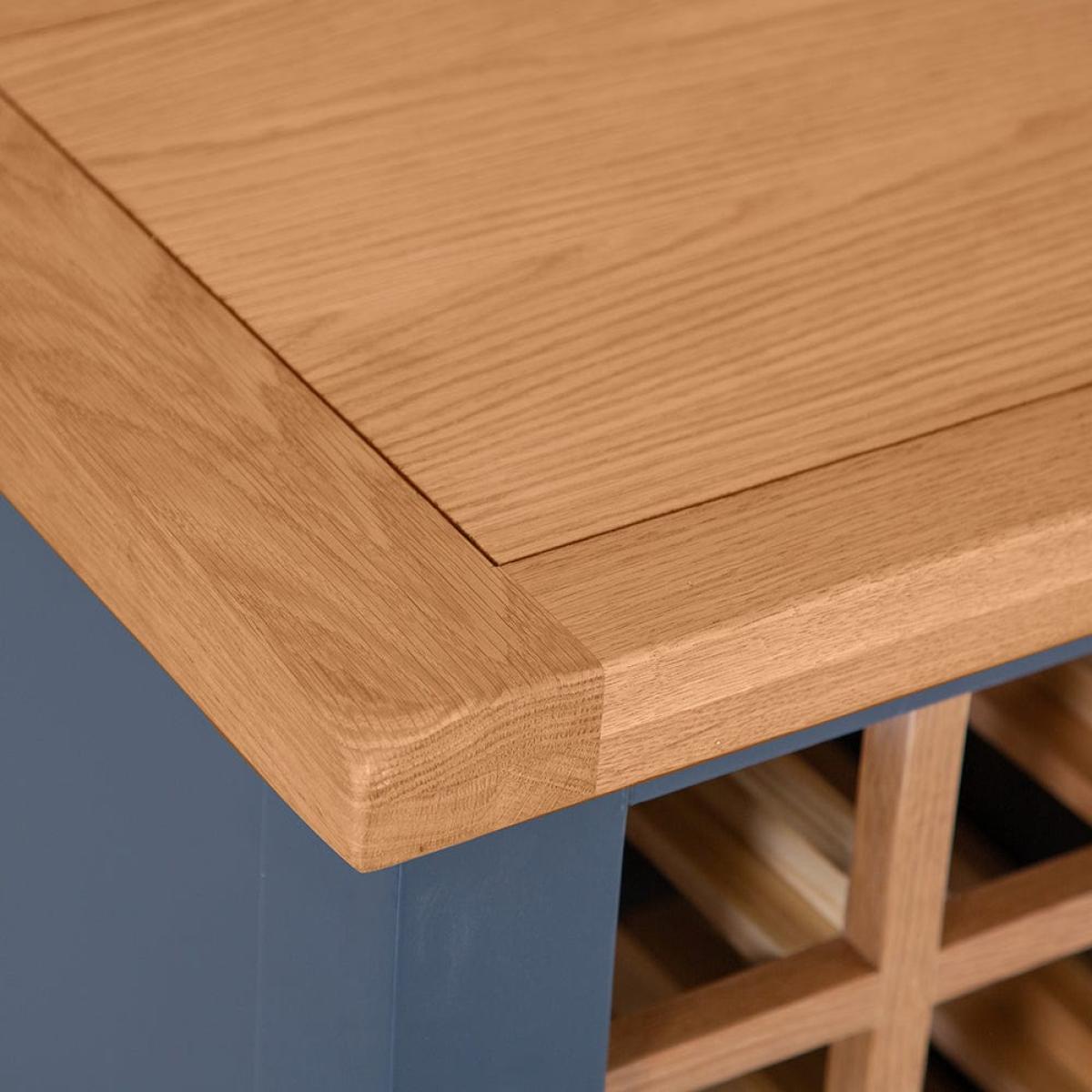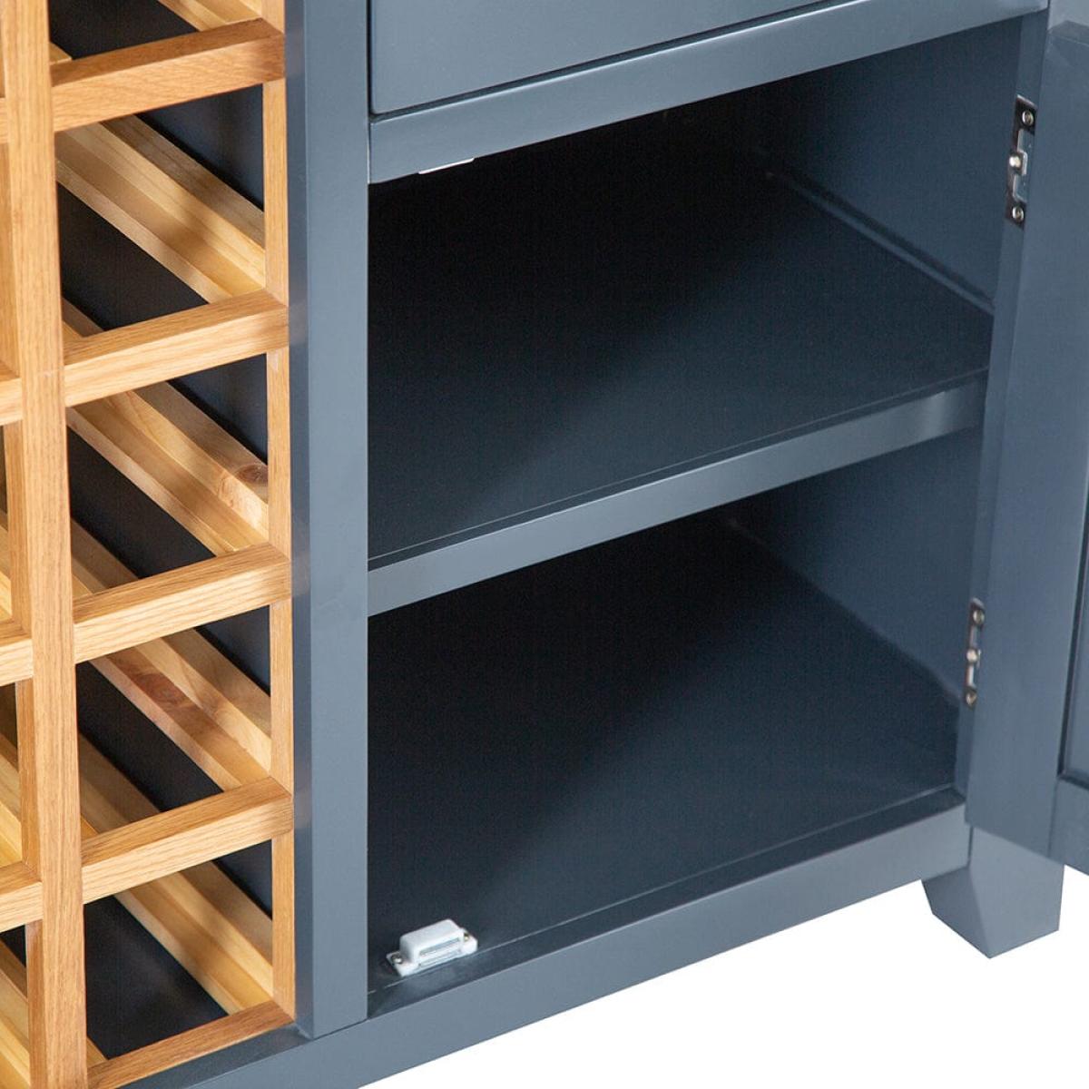 Keep this Hampshire blue painted oak small sideboard wine rack in your dining room or kitchen for essential extra storage as well as an attractive centrepiece. It can hold up to 15 bottles to keep you in sure supply whenever you’re entertaining friends, and the cupboard is ideal for wine glasses, decanters and jugs. The natural oak top is the perfect surface for showcasing your favourite decorative objects or very best tableware, while the rich navy finish brings timeless sophistication into your home. The collection’s signature tapered legs add a touch of refinement to the sturdy silhouette.