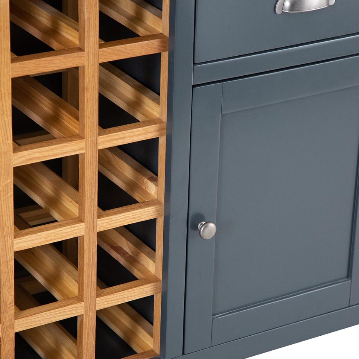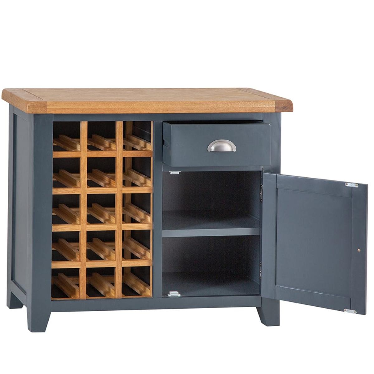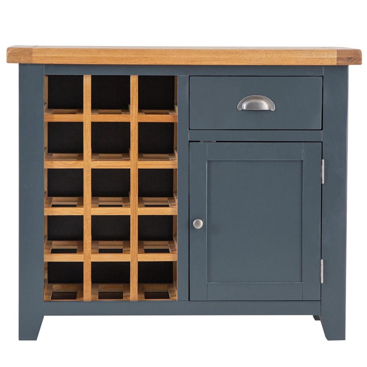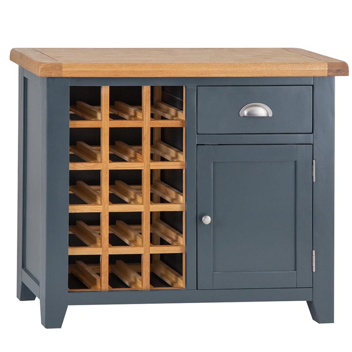 Keep this Hampshire blue painted oak small sideboard wine rack in your dining room or kitchen for essential extra storage as well as an attractive centrepiece. It can hold up to 15 bottles to keep you in sure supply whenever you’re entertaining friends, and the cupboard is ideal for wine glasses, decanters and jugs. The natural oak top is the perfect surface for showcasing your favourite decorative objects or very best tableware, while the rich navy finish brings timeless sophistication into your home. The collection’s signature tapered legs add a touch of refinement to the sturdy silhouette.