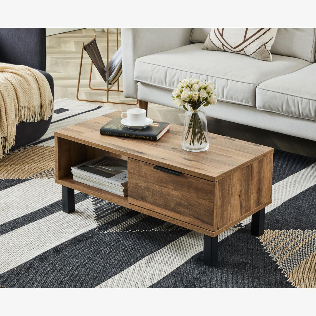 This Hampshire Coffee Table offers a perfect match for your living room with a modern oak finish and contrasting black metal legs and handles. It's easy to assemble and clean for convenience and will add a sophisticated finishing touch to your living room. The coffee table has plenty of storage space on the shelf, drawer, and tabletop, helping to keep your space organised. The oak finish also makes this easy to coordinate with your existing furniture and decor.