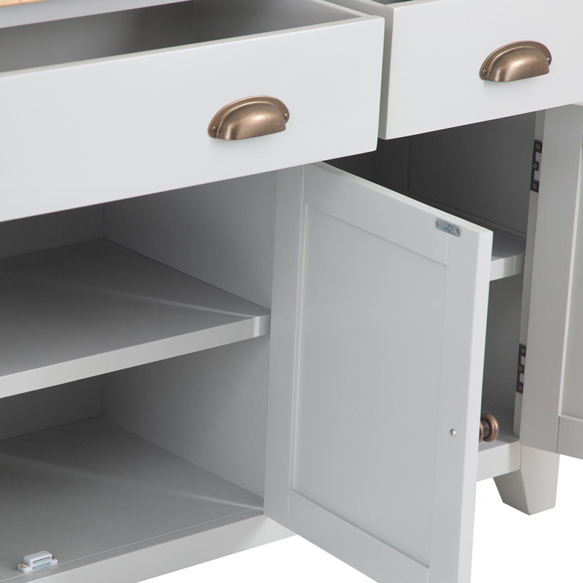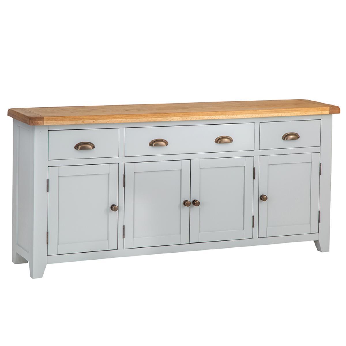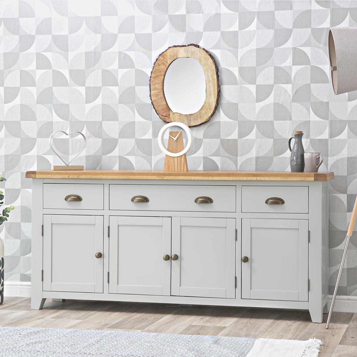 When stylish storage is all that matters, the Hampshire Grey Painted Oak 4 Door Sideboard is the homely touch you’ve been looking for. A combination of artisan drawers and expertly fitted brass finished handles make for a Storage Unit you’ll be proud to call your own the moment it arrives. With 2-man delivery included as standard you’ll be able to decide where you want it, and then have someone else take care of all the hard work. Perfect for sitting back and enjoying the contrast between the rustic oak and the grey painted finish. All you need to do now is decide what you want taking pride of place on the top.