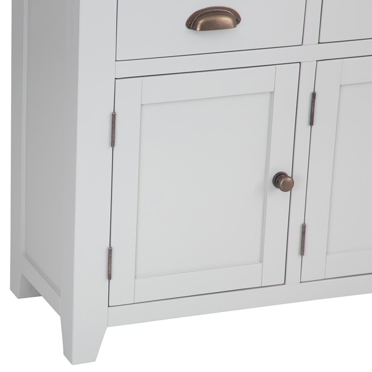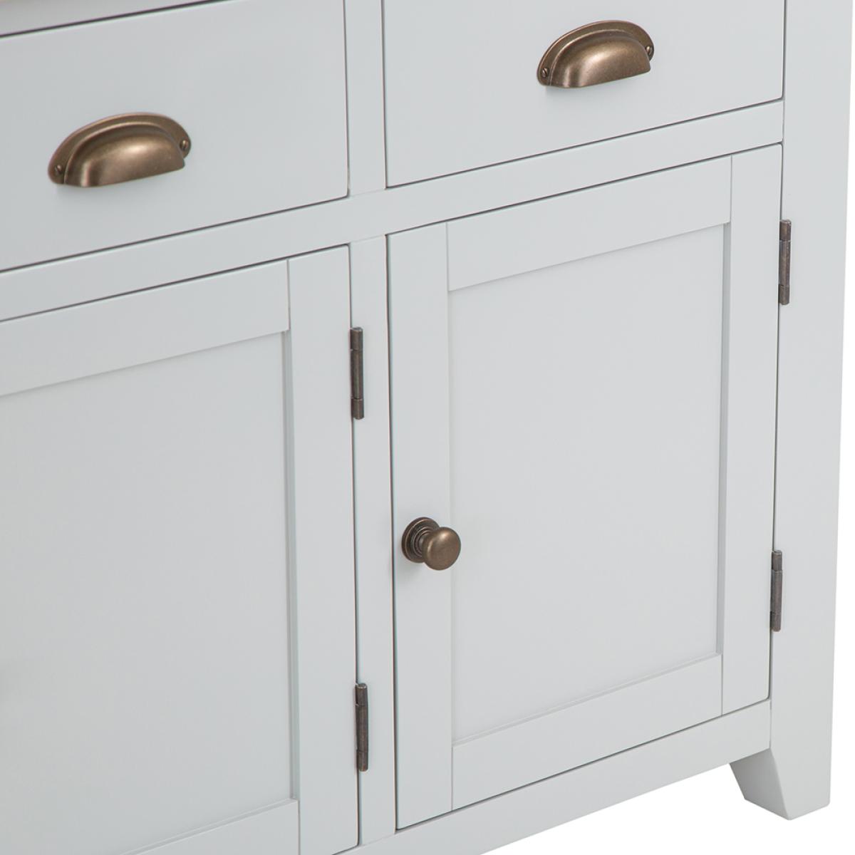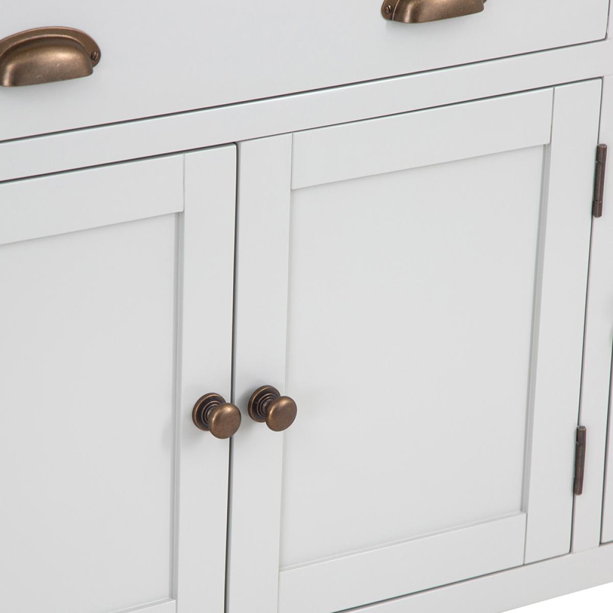 When stylish storage is all that matters, the Hampshire Grey Painted Oak 4 Door Sideboard is the homely touch you’ve been looking for. A combination of artisan drawers and expertly fitted brass finished handles make for a Storage Unit you’ll be proud to call your own the moment it arrives. With 2-man delivery included as standard you’ll be able to decide where you want it, and then have someone else take care of all the hard work. Perfect for sitting back and enjoying the contrast between the rustic oak and the grey painted finish. All you need to do now is decide what you want taking pride of place on the top.