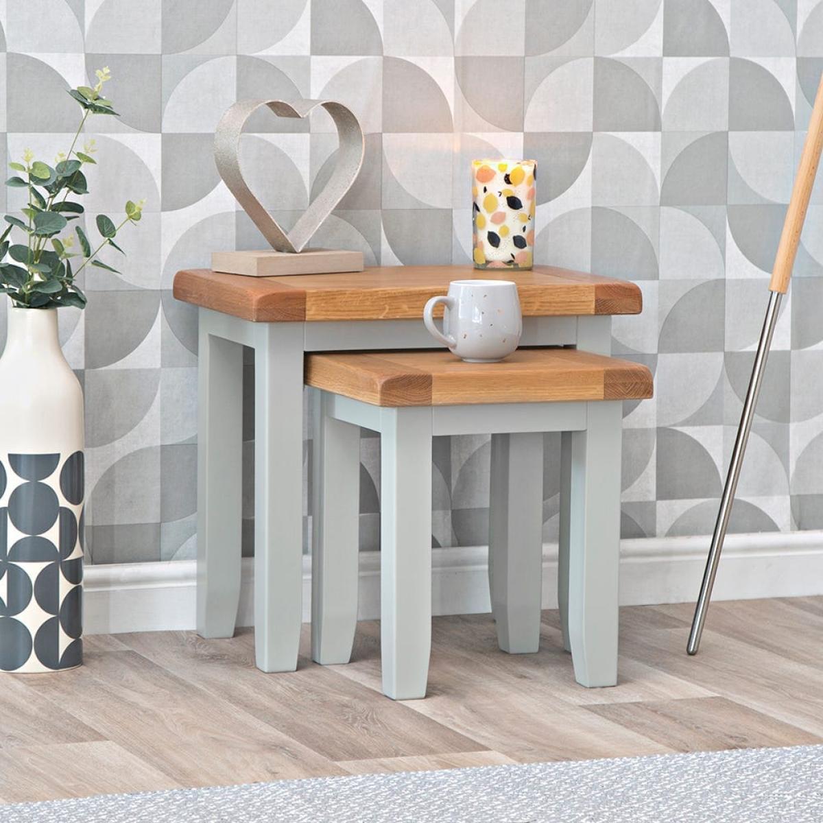 This Hampshire grey painted oak nest of 2 tables makes the perfect double act. Each one is finished in our elegant pale grey, with the natural oak top adding a traditional farmhouse-style touch. Split them up whenever you’re hosting guests to keep drinks and snacks within easy reach of sofas and armchairs. The smaller table slots neatly beneath the larger one, so you can reclaim your floorspace when they’re no longer needed. Alternatively, use these tables as separate complementary display stands for candles, photos and ornaments. The tapered legs, smooth tops and rounded corners bring a stylish soft finish to enhance any space.