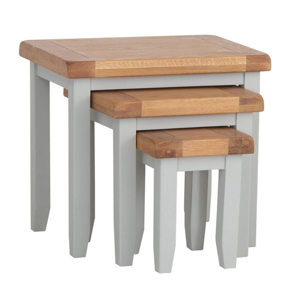 Gain a triple helping of surface space with our Hampshire grey painted oak nest of 3 tables. Our clean grey hue brings a breath of fresh air to any living area, and the natural oak tops add rustic appeal. Tapered legs and rounded corners add a soft finish to the chunky frames. Use this terrific trio as separate occasional tables for hot drinks and teatime treats when friends and family visit. The tables nest neatly together, so you can reclaim some space when your guests have departed. You can also use them in different areas of your home as display tables for your favourite ornaments.