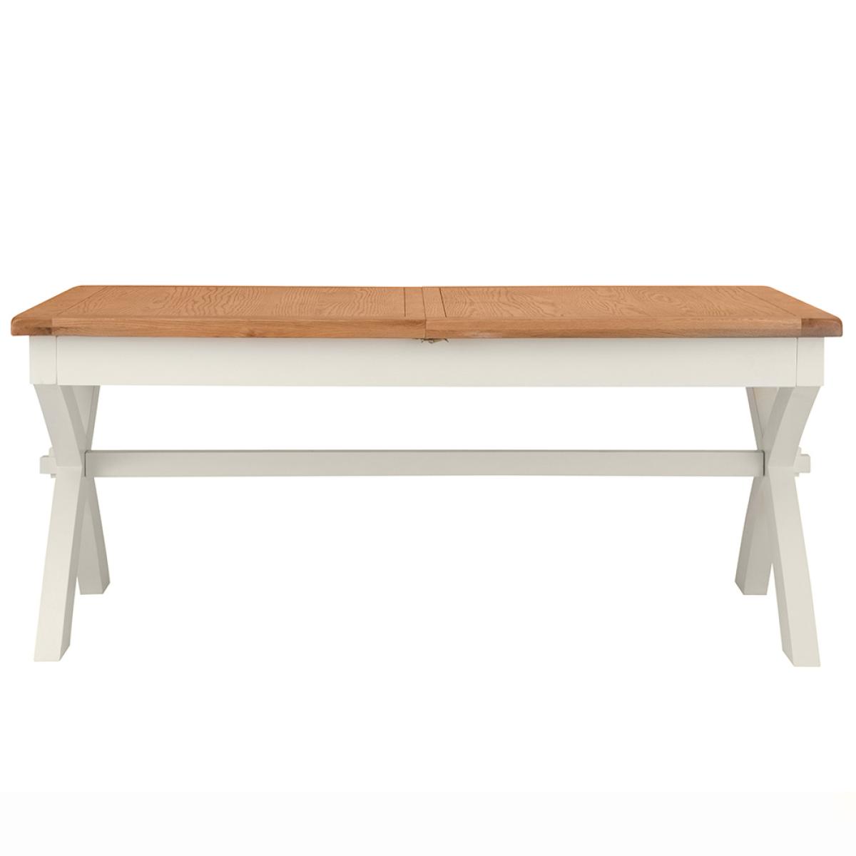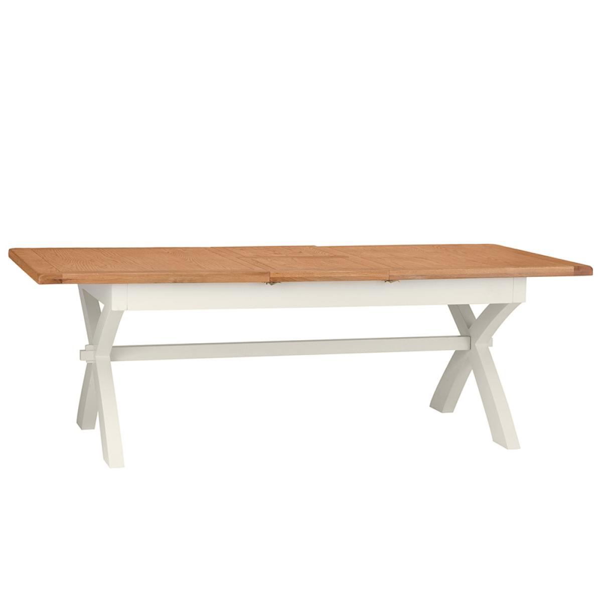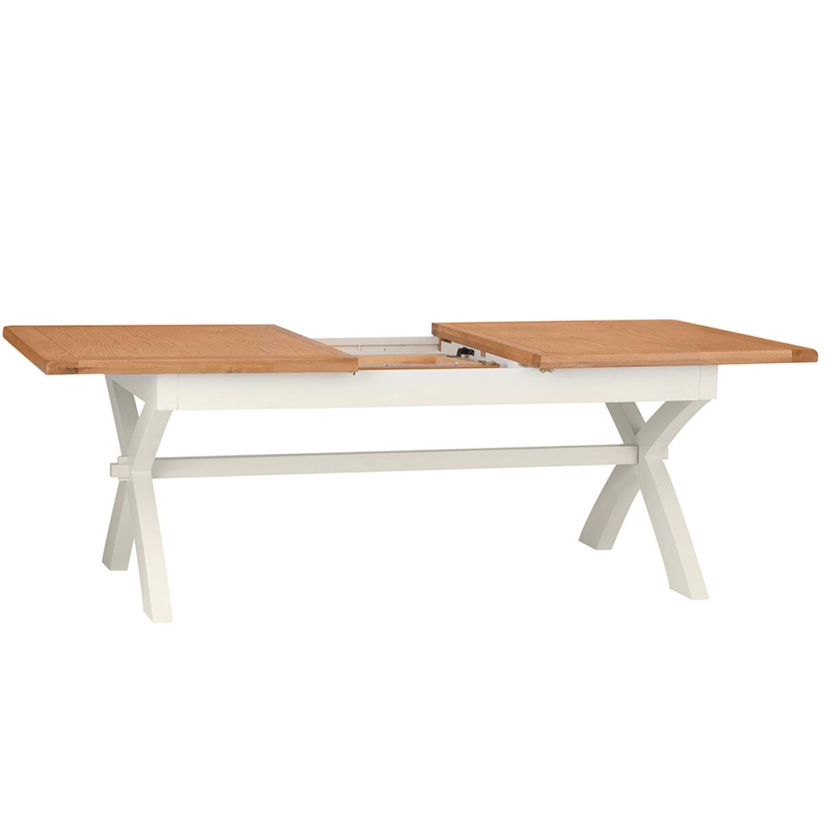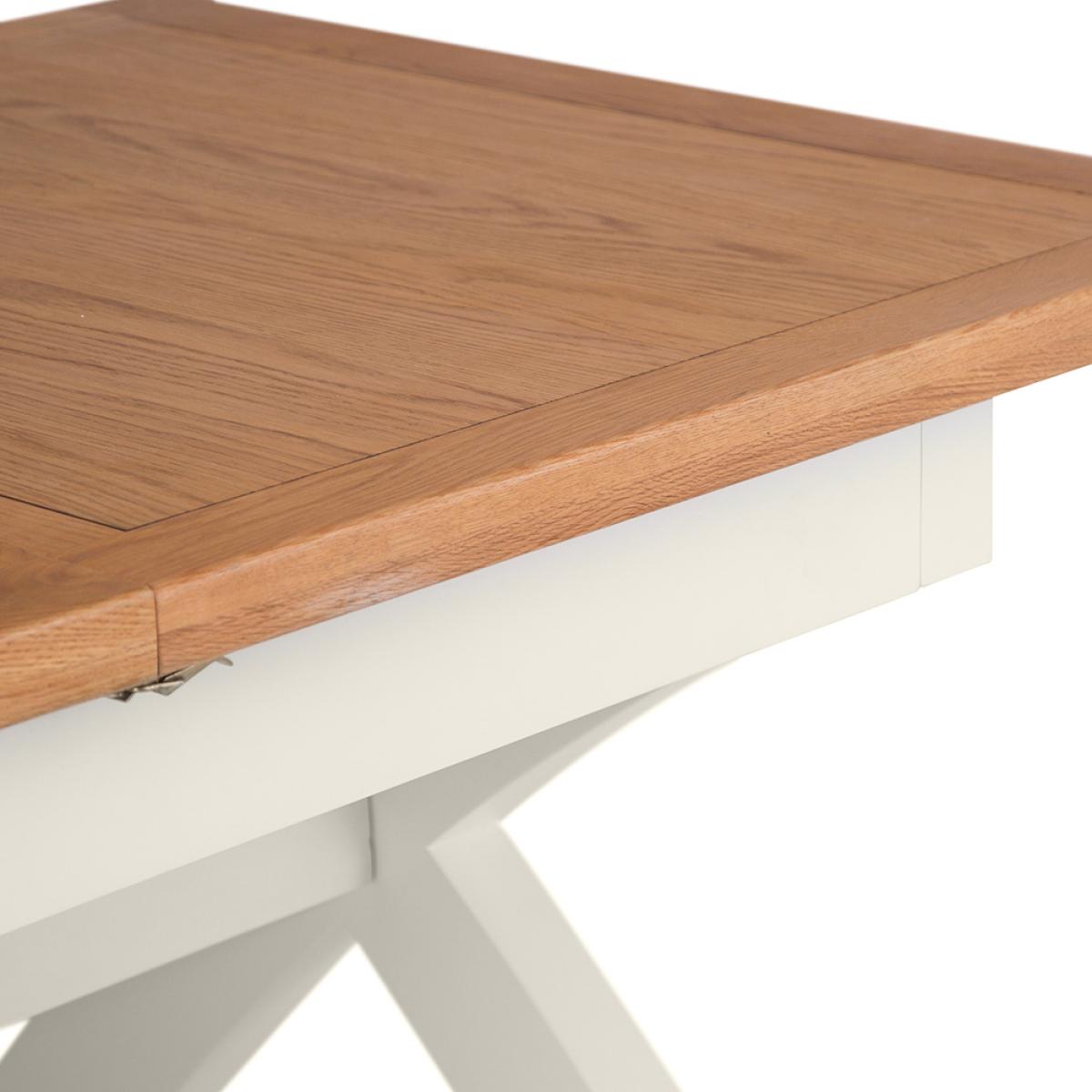 Seating your guests is all about providing a backdrop that puts them at ease whilst also building excitement about what lies ahead. Our Hampshire Ivory Painted Oak 1. 8m Cross Extending Table is the perfect way to make a statement in the dining room that will have everyone excited to tuck into their first course. The expertly ap-plied ivory painted finish sets the tone for the whole room, whilst the chunky oak top is the classic homage to the farmhouse style we all know and love. Thanks to the smooth extender built into your new Dining Table you’ll be able to cater for the whole family with ease.