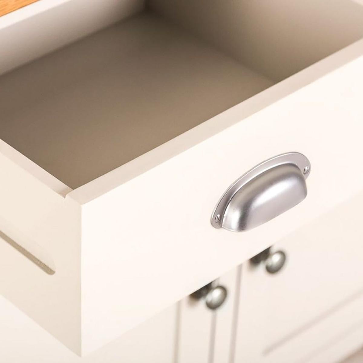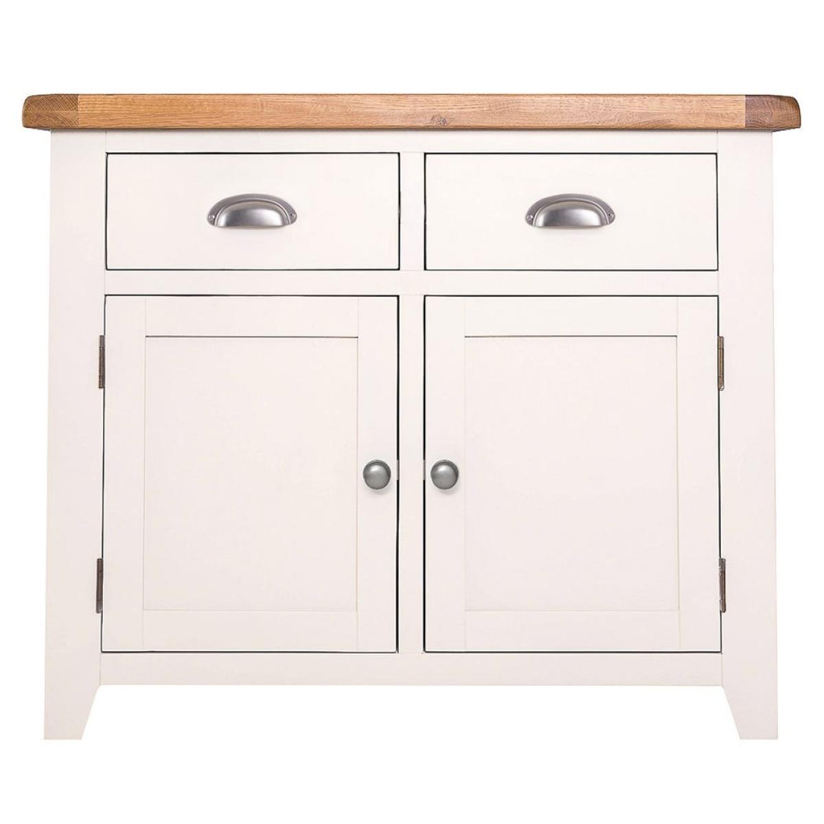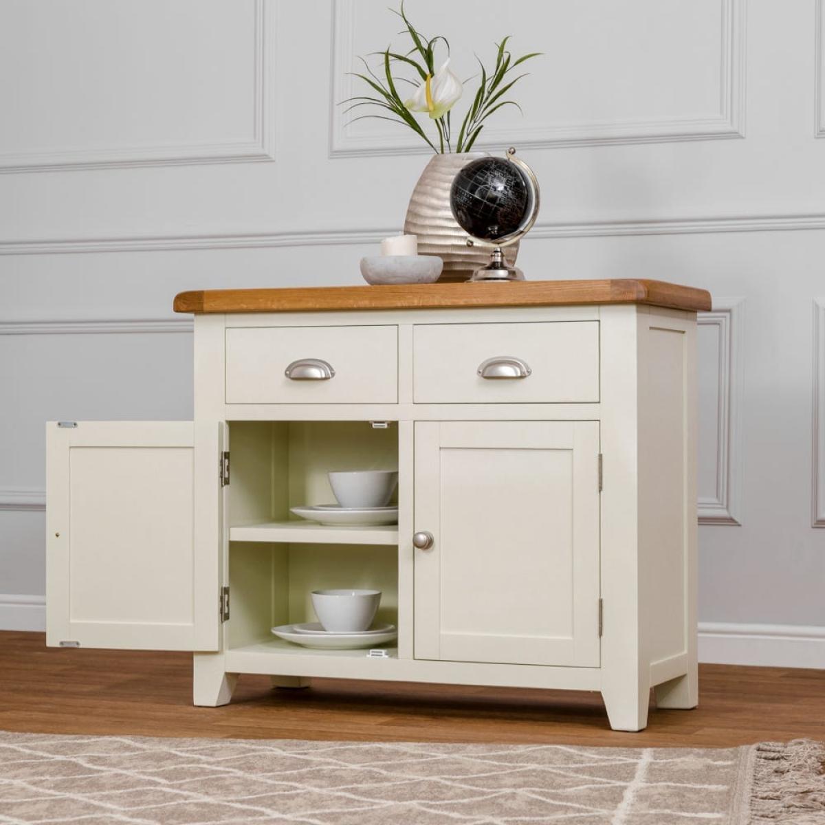 Keep your best crockery and serving dishes safely stowed with this Hampshire ivory painted oak 2-door small sideboard. It’s compact enough to slot neatly into your kitchen, dining room or living area, providing essential extra storage space for tableware and serving utensils – or for the kids’ games and toys. Our warm ivory colourway evokes all the romance of a summer wedding, and the chrome door knobs, cup handles and exposed hinges bring a modern edge. The complementary oak tabletop adds our signature rustic touch and makes the perfect surface for showcasing your favourite ornaments, table lamps and houseplants.