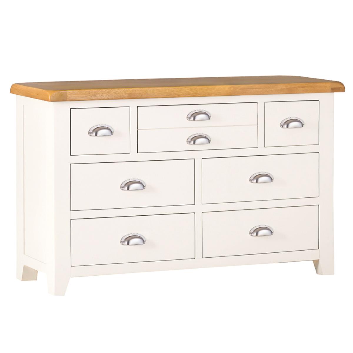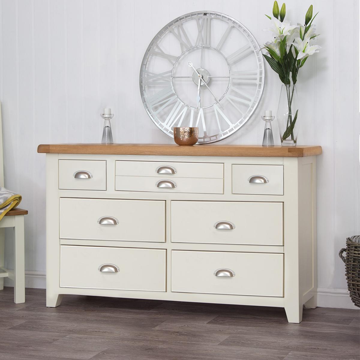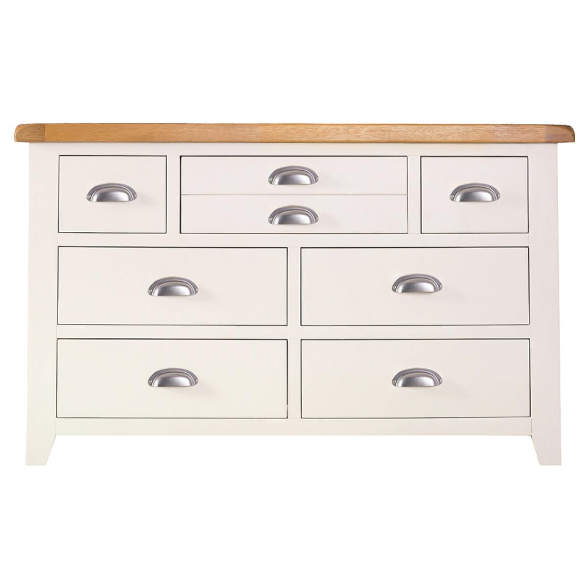 The eclectic look of the Hampshire Ivory Painted Oak 3 Over 4 Chest is achieved by the unique look of the 4 small upper drawers. They have a country charm that can be so hard to find with modern furniture, and the cupped metal handles add to the picture. For us the personal highlight has to be the way the thick ivory painted frame contrasts so effortlessly with the chunky oak top that sits above it. If you're looking for a Chest of Drawers that can act as a secondary focal point in any style of room, look no further.