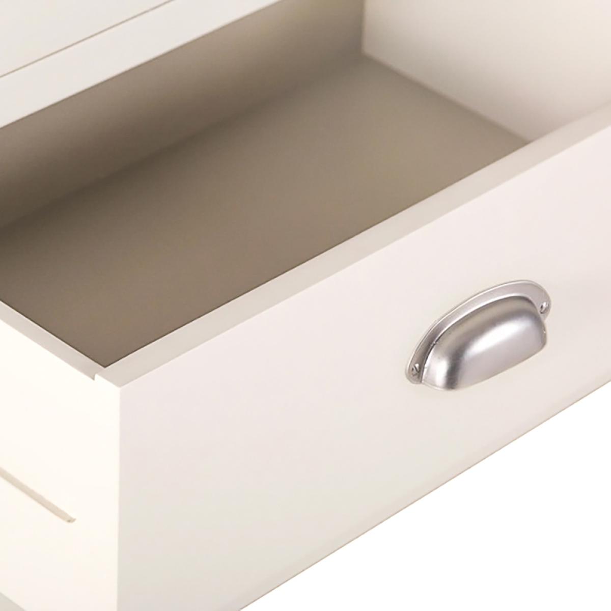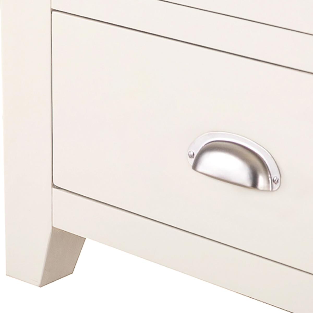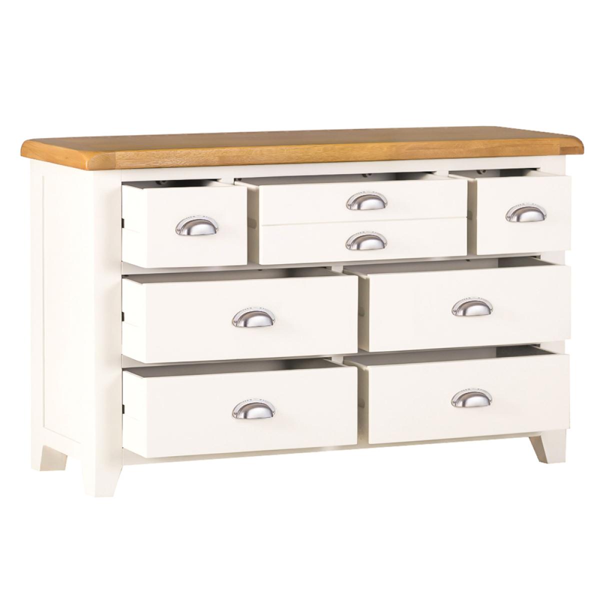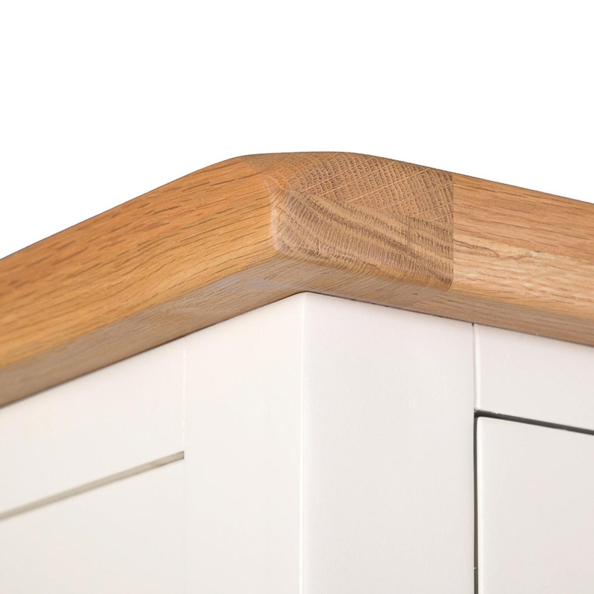 The eclectic look of the Hampshire Ivory Painted Oak 3 Over 4 Chest is achieved by the unique look of the 4 small upper drawers. They have a country charm that can be so hard to find with modern furniture, and the cupped metal handles add to the picture. For us the personal highlight has to be the way the thick ivory painted frame contrasts so effortlessly with the chunky oak top that sits above it. If you're looking for a Chest of Drawers that can act as a secondary focal point in any style of room, look no further.