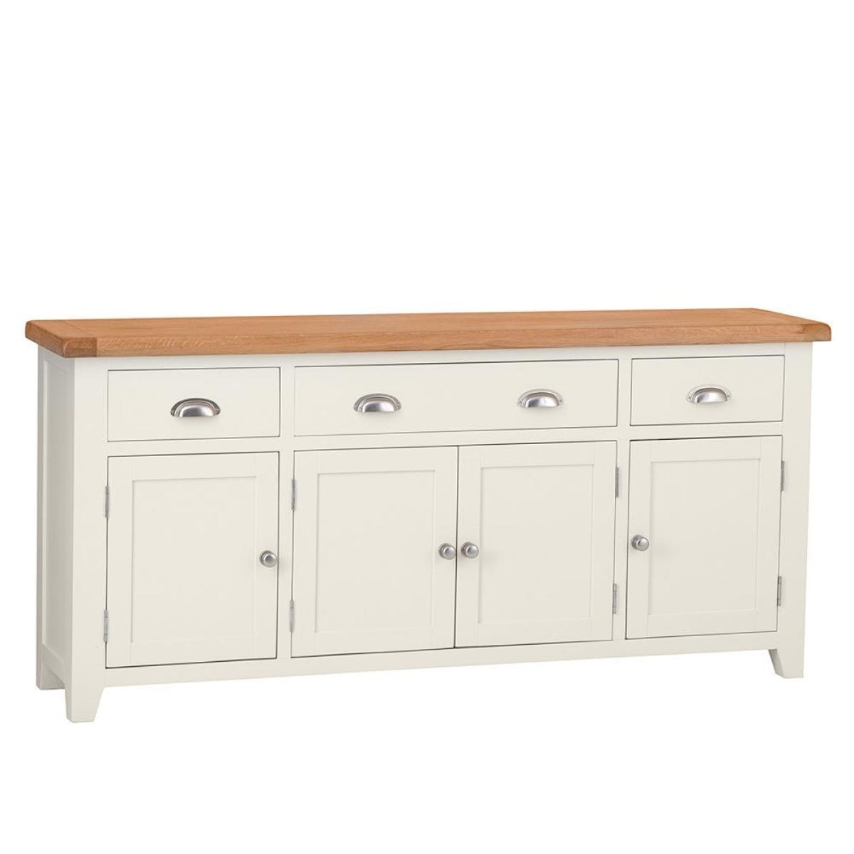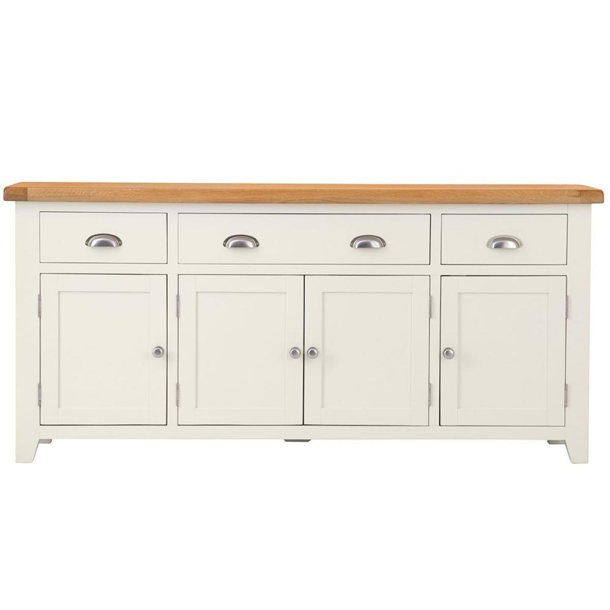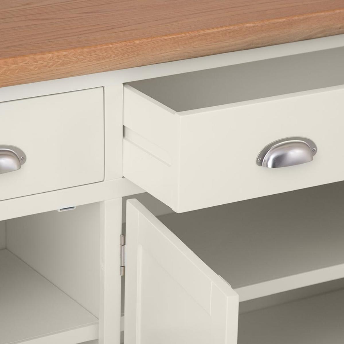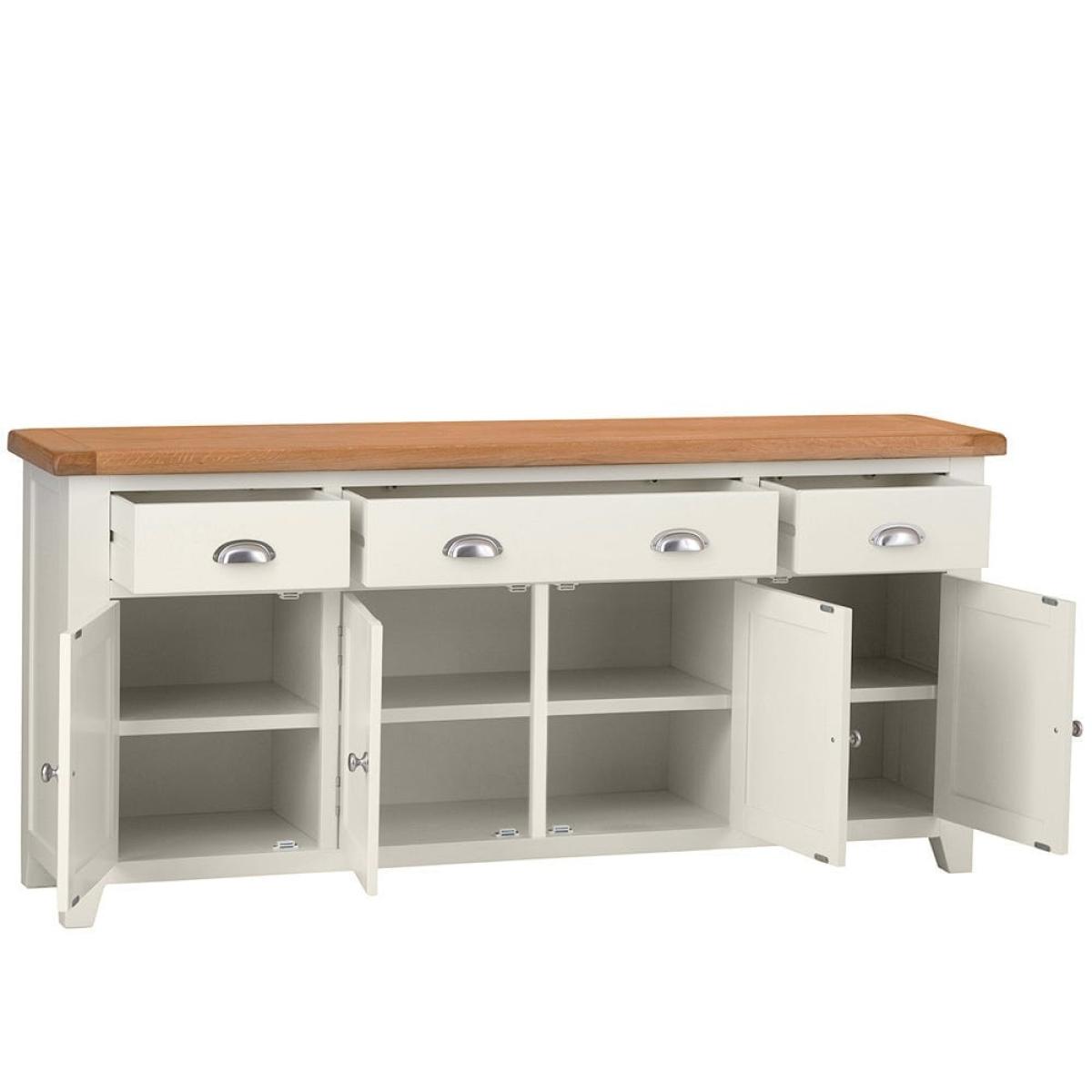This Hampshire ivory painted oak 4-door extra large sideboard delivers on both space and style. The natural oak top is ideal for serving up food and stacking plates, and the cupboards, each containing a pair of shelves, have plenty of room for crockery and dishes. Three spacious drawers can hold table linens, placemats and cutlery, and feature eye-catching chrome cup handles for easy opening. Finished in our sophisticated ivory, this versatile piece also makes an ideal all-purpose storage unit in any space. Keep it in the living room for games and books, or in a bedroom for clothes and accessories.