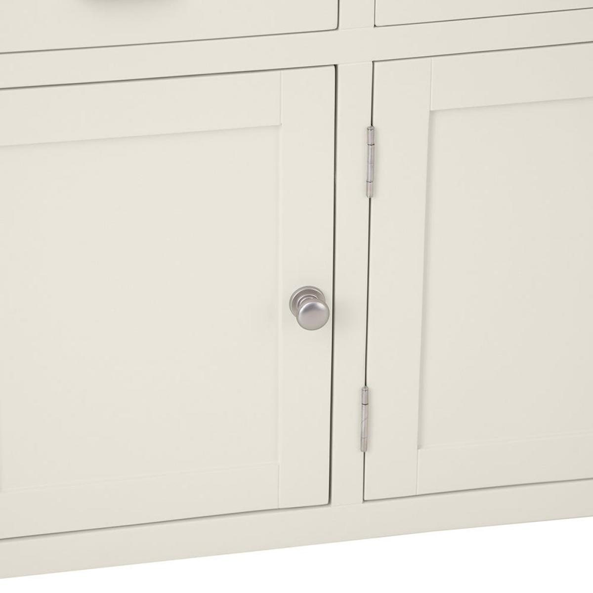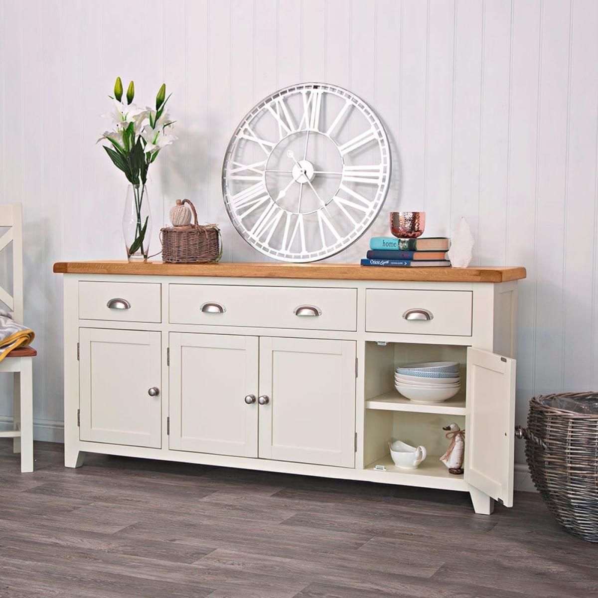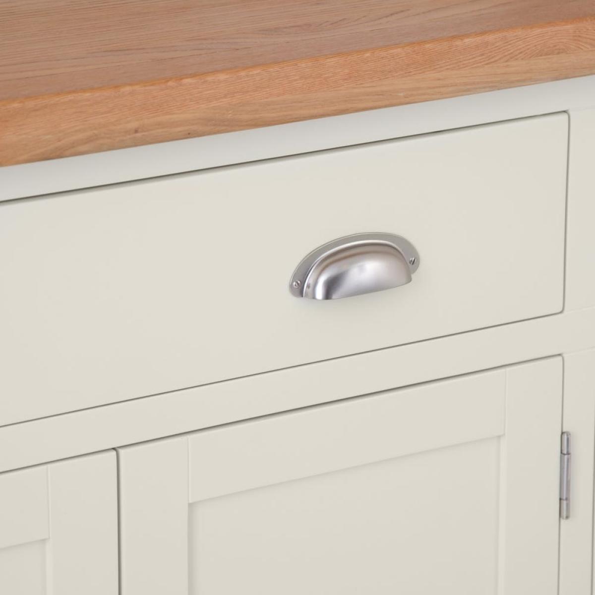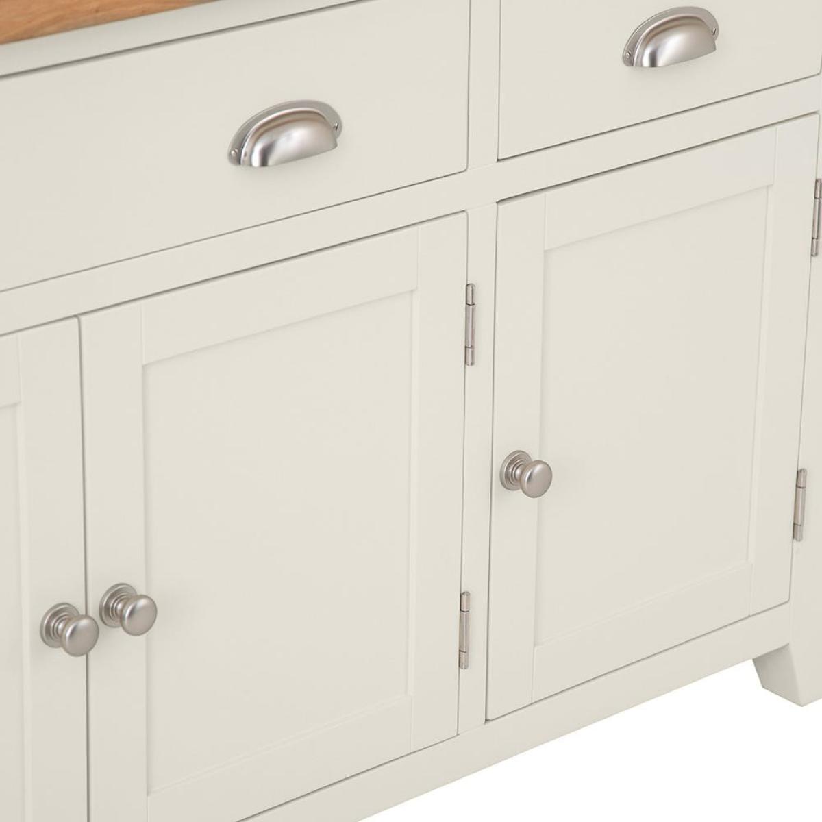 This Hampshire ivory painted oak 4-door extra large sideboard delivers on both space and style. The natural oak top is ideal for serving up food and stacking plates, and the cupboards, each containing a pair of shelves, have plenty of room for crockery and dishes. Three spacious drawers can hold table linens, placemats and cutlery, and feature eye-catching chrome cup handles for easy opening. Finished in our sophisticated ivory, this versatile piece also makes an ideal all-purpose storage unit in any space. Keep it in the living room for games and books, or in a bedroom for clothes and accessories.