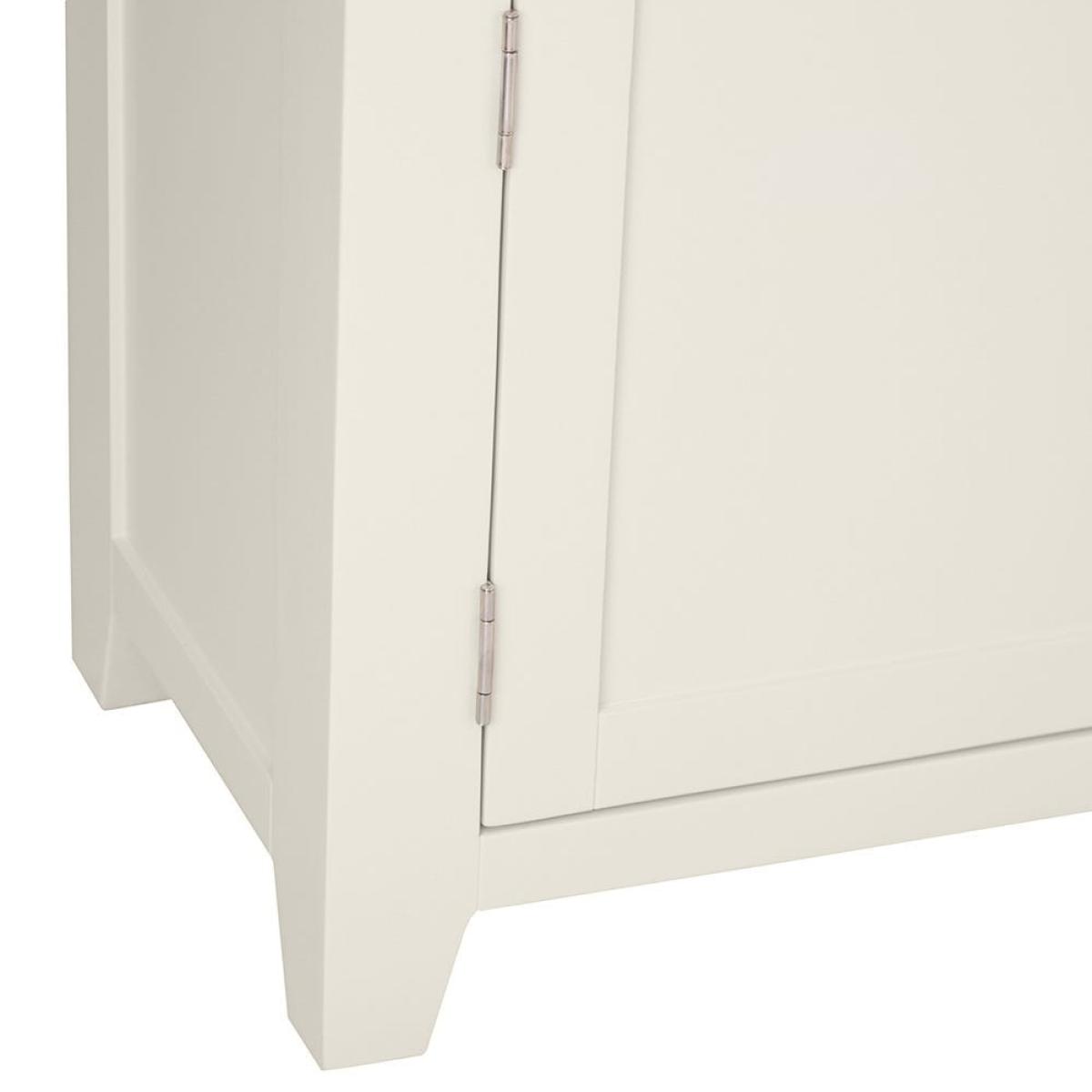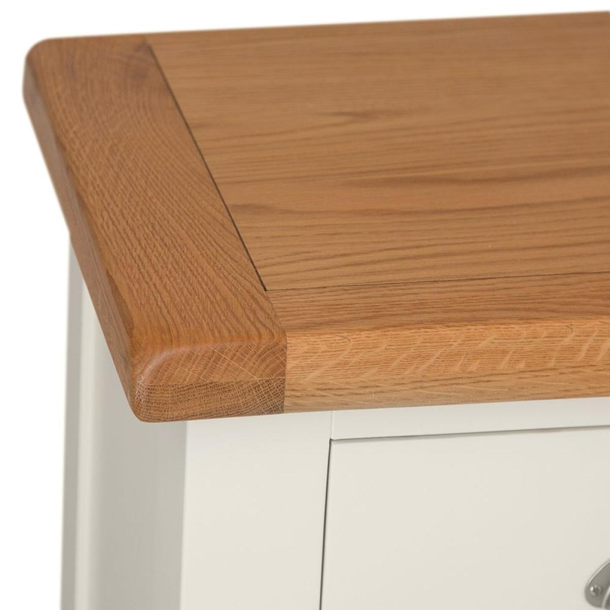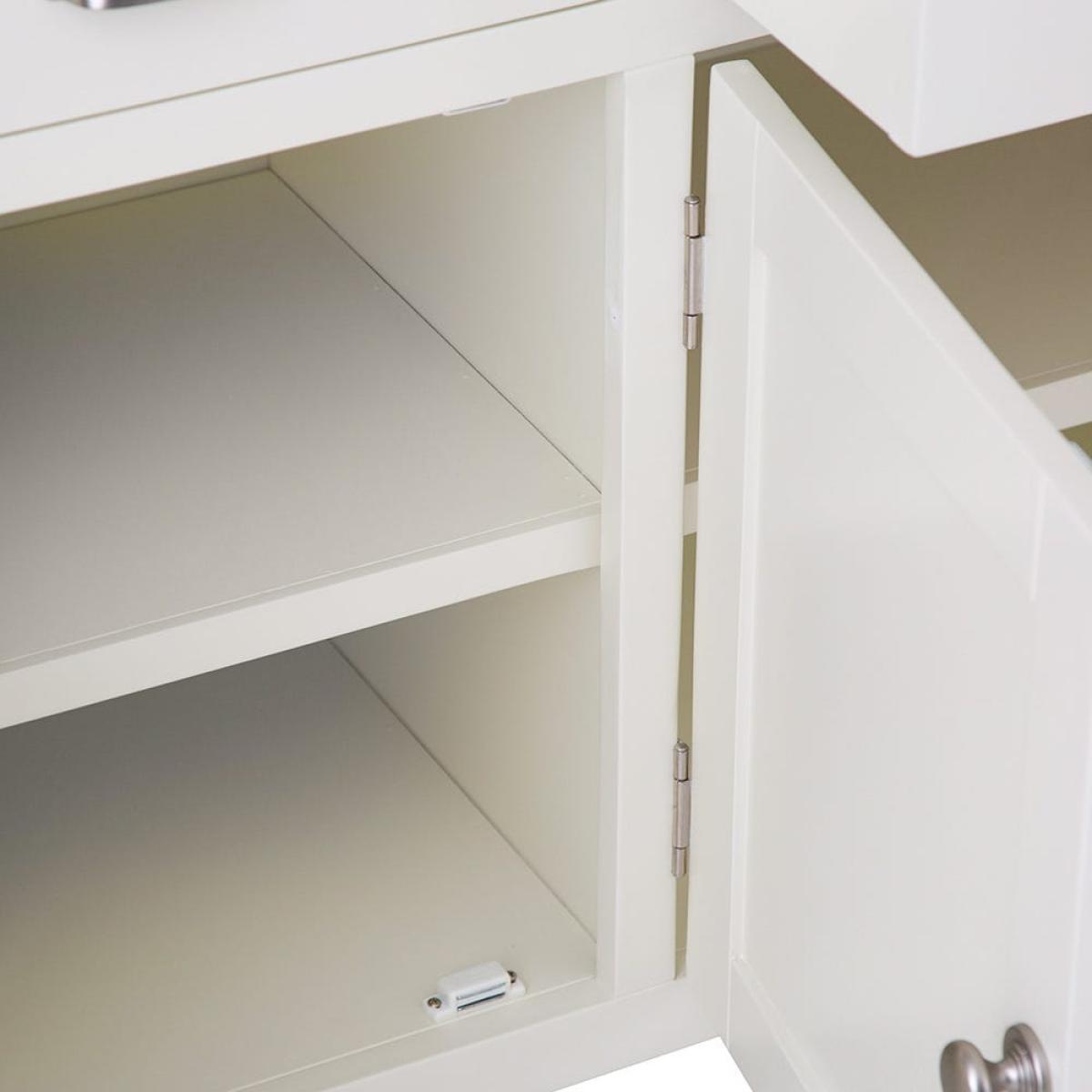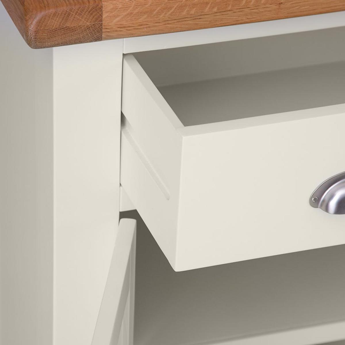 This Hampshire ivory painted oak 4-door extra large sideboard delivers on both space and style. The natural oak top is ideal for serving up food and stacking plates, and the cupboards, each containing a pair of shelves, have plenty of room for crockery and dishes. Three spacious drawers can hold table linens, placemats and cutlery, and feature eye-catching chrome cup handles for easy opening. Finished in our sophisticated ivory, this versatile piece also makes an ideal all-purpose storage unit in any space. Keep it in the living room for games and books, or in a bedroom for clothes and accessories.