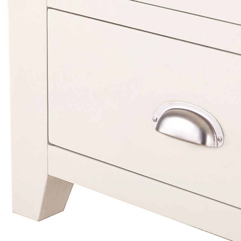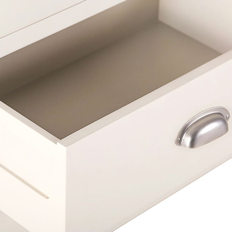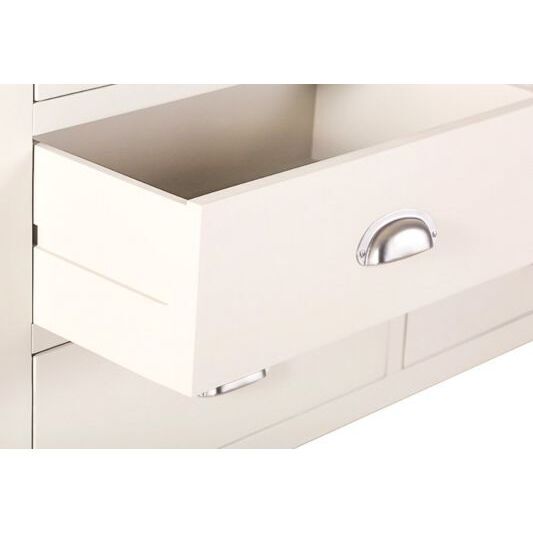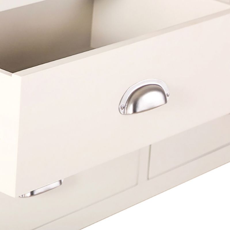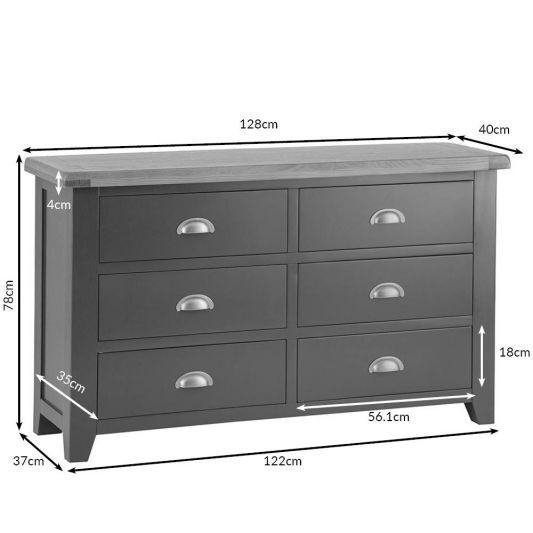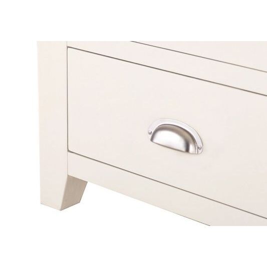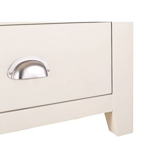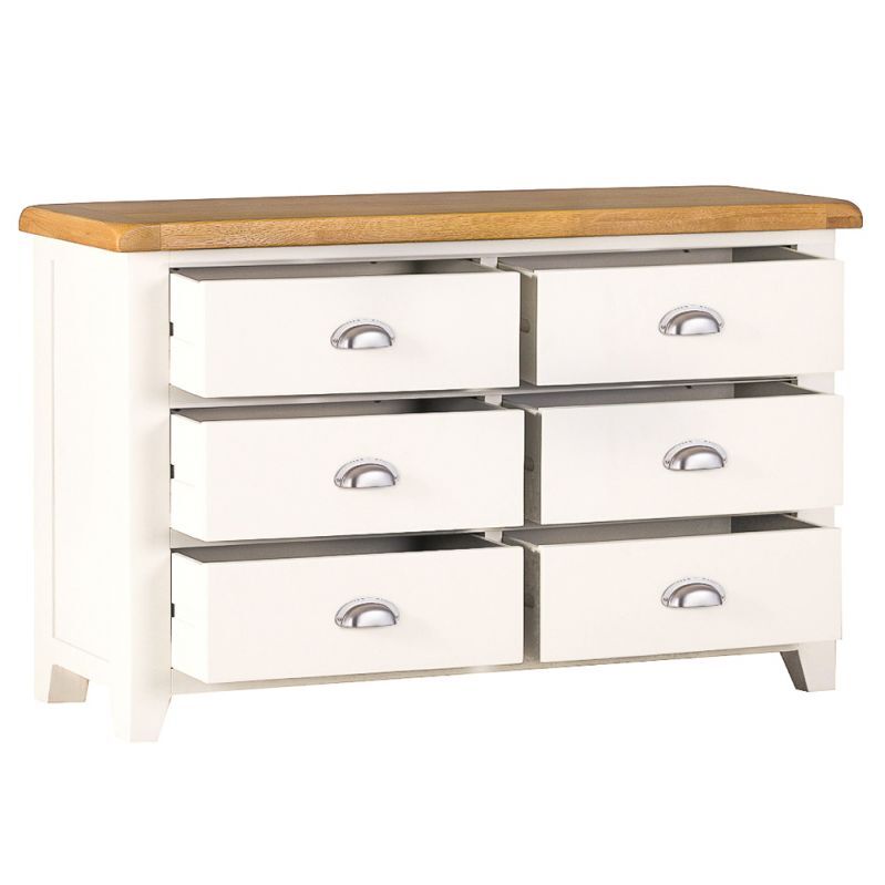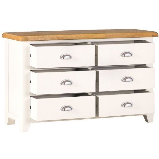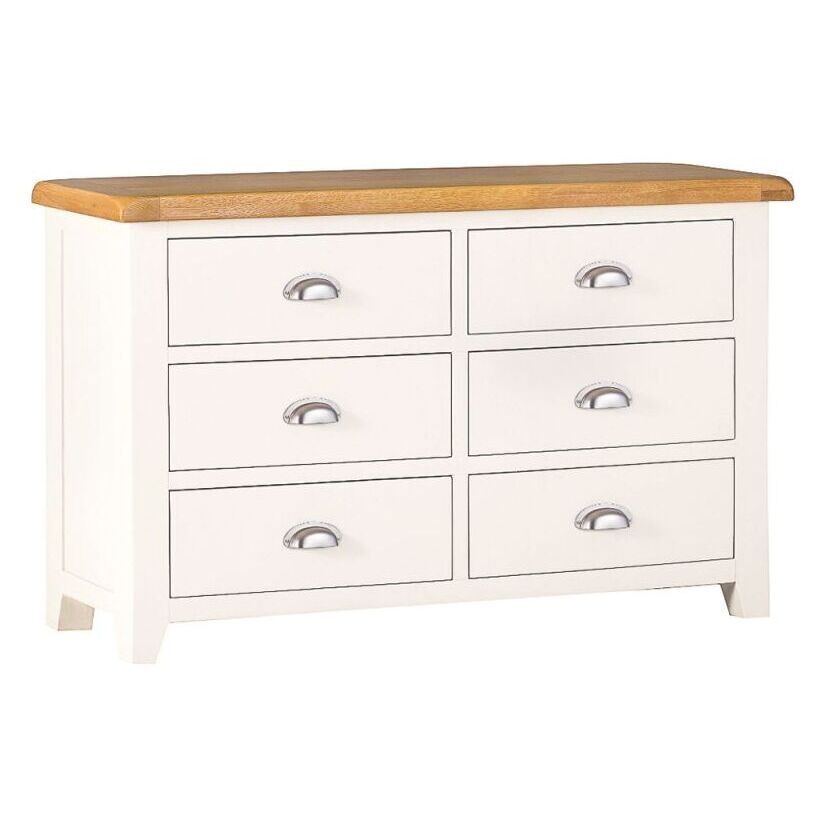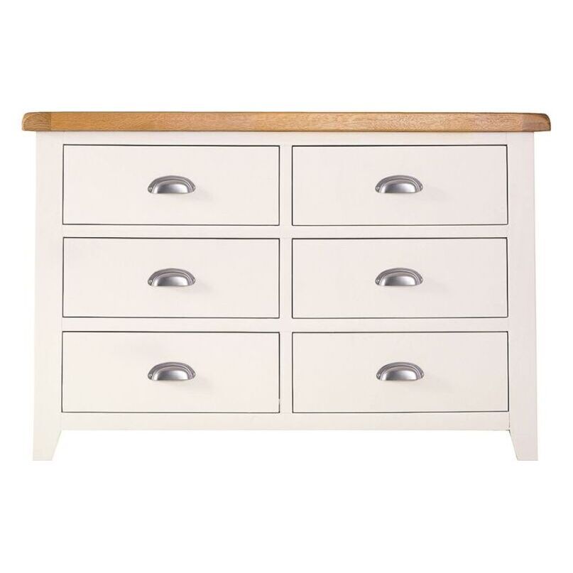 Maximise your use of floor and wall space with the Hampshire Ivory Painted Oak 6 Drawer Chest and you'll be delighted with the results. It's a centrepiece that attracts attention from every angle, and one which definitely adds something special to any bedroom in the house. The drawers are dovetailed and finished with cupped metal handles, whilst the thick wooden frame is brought to life by the ivory painted finish. For a look that will endure for years to come we've added one of our signature chunky oak tops to really showcase your new Chest of Drawers.